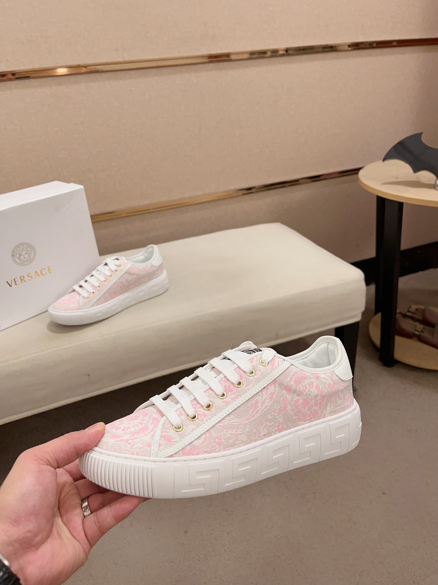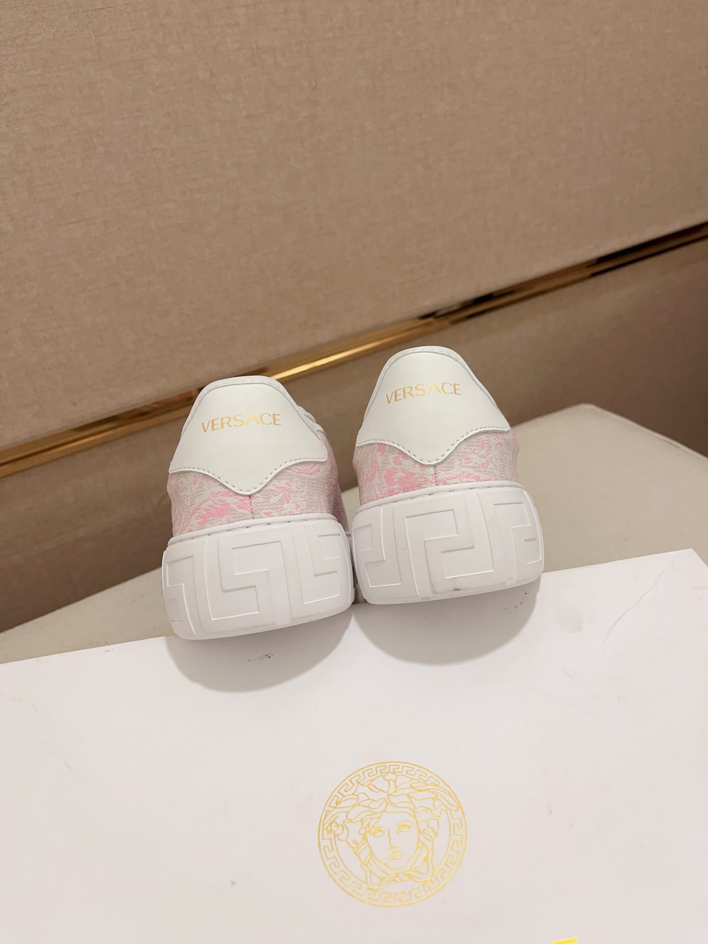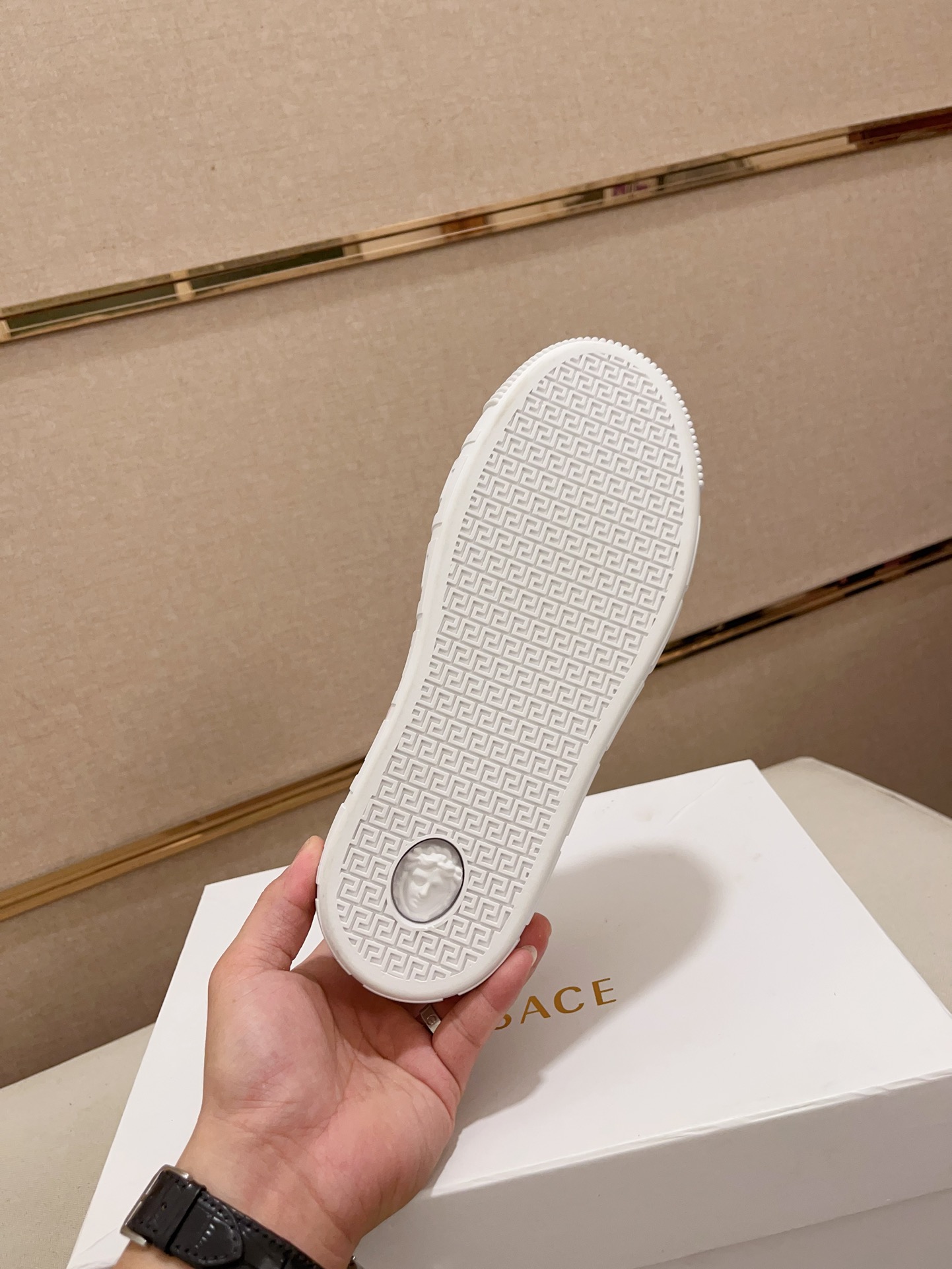 这款鞋子是AAAAA 1:1 质量 (非常棒). 使用了和原版一模一样的材料. 商标部分也保持了和范思哲/Versace一样. 图片拍摄是实物鞋子拍摄, 您所收到的实物保证和我们图片一模一样.