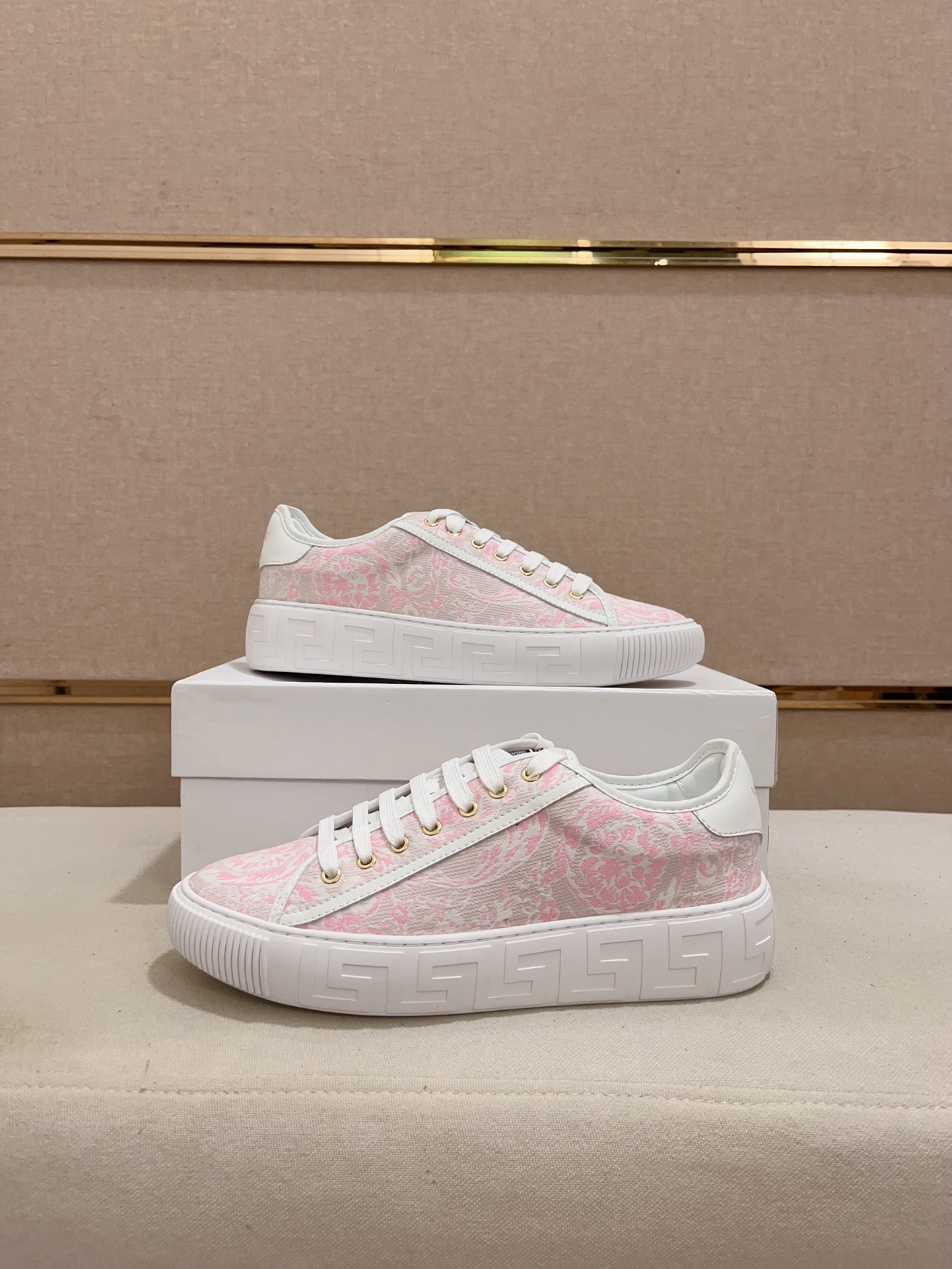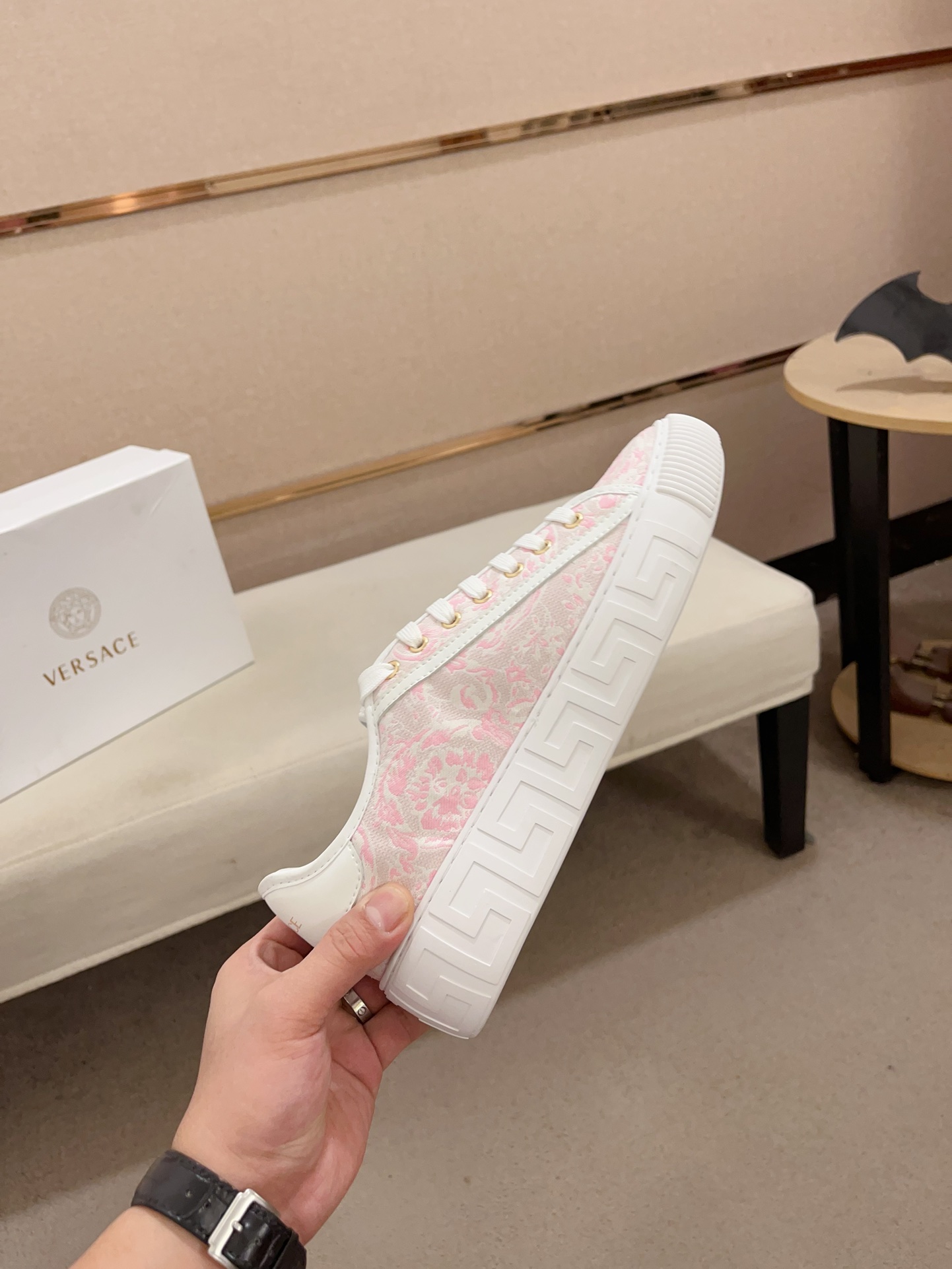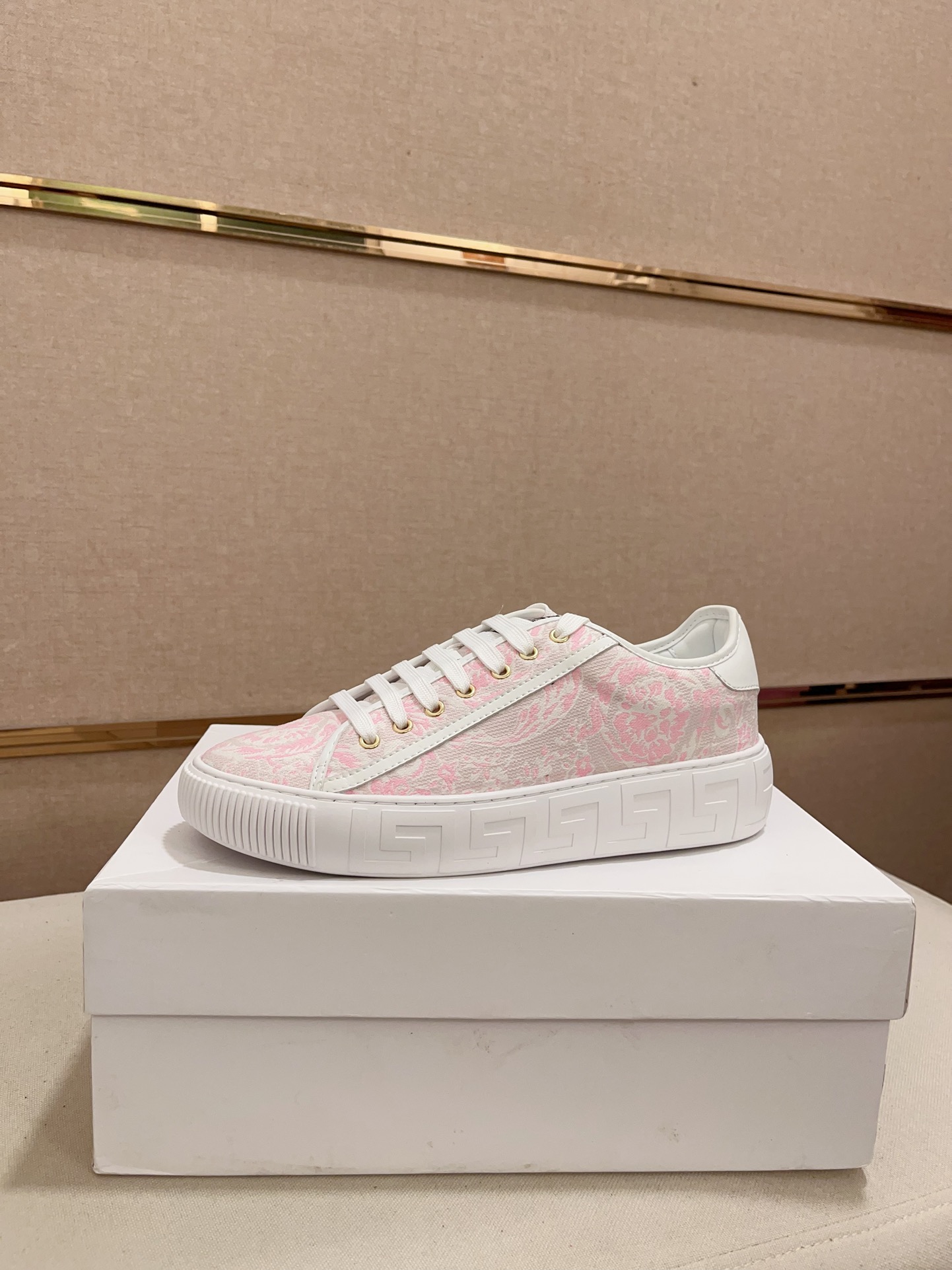 这款鞋子是AAAAA 1:1 质量 (非常棒). 使用了和原版一模一样的材料. 商标部分也保持了和范思哲/Versace一样. 图片拍摄是实物鞋子拍摄, 您所收到的实物保证和我们图片一模一样.