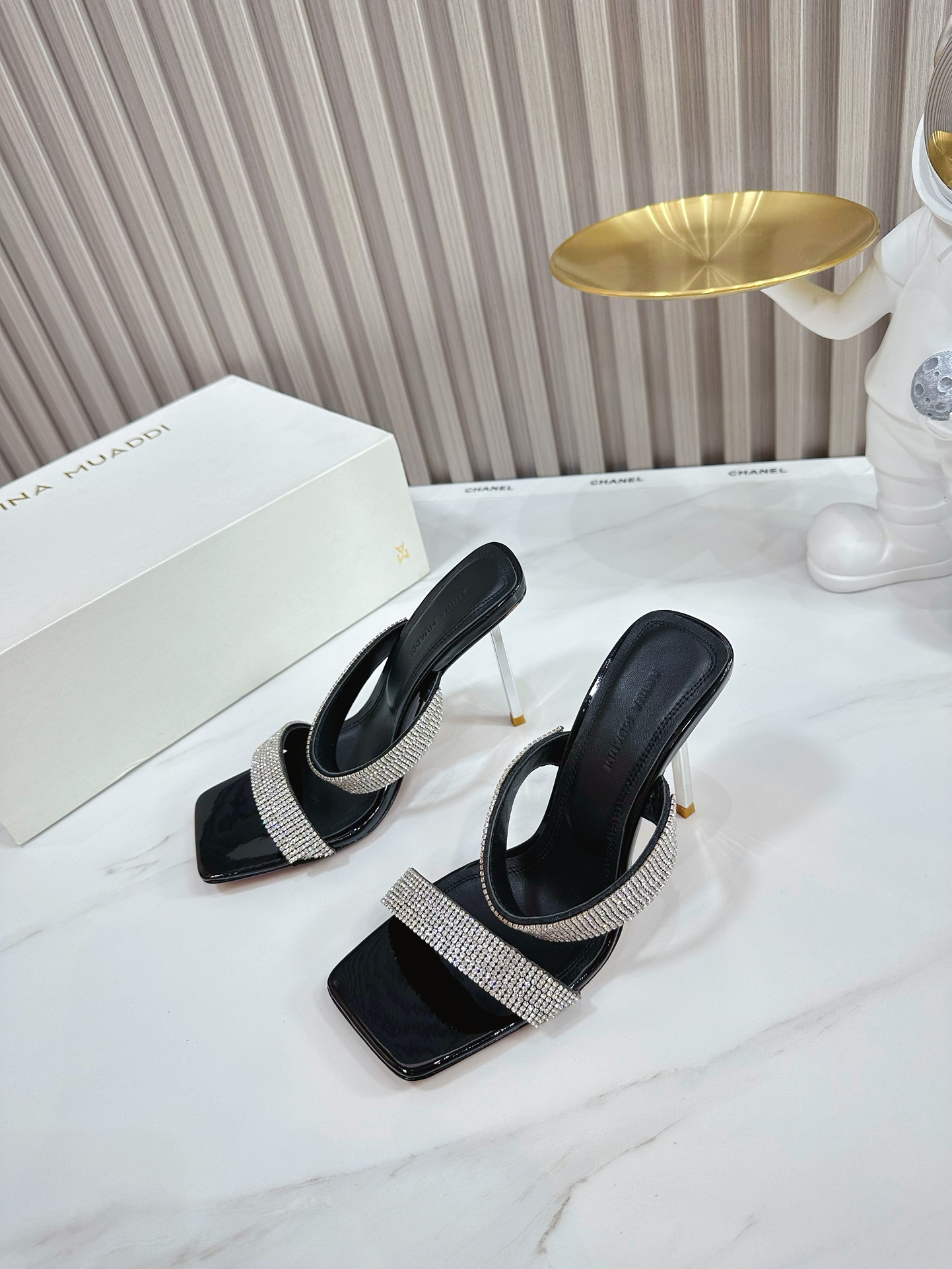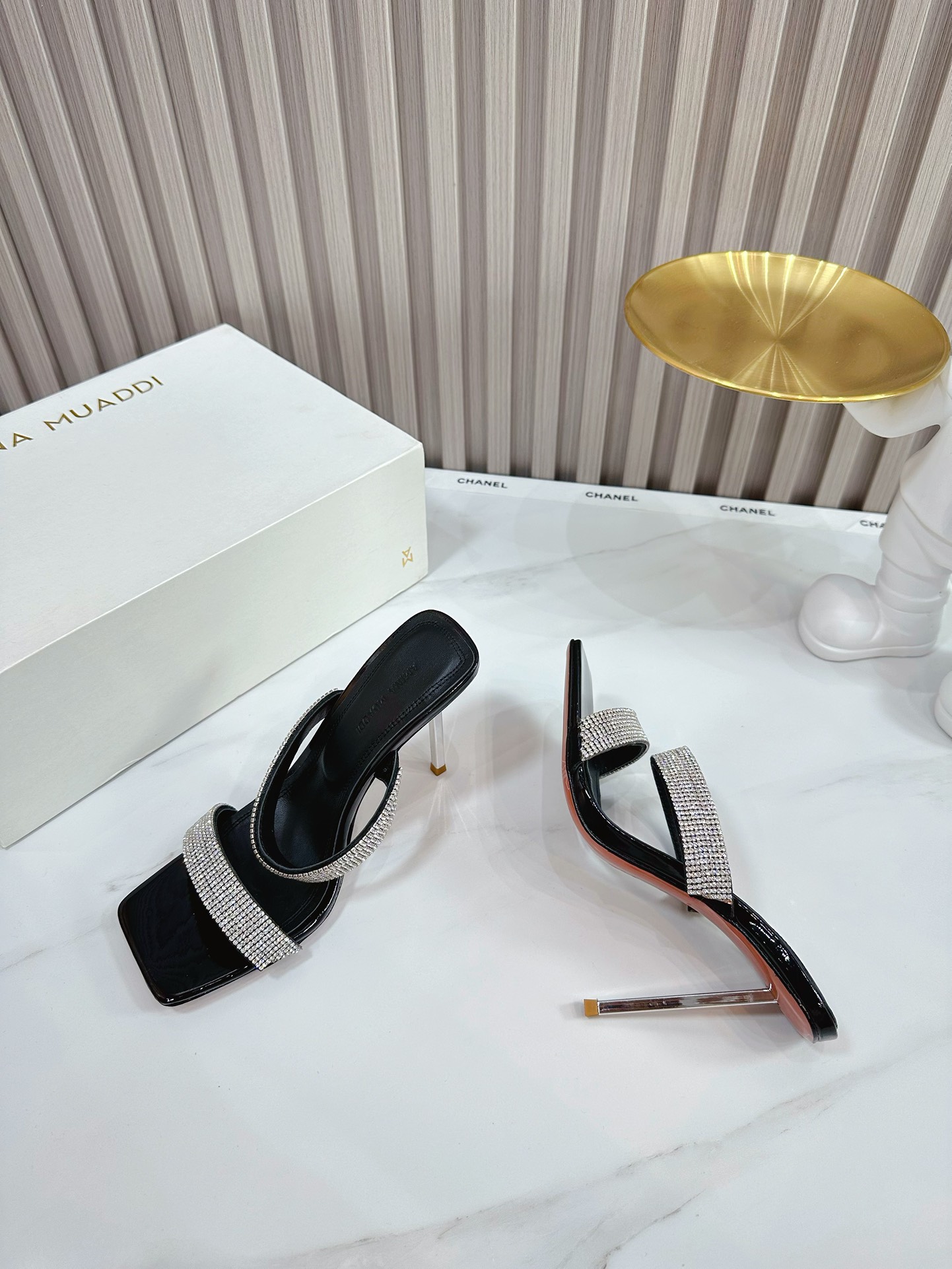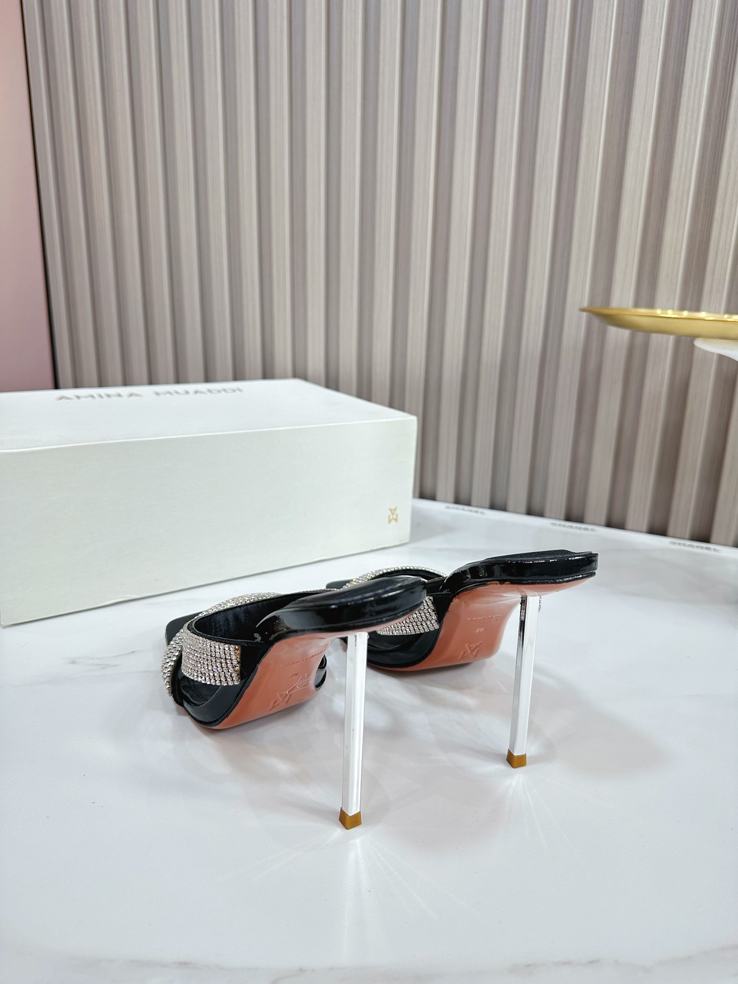 这款鞋子是AAAAA 1:1 质量 (非常棒). 使用了和原版一模一样的材料. 商标部分也保持了和Amina Muaddi一样. 图片拍摄是实物鞋子拍摄, 您所收到的实物保证和我们图片一模一样.
