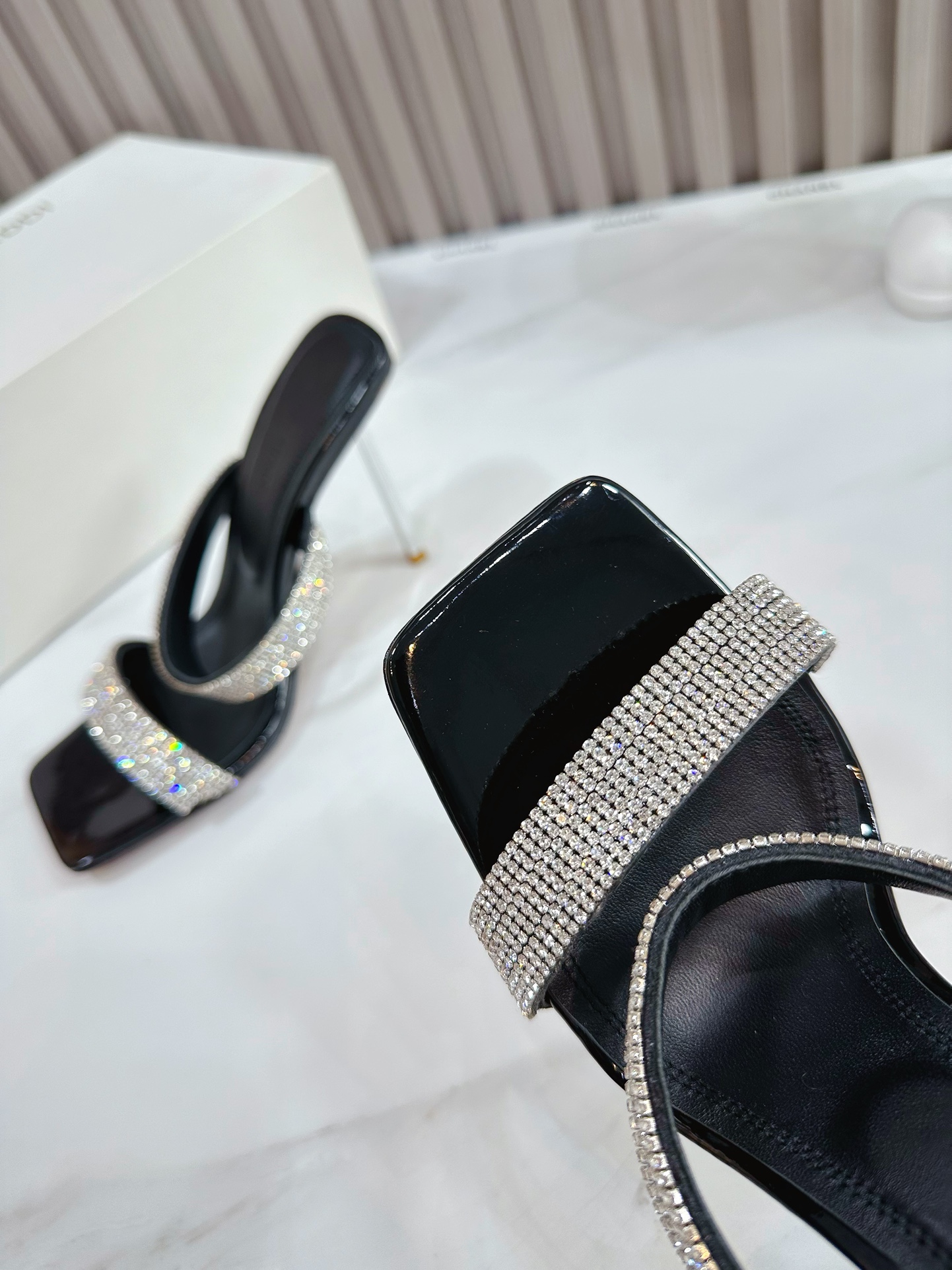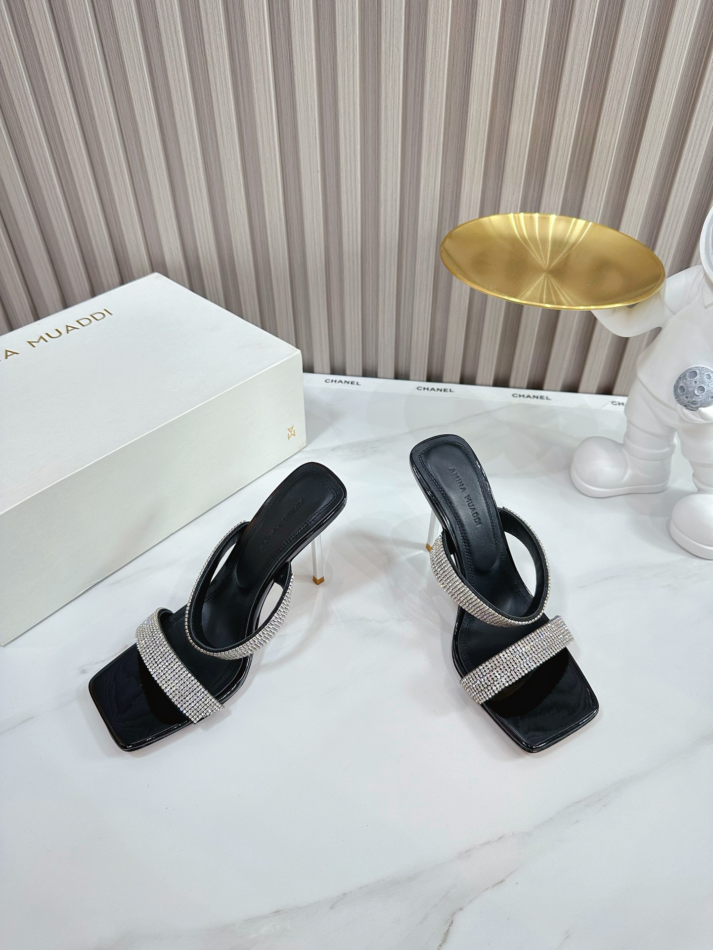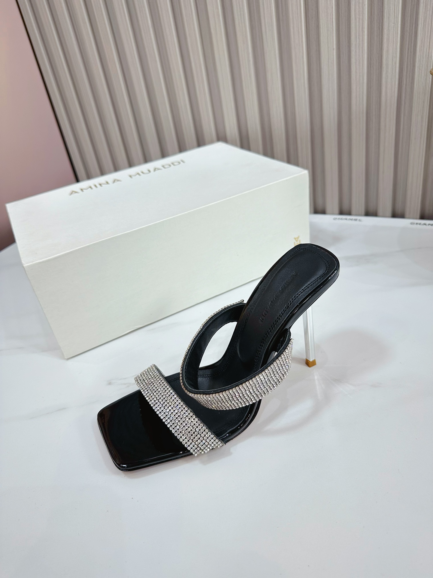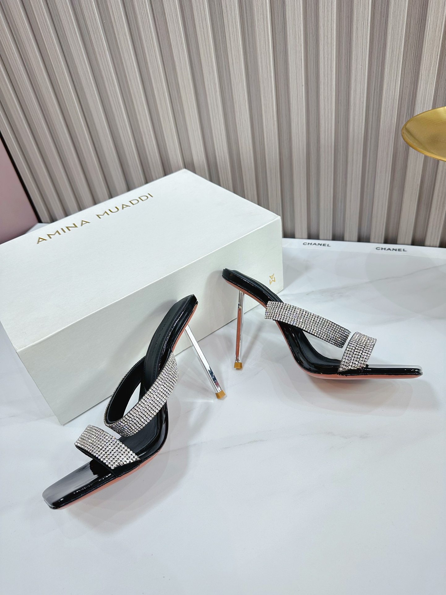 这款鞋子是AAAAA 1:1 质量 (非常棒). 使用了和原版一模一样的材料. 商标部分也保持了和Amina Muaddi一样. 图片拍摄是实物鞋子拍摄, 您所收到的实物保证和我们图片一模一样.