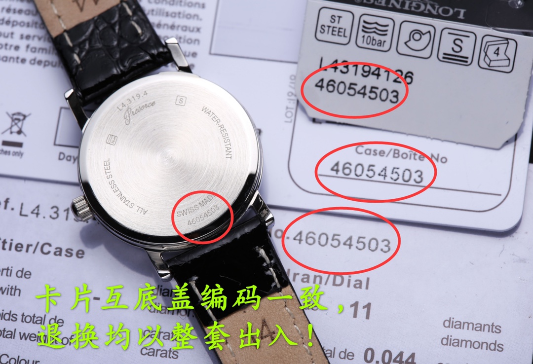这款手表是AAAAA 1:1 质量 (非常棒). 使用了和原版一模一样的材料. 商标部分也保持了和浪琴/Longines一样. 图片拍摄是实物手表拍摄, 您所收到的实物保证和我们图片一模一样.