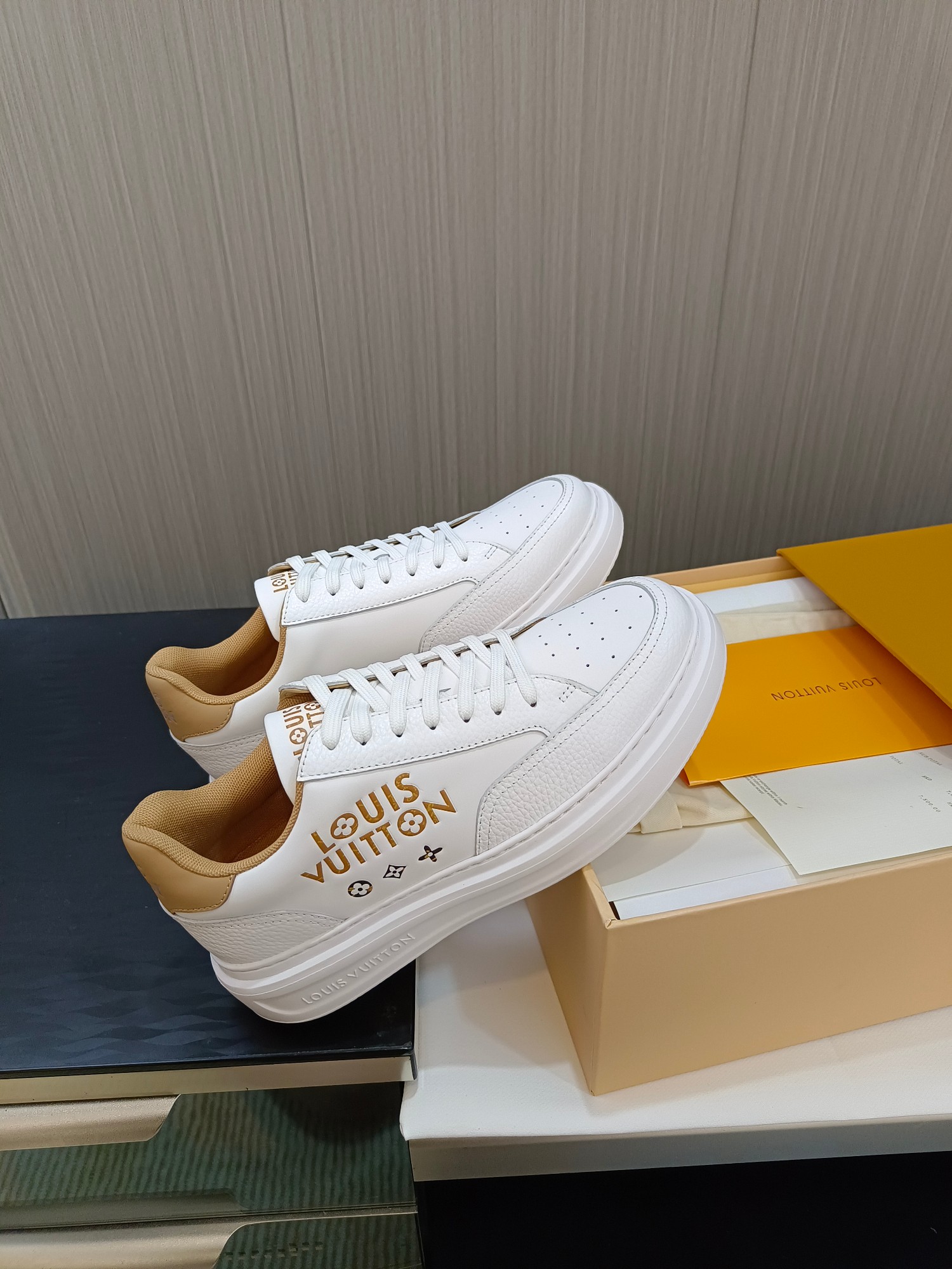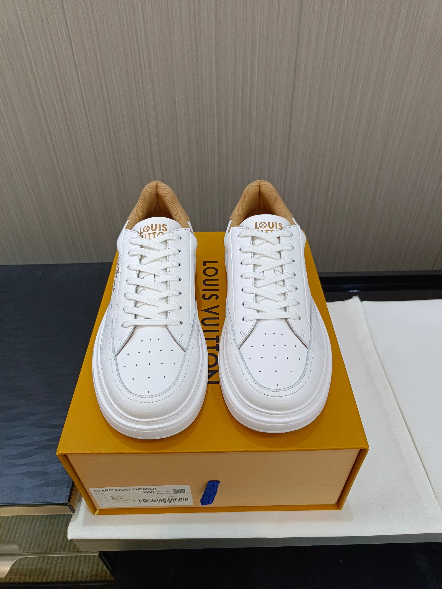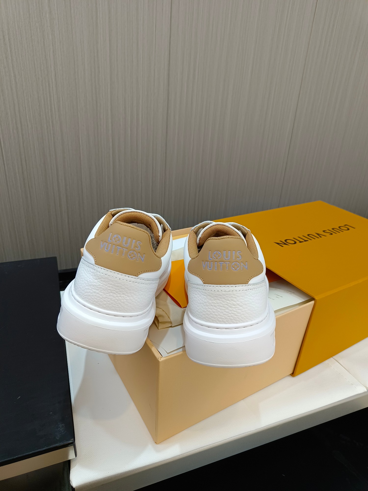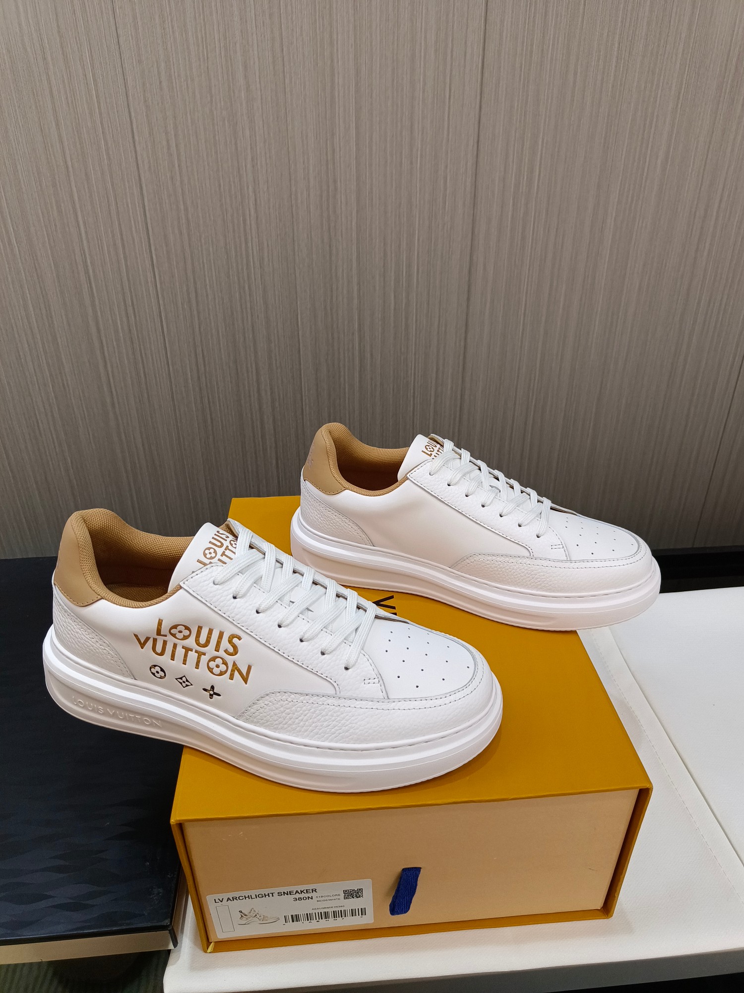 这款鞋子是AAAAA 1:1 质量 (非常棒). 使用了和原版一模一样的材料. 商标部分也保持了和路易威登/Louis Vuitton一样. 图片拍摄是实物鞋子拍摄, 您所收到的实物保证和我们图片一模一样.
