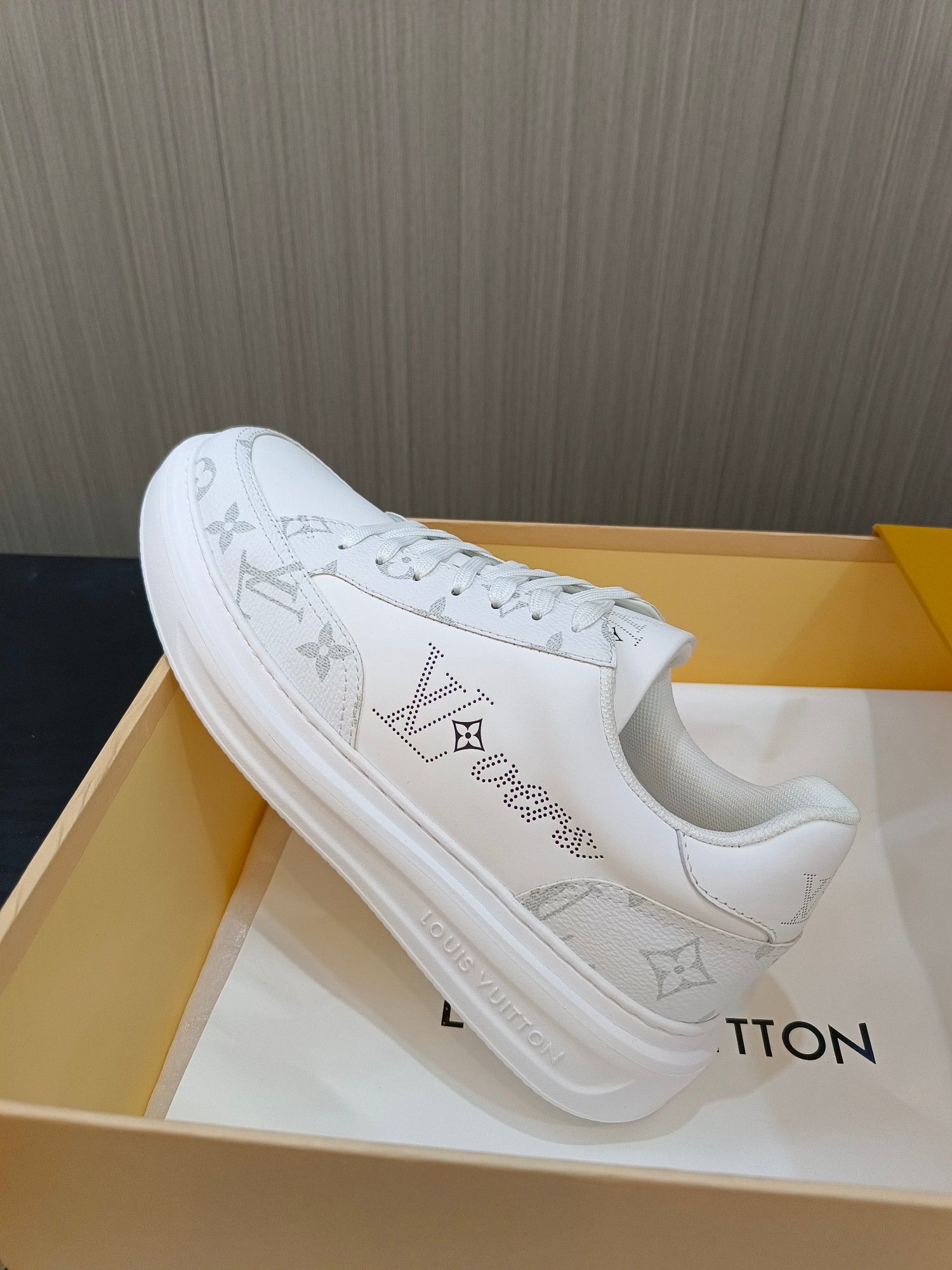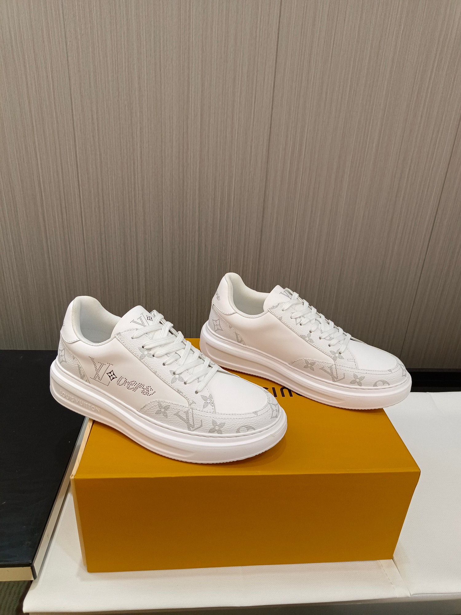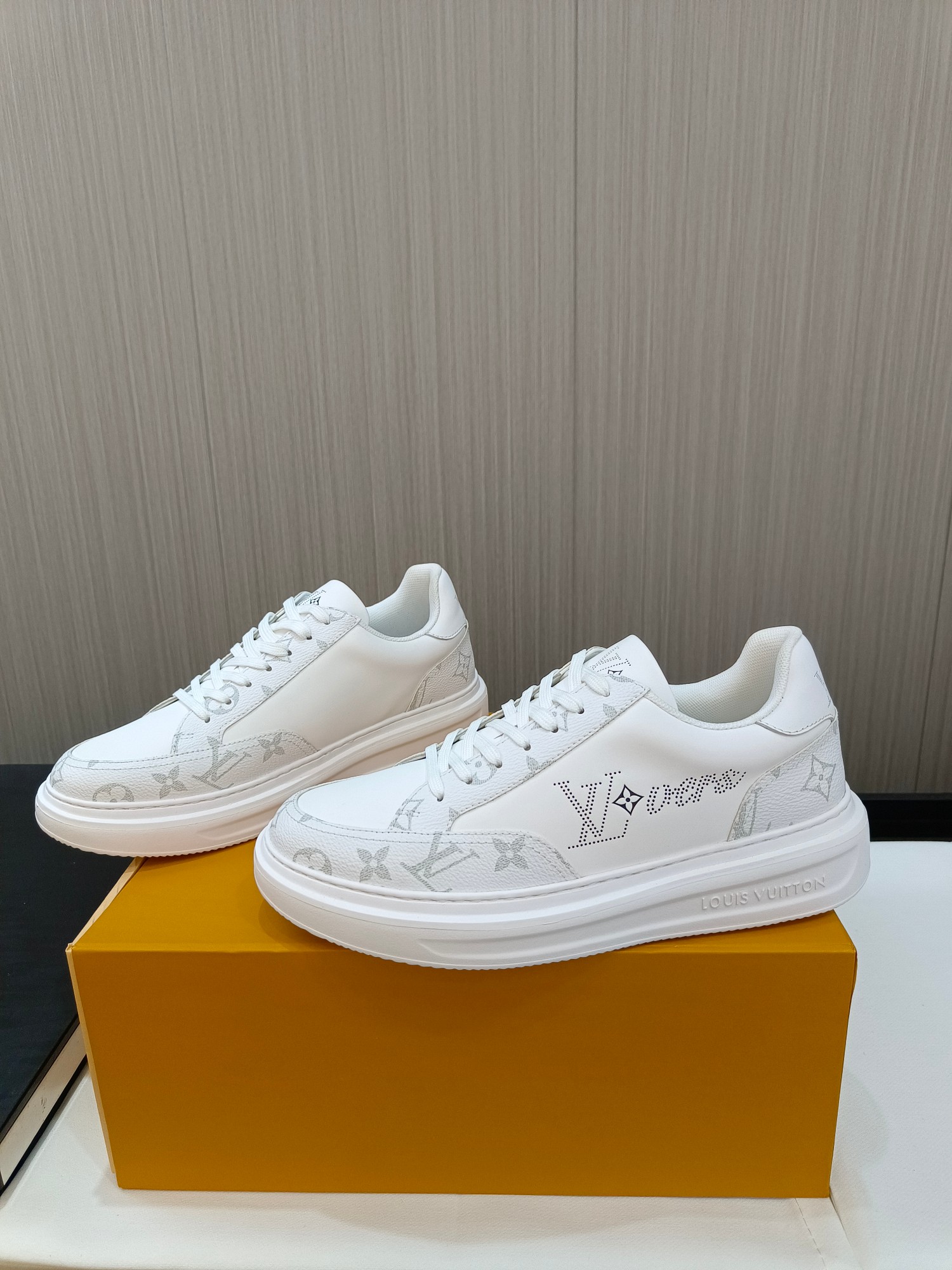 这款鞋子是AAAAA 1:1 质量 (非常棒). 使用了和原版一模一样的材料. 商标部分也保持了和路易威登/Louis Vuitton一样. 图片拍摄是实物鞋子拍摄, 您所收到的实物保证和我们图片一模一样.