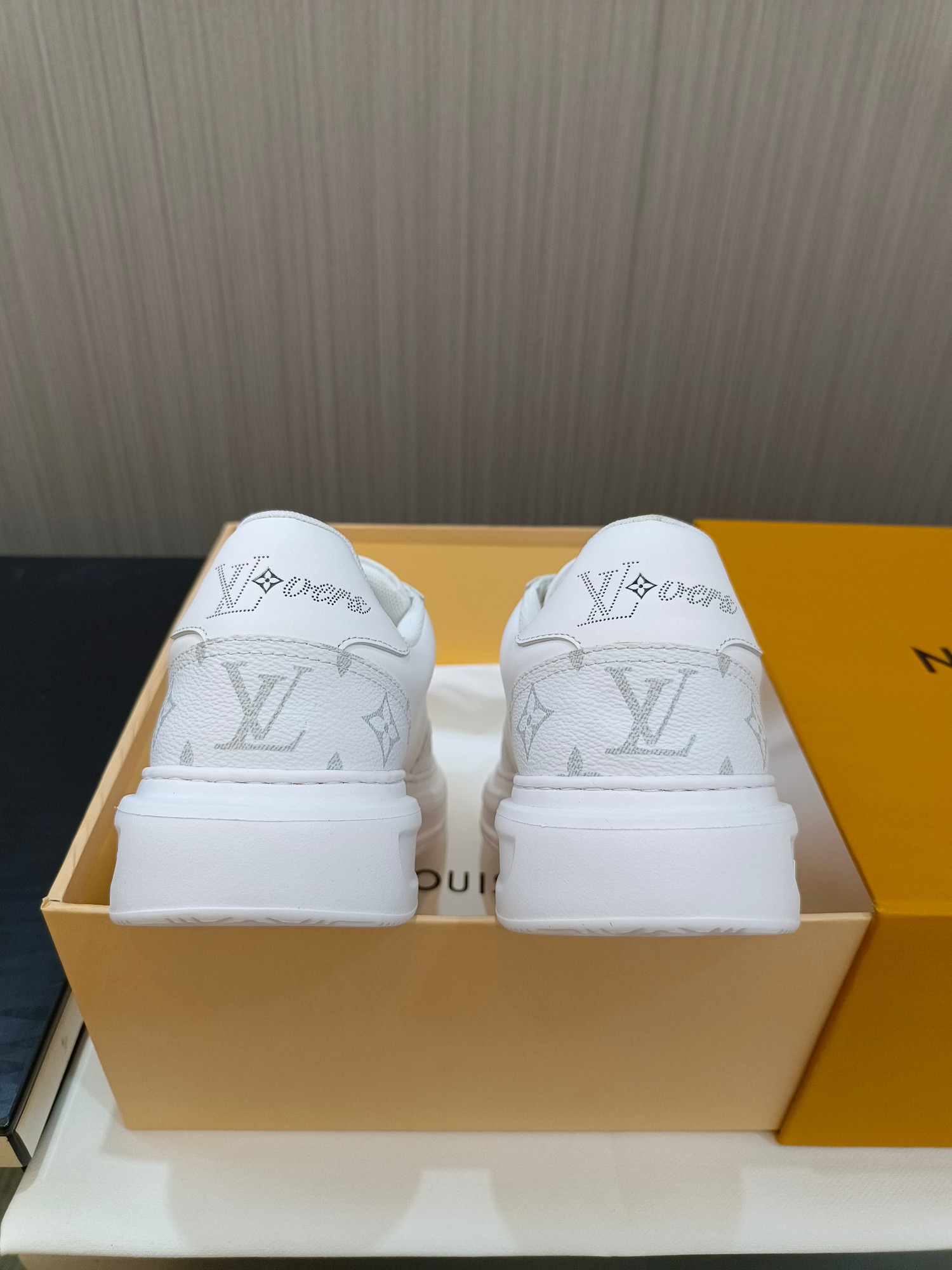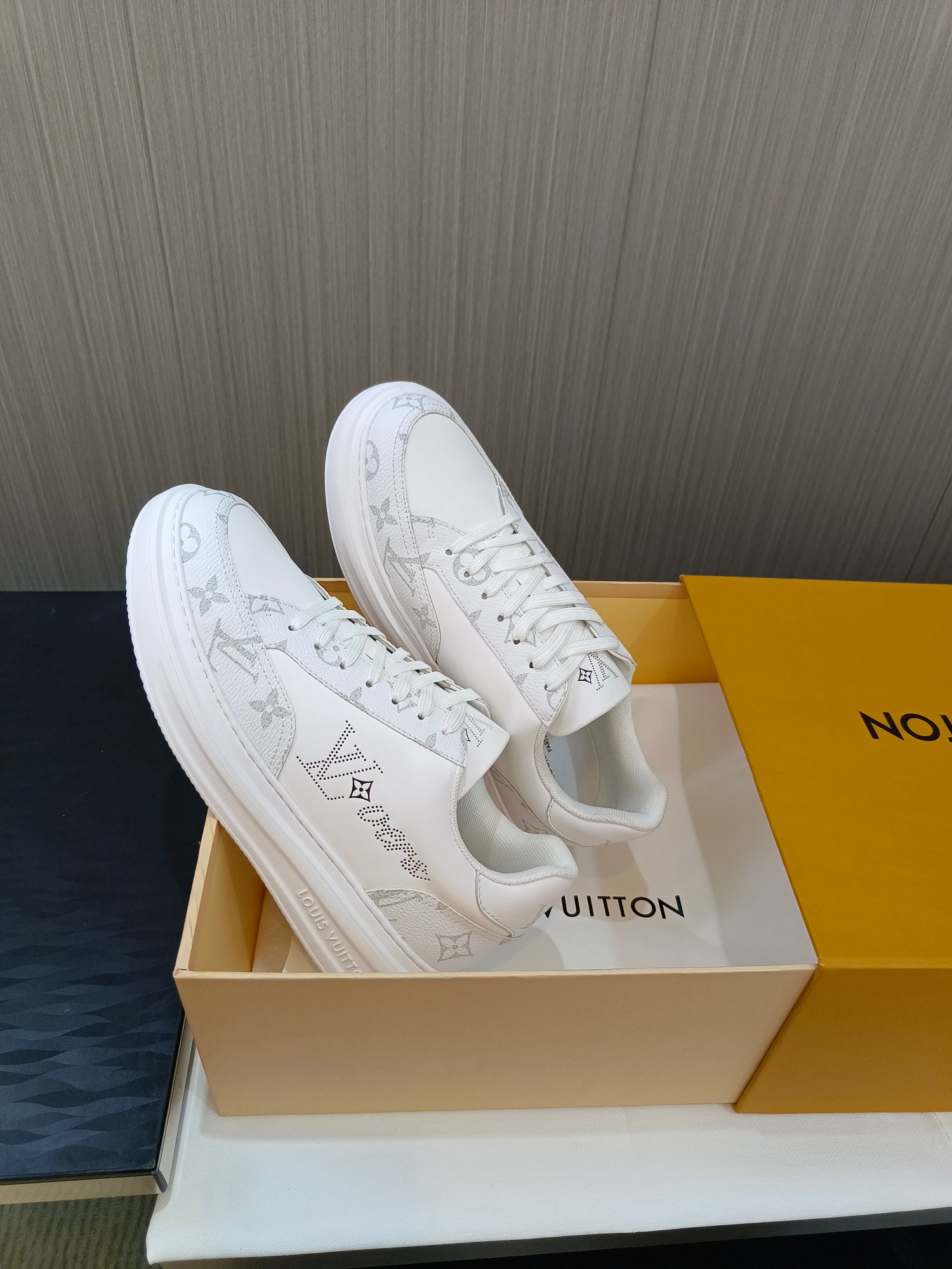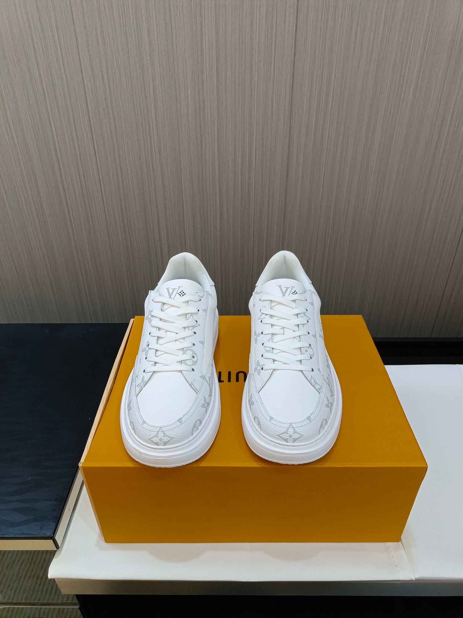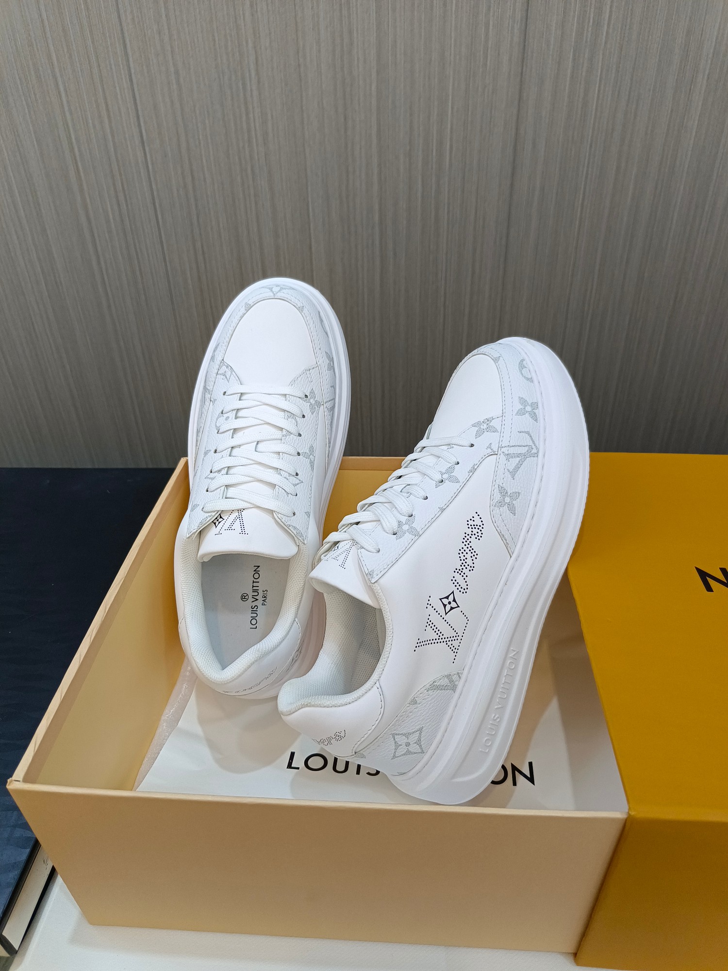 这款鞋子是AAAAA 1:1 质量 (非常棒). 使用了和原版一模一样的材料. 商标部分也保持了和路易威登/Louis Vuitton一样. 图片拍摄是实物鞋子拍摄, 您所收到的实物保证和我们图片一模一样.