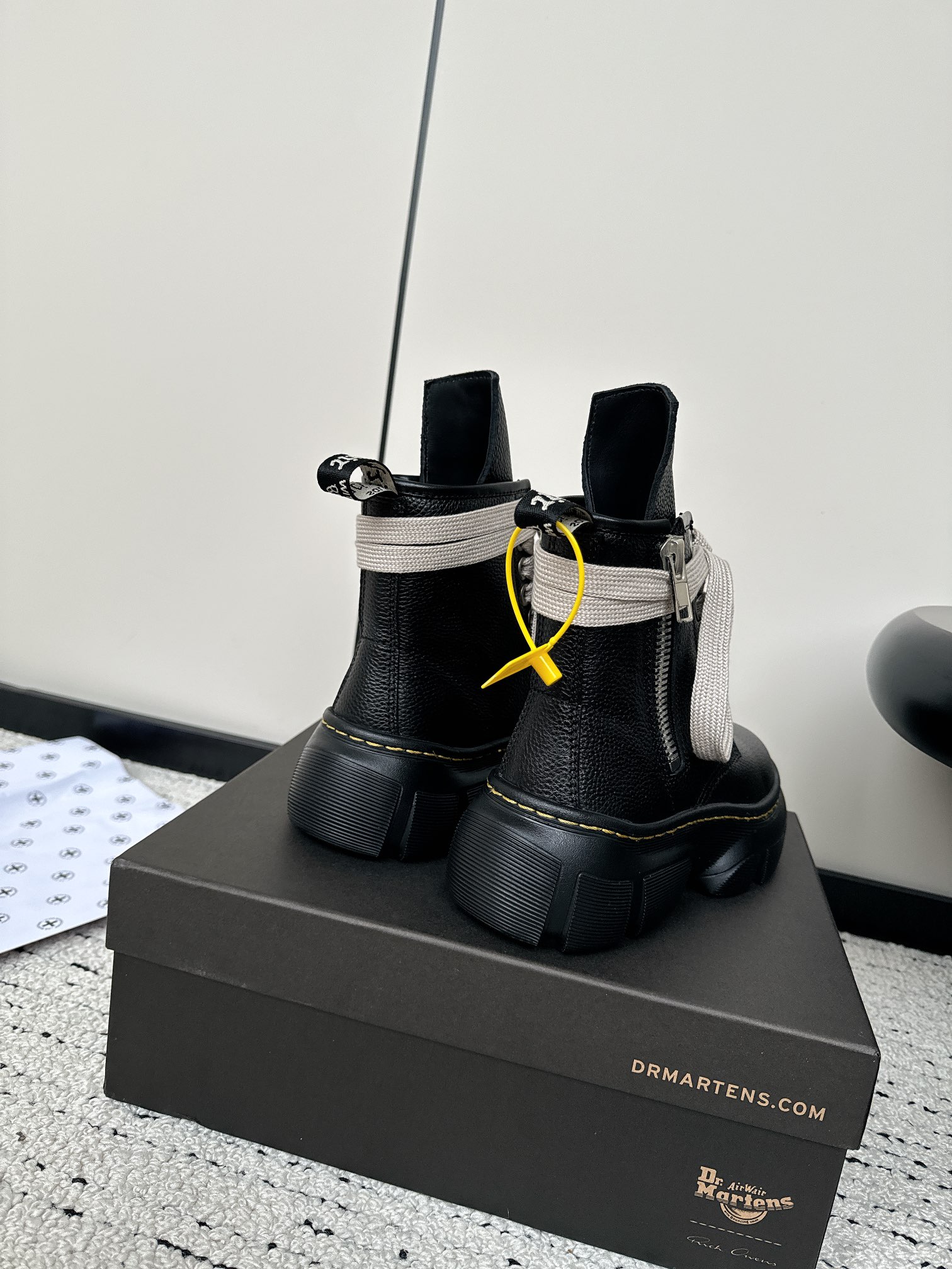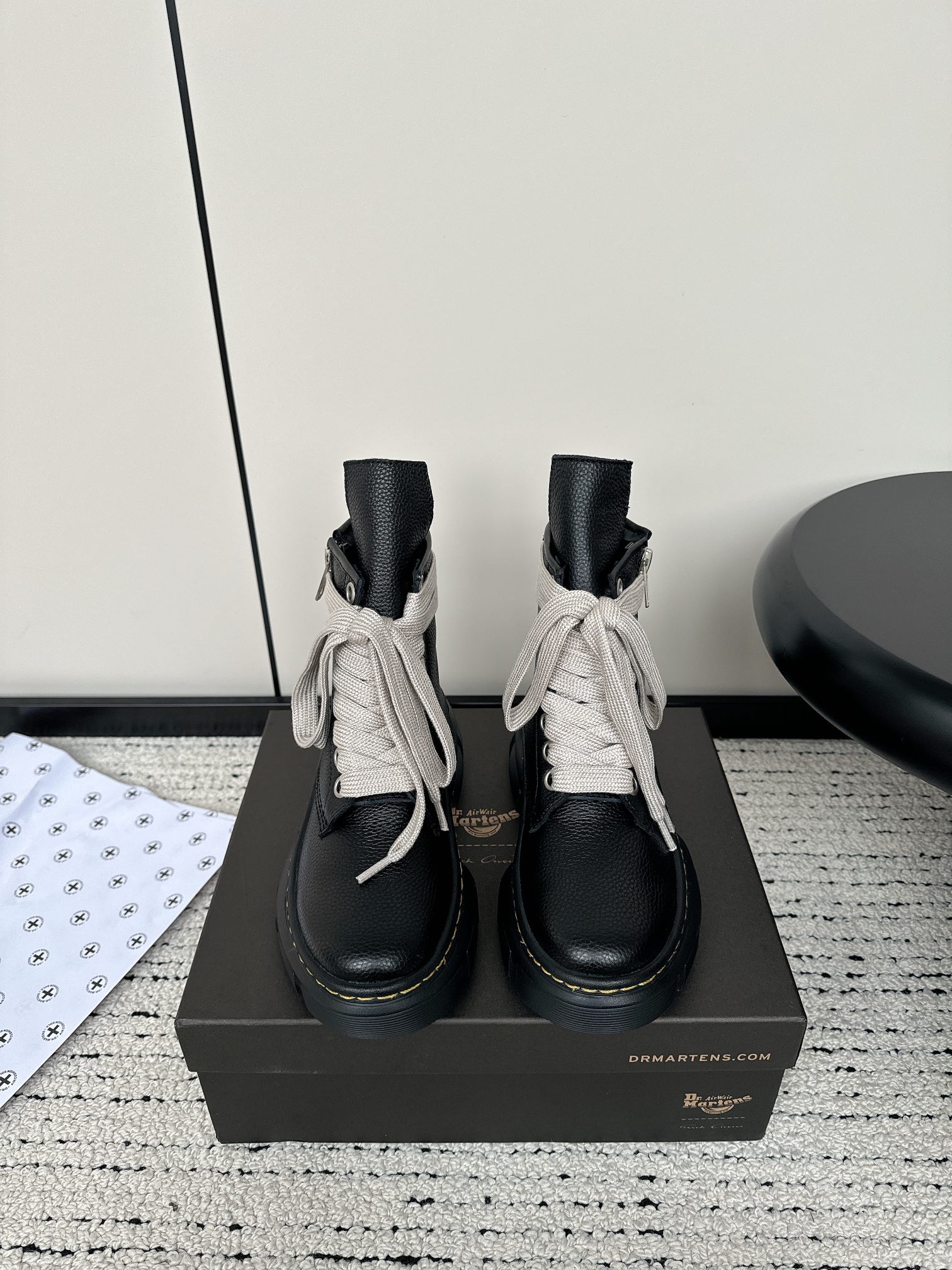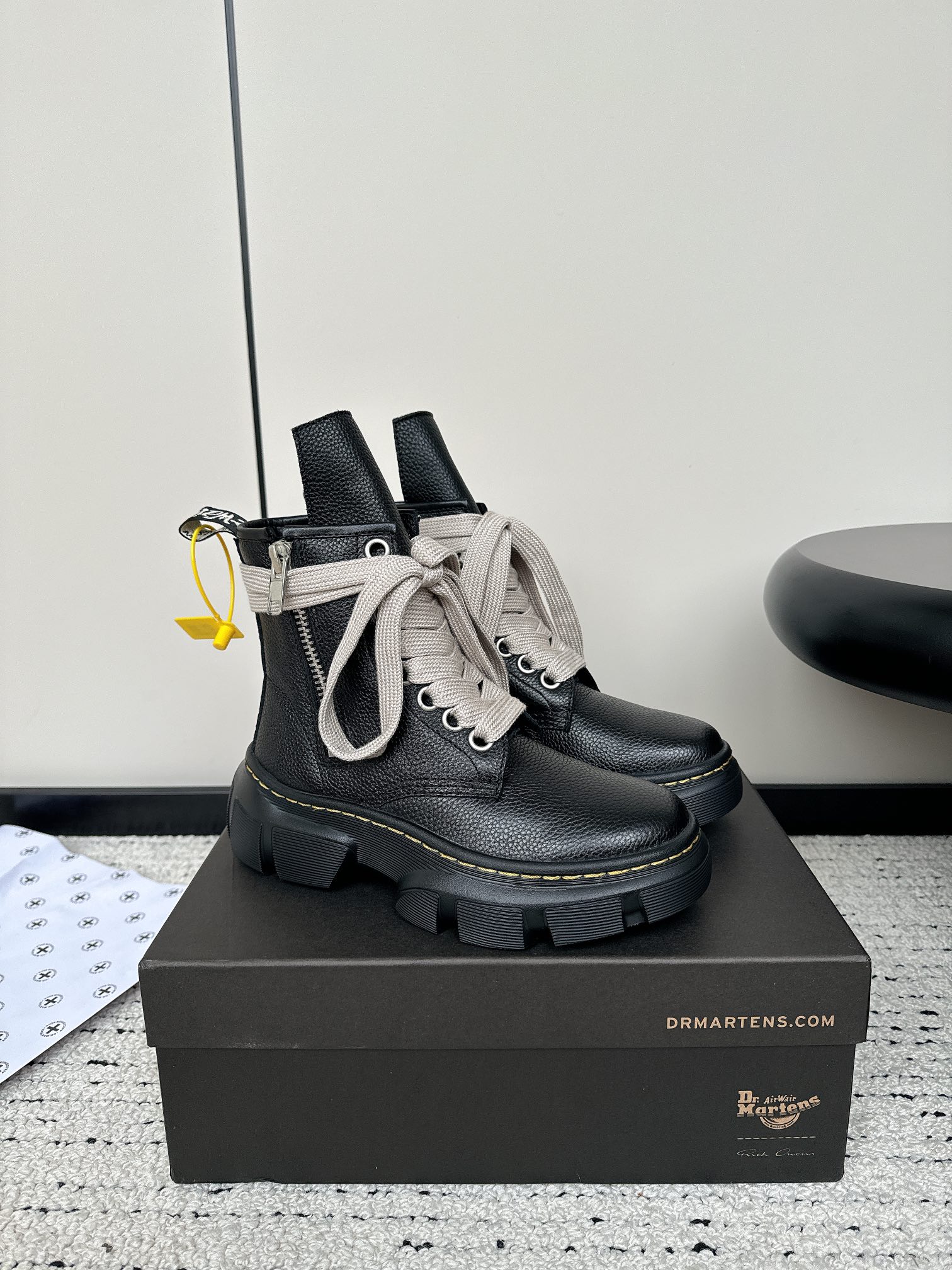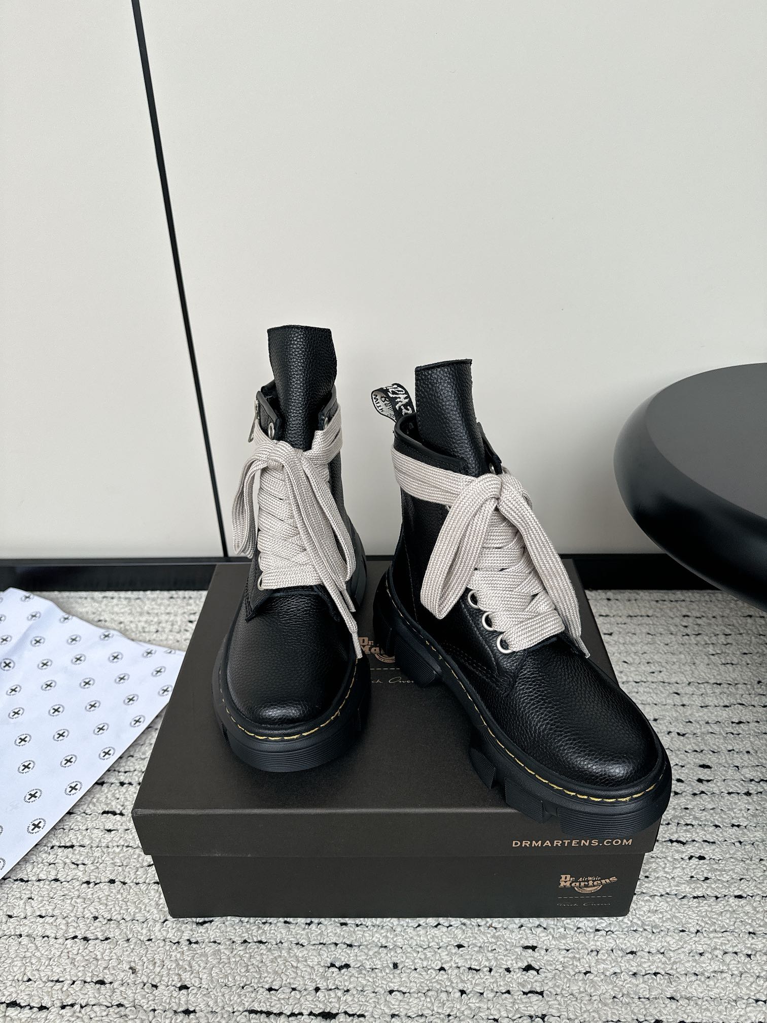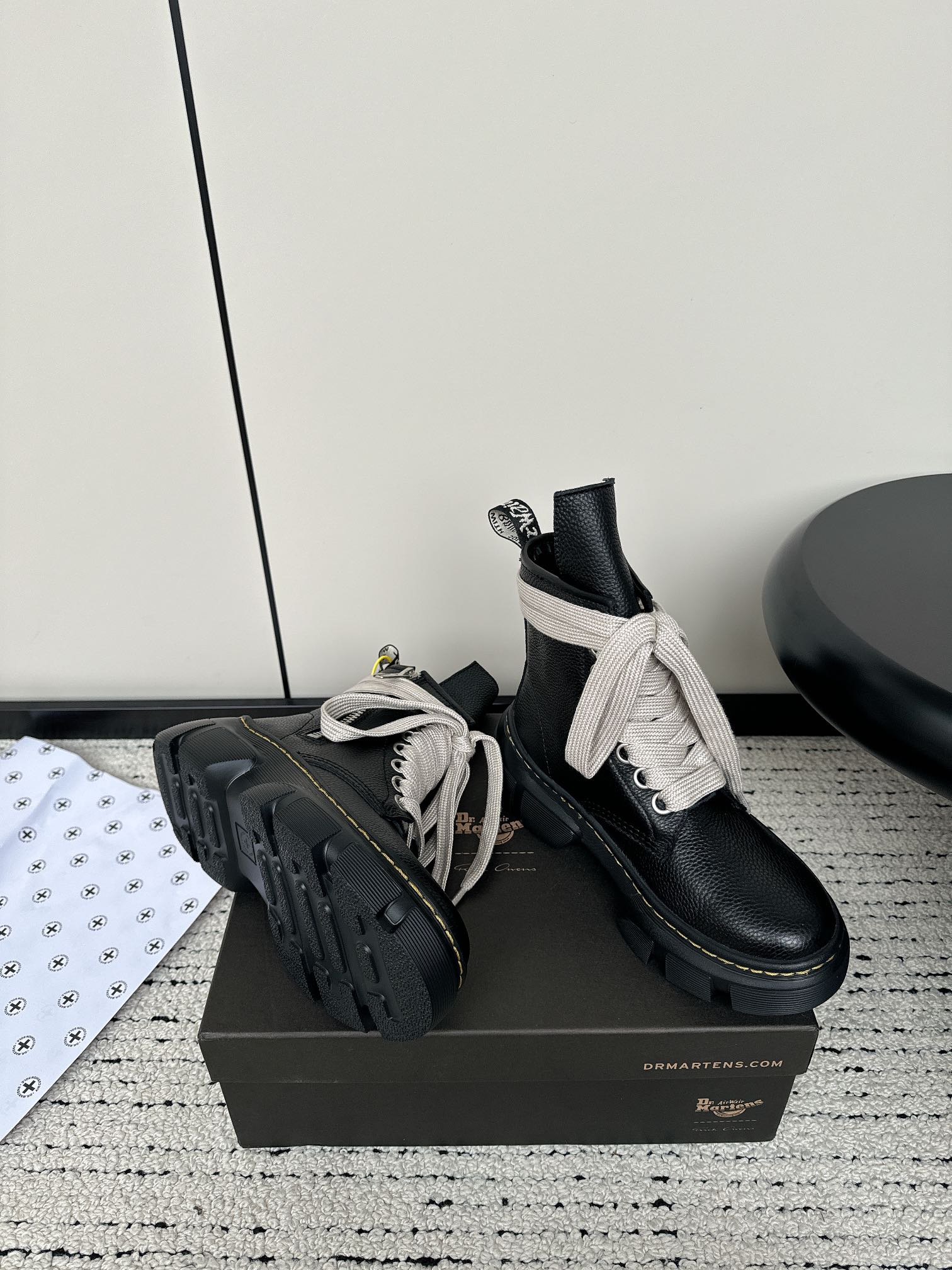 这款鞋子是AAAAA 1:1 质量 (非常棒). 使用了和原版一模一样的材料. 商标部分也保持了和Dr.martens一样. 图片拍摄是实物鞋子拍摄, 您所收到的实物保证和我们图片一模一样.