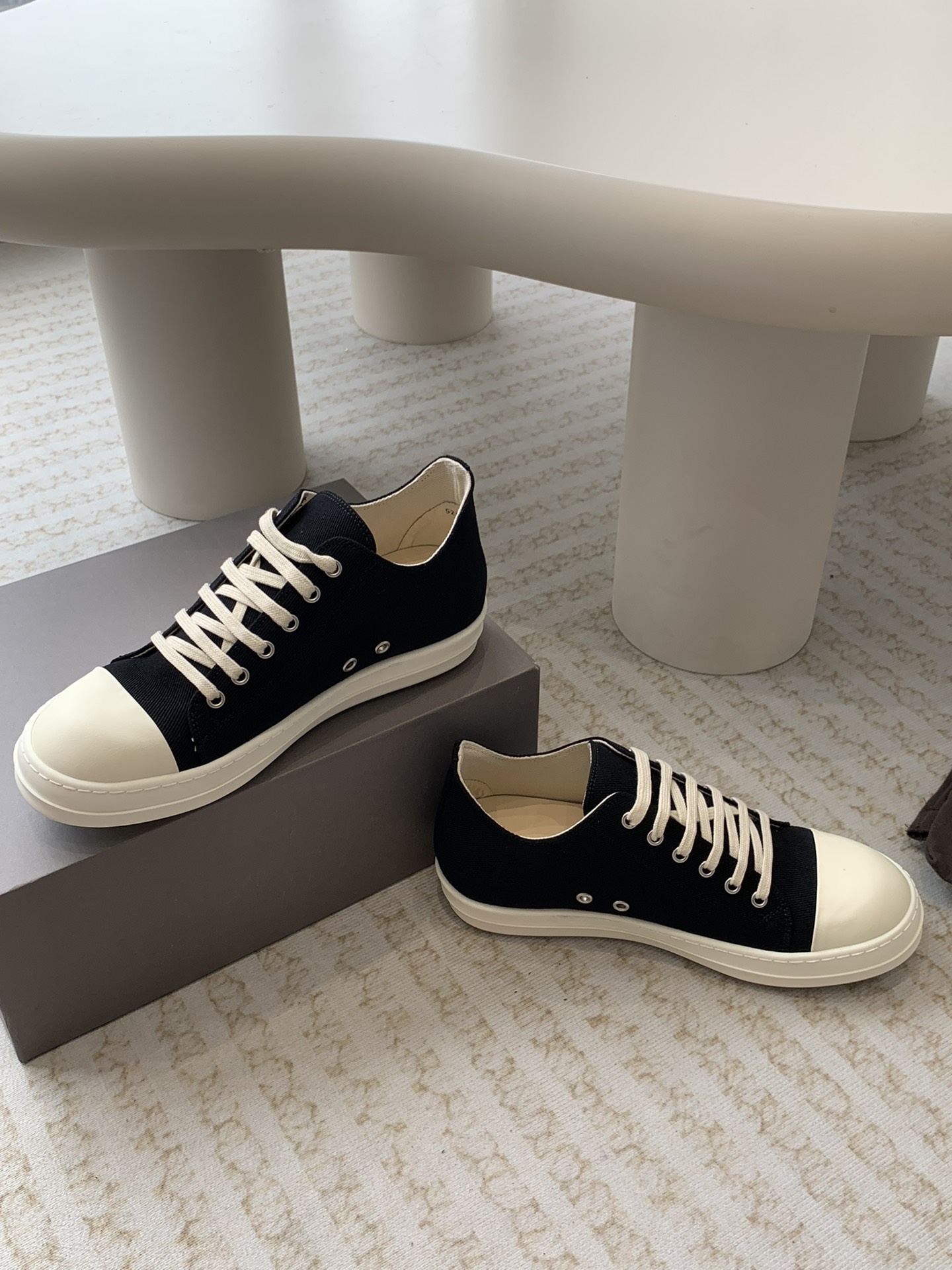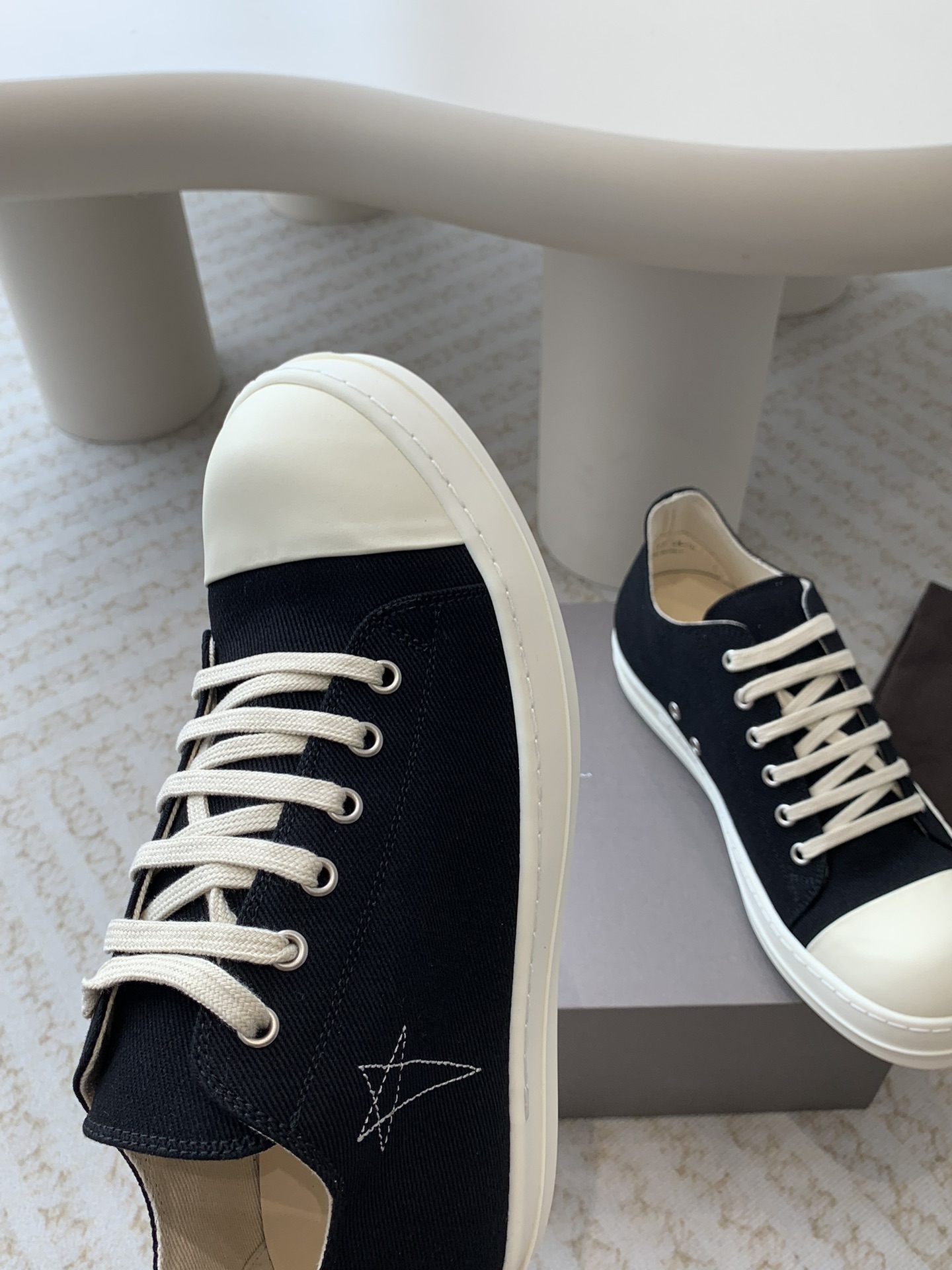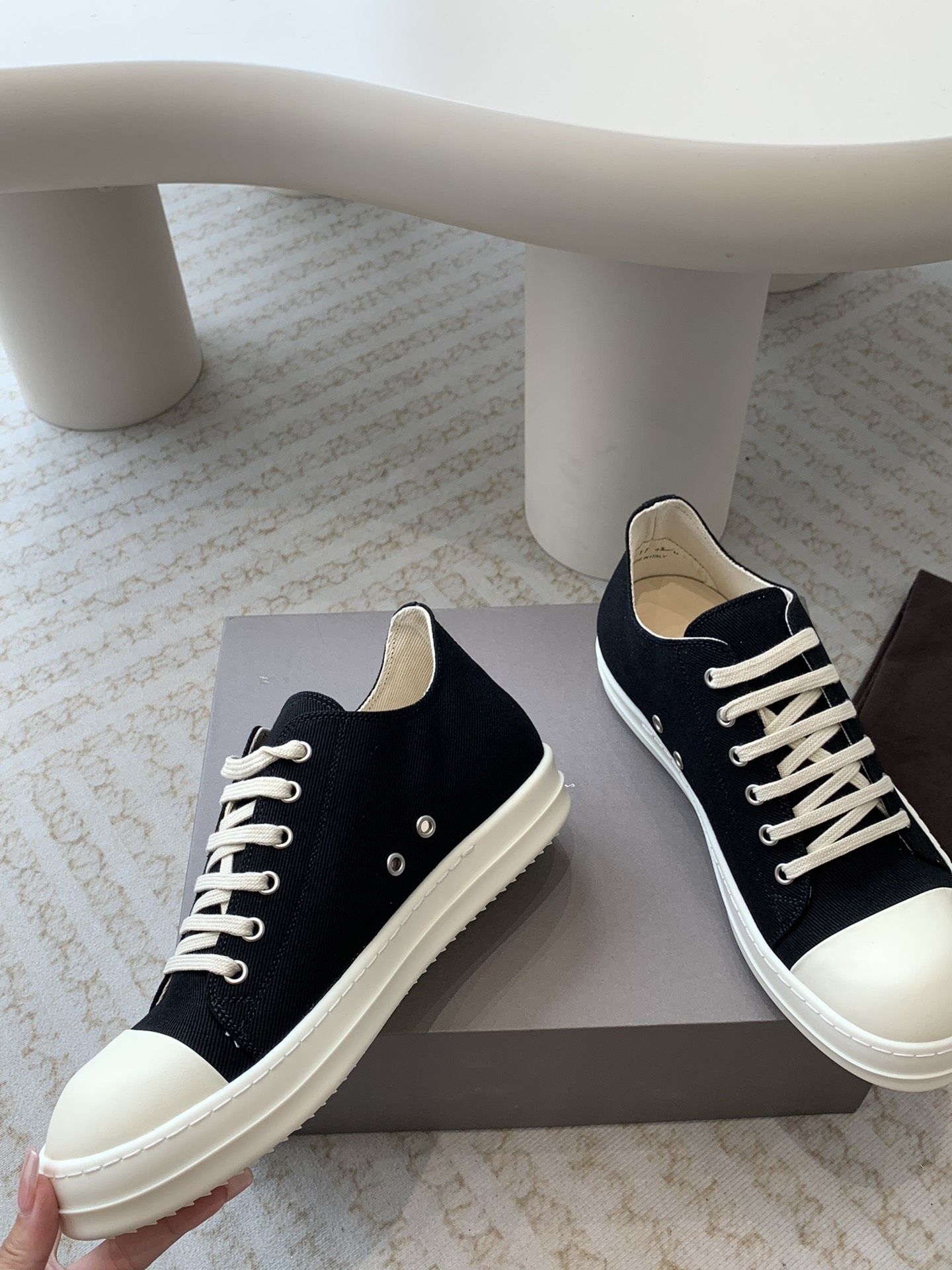 这款鞋子是AAAAA 1:1 质量 (非常棒). 使用了和原版一模一样的材料. 商标部分也保持了和里克·欧文斯/Rick Owens一样. 图片拍摄是实物鞋子拍摄, 您所收到的实物保证和我们图片一模一样.