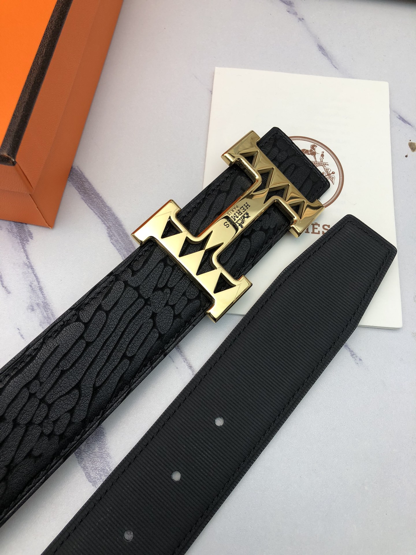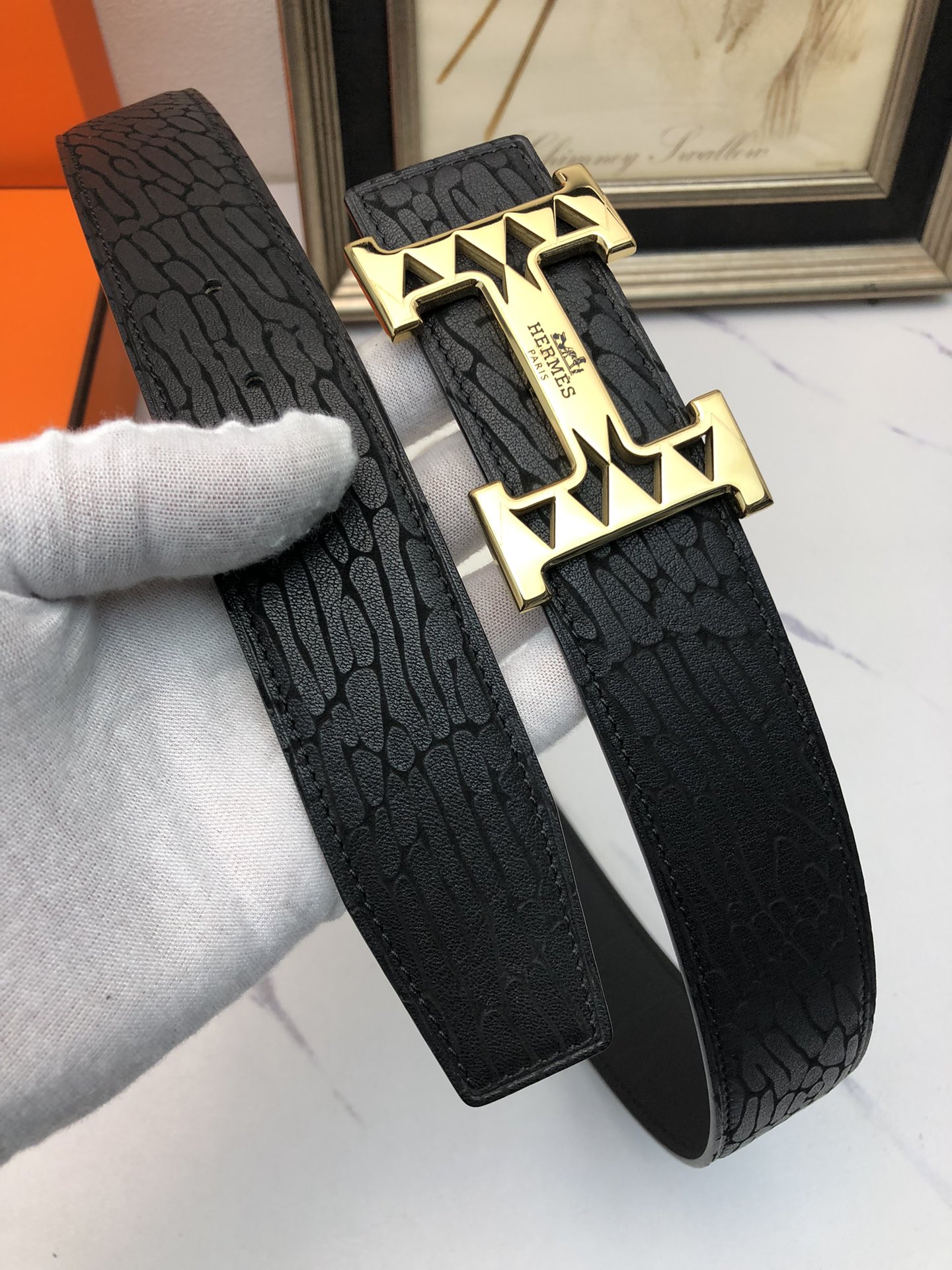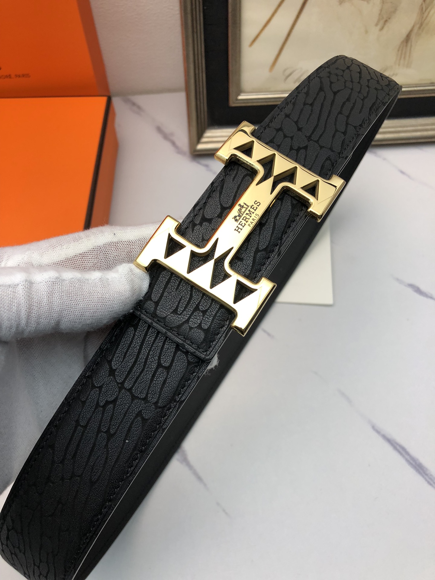 这款皮带是AAAAA 1:1 质量 (非常棒). 使用了和原版一模一样的材料. 商标部分也保持了和爱马仕/Hermes一样. 图片拍摄是实物皮带拍摄, 您所收到的实物保证和我们图片一模一样.