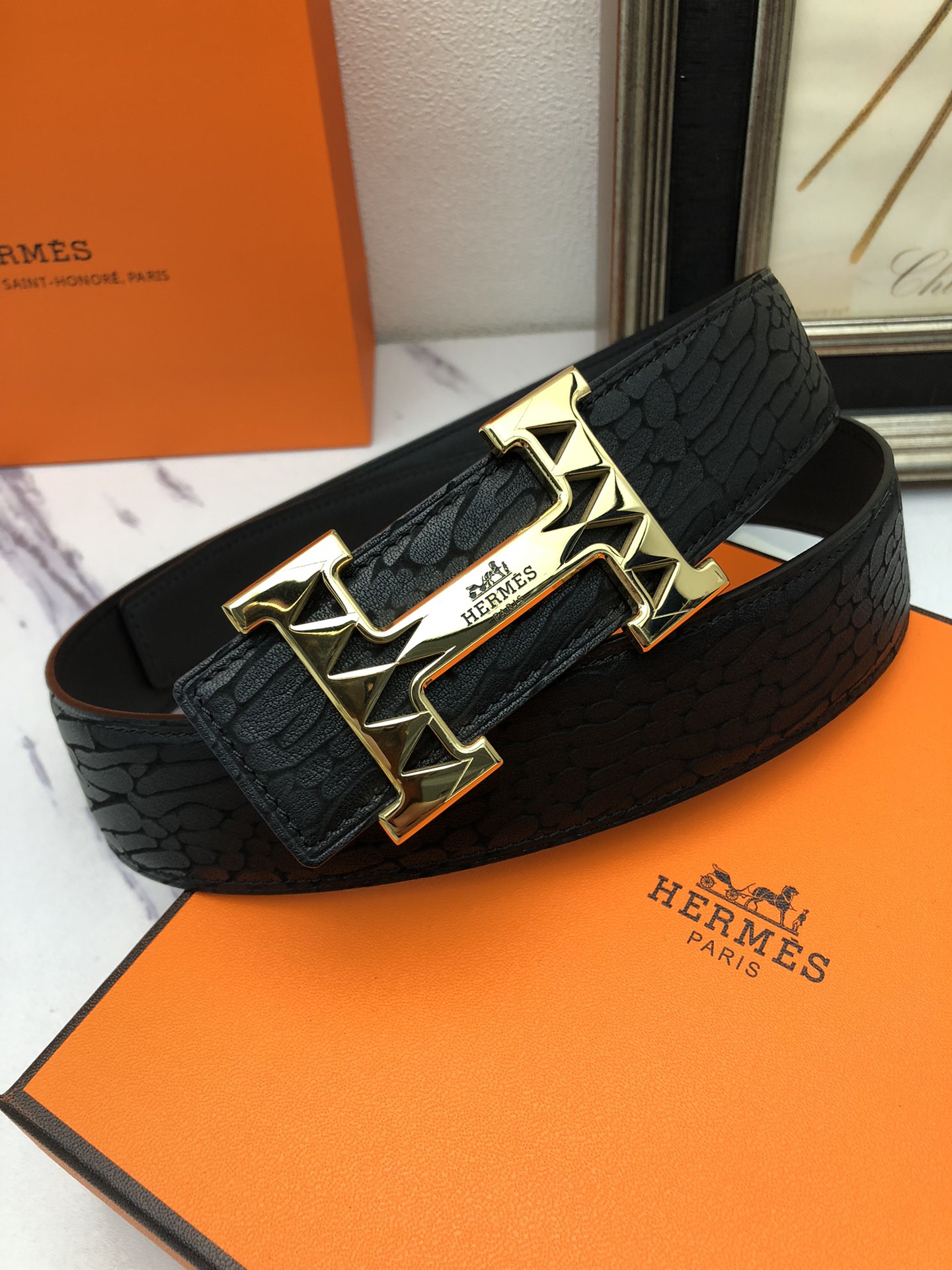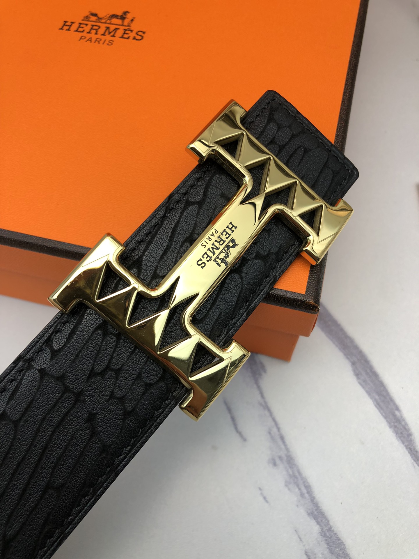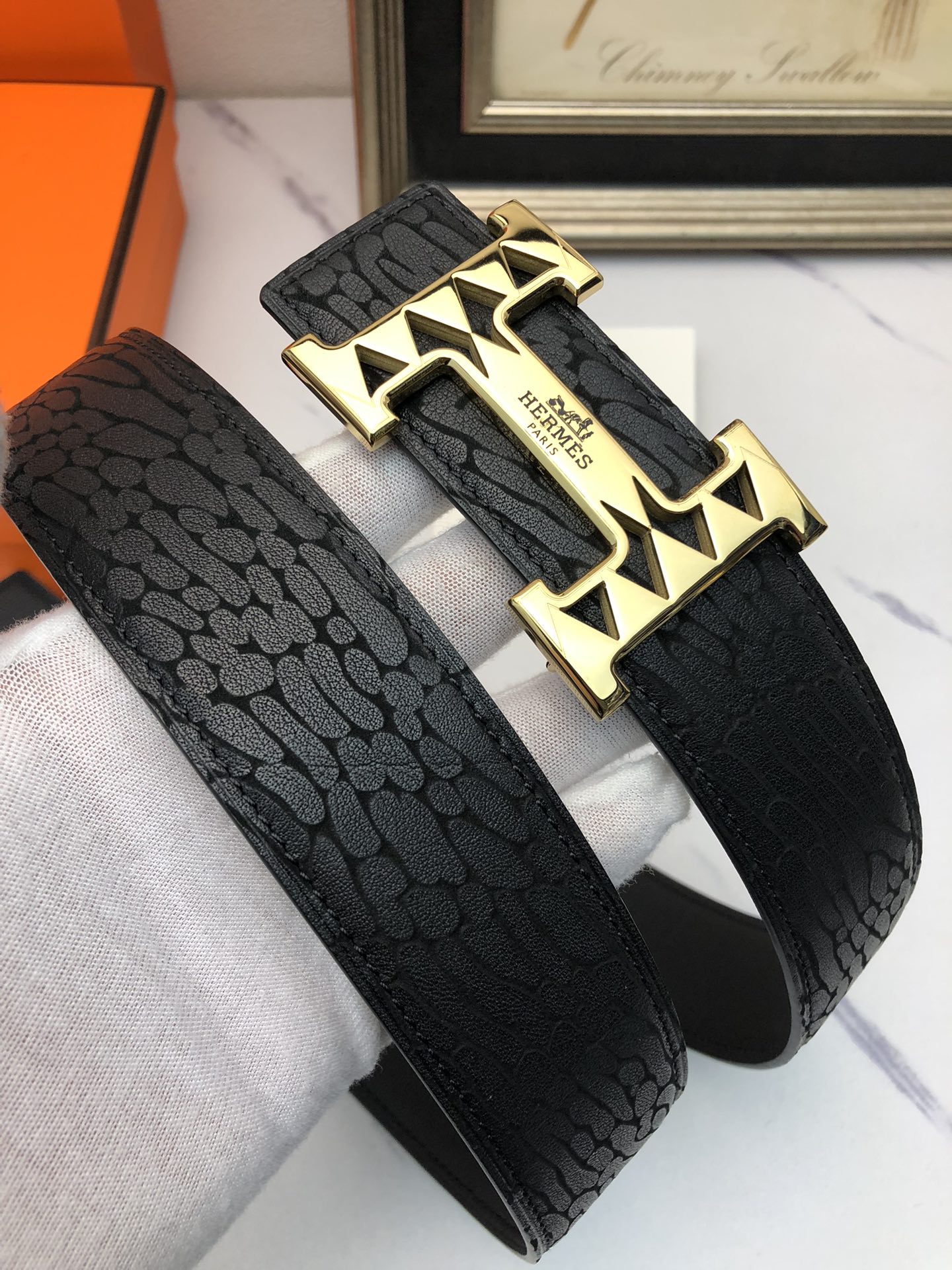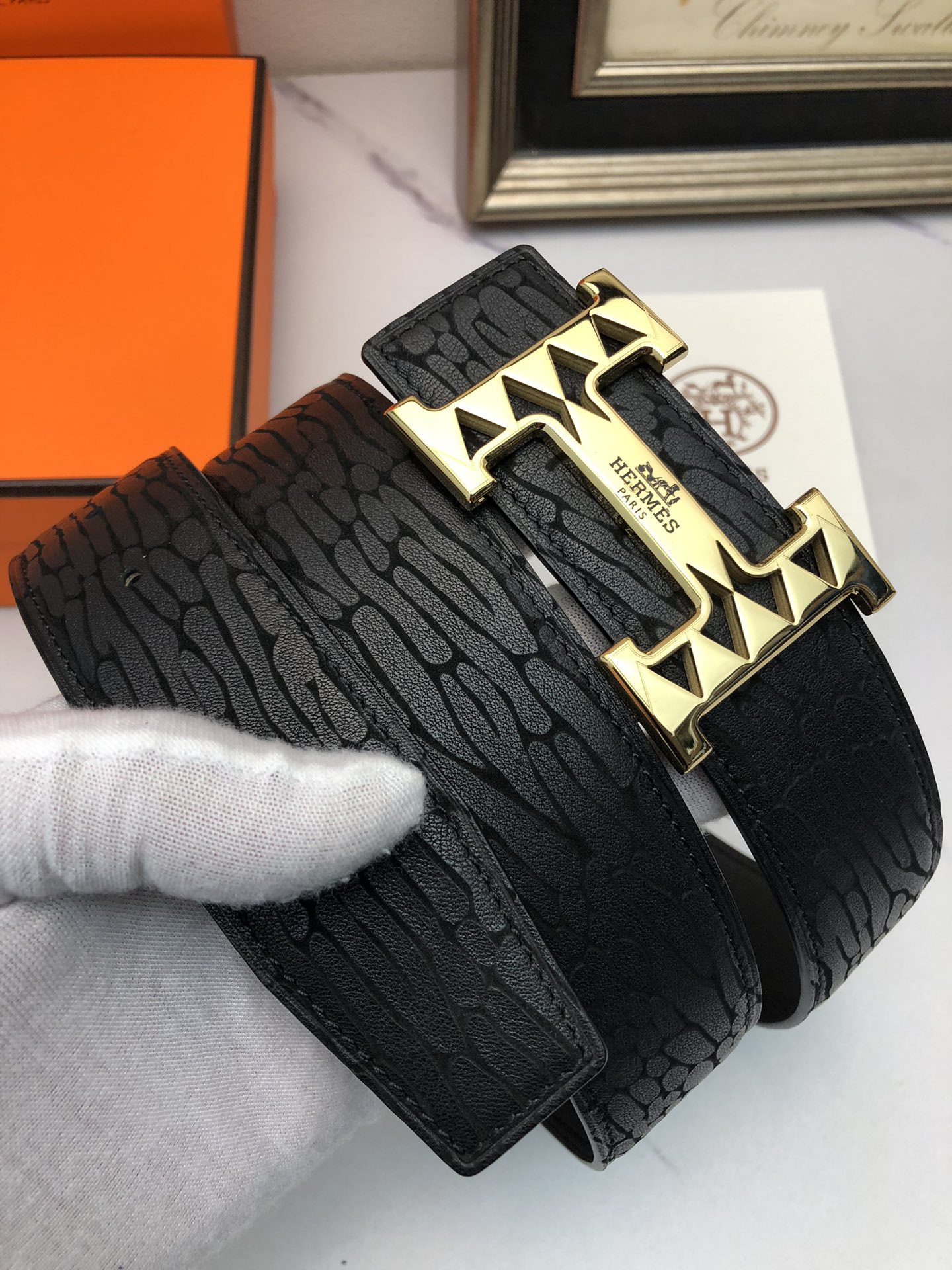这款皮带是AAAAA 1:1 质量 (非常棒). 使用了和原版一模一样的材料. 商标部分也保持了和爱马仕/Hermes一样. 图片拍摄是实物皮带拍摄, 您所收到的实物保证和我们图片一模一样.