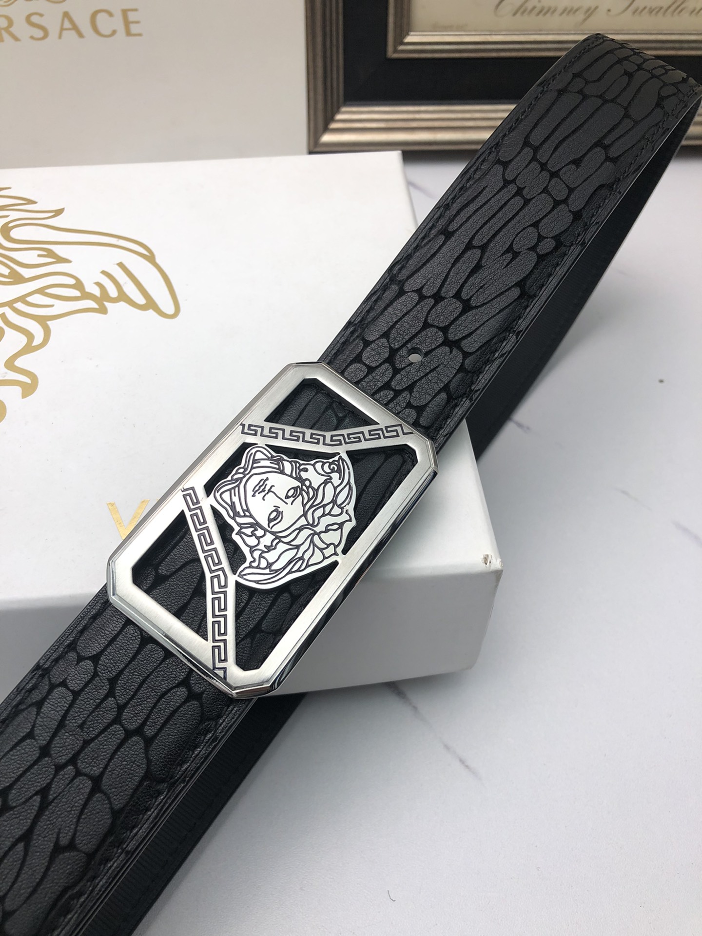 这款皮带是AAAAA 1:1 质量 (非常棒). 使用了和原版一模一样的材料. 商标部分也保持了和范思哲/Versace一样. 图片拍摄是实物皮带拍摄, 您所收到的实物保证和我们图片一模一样.