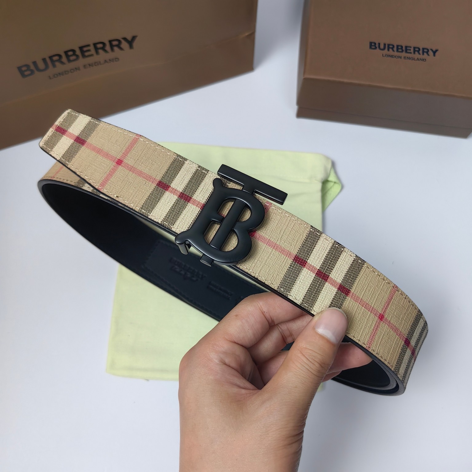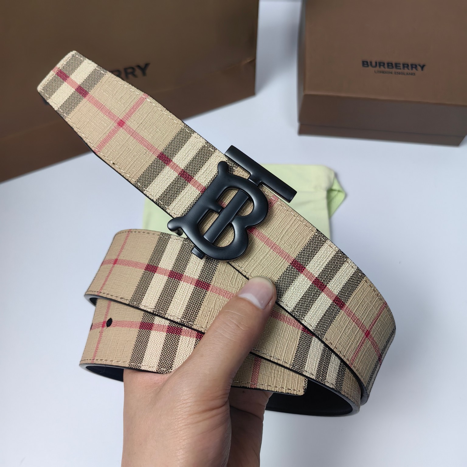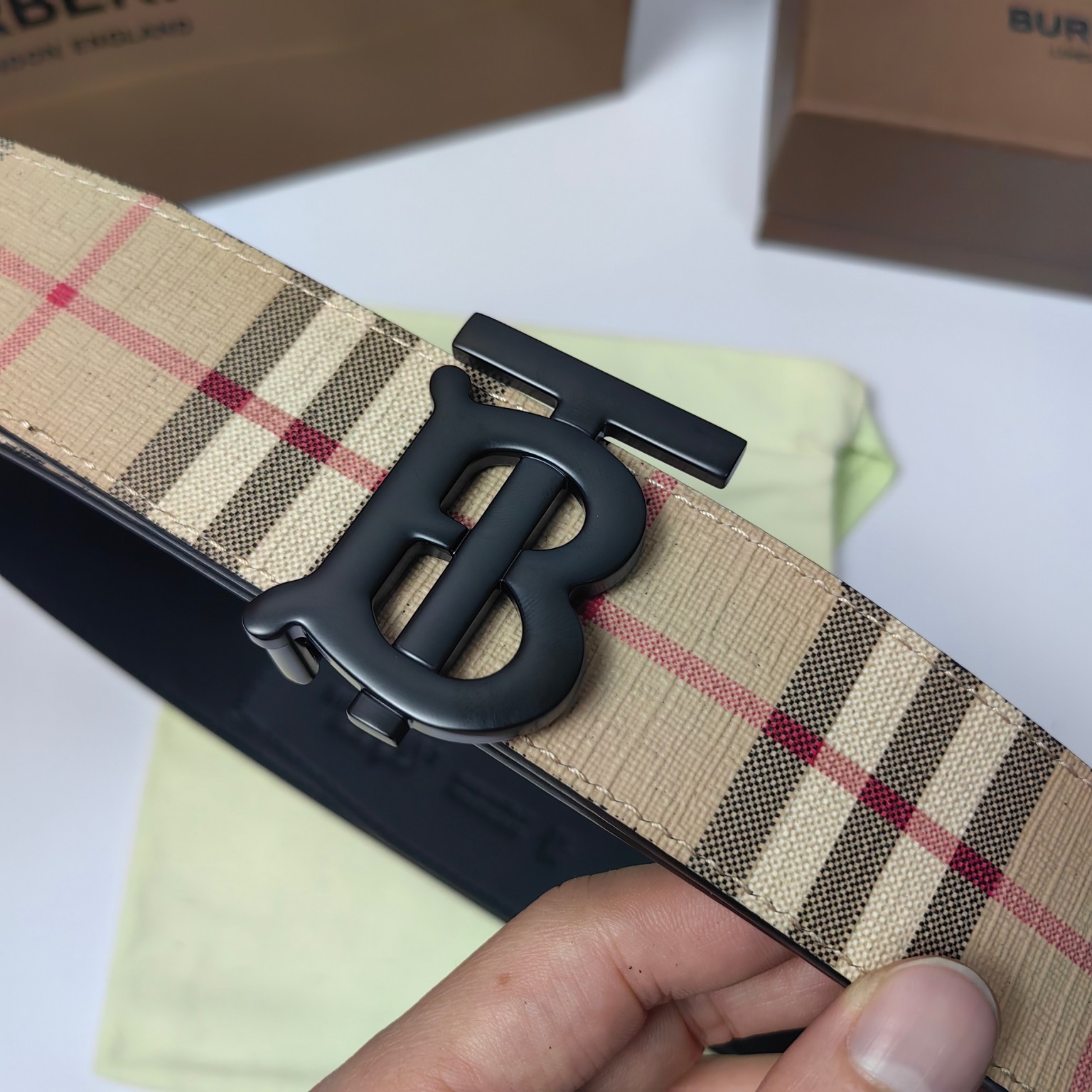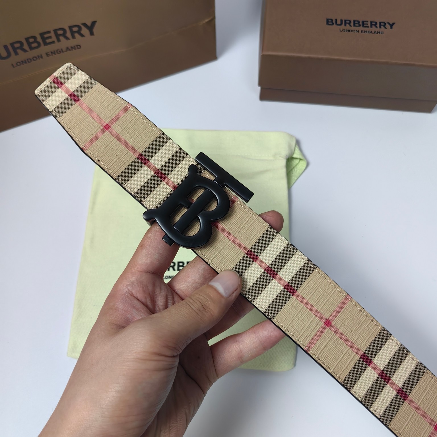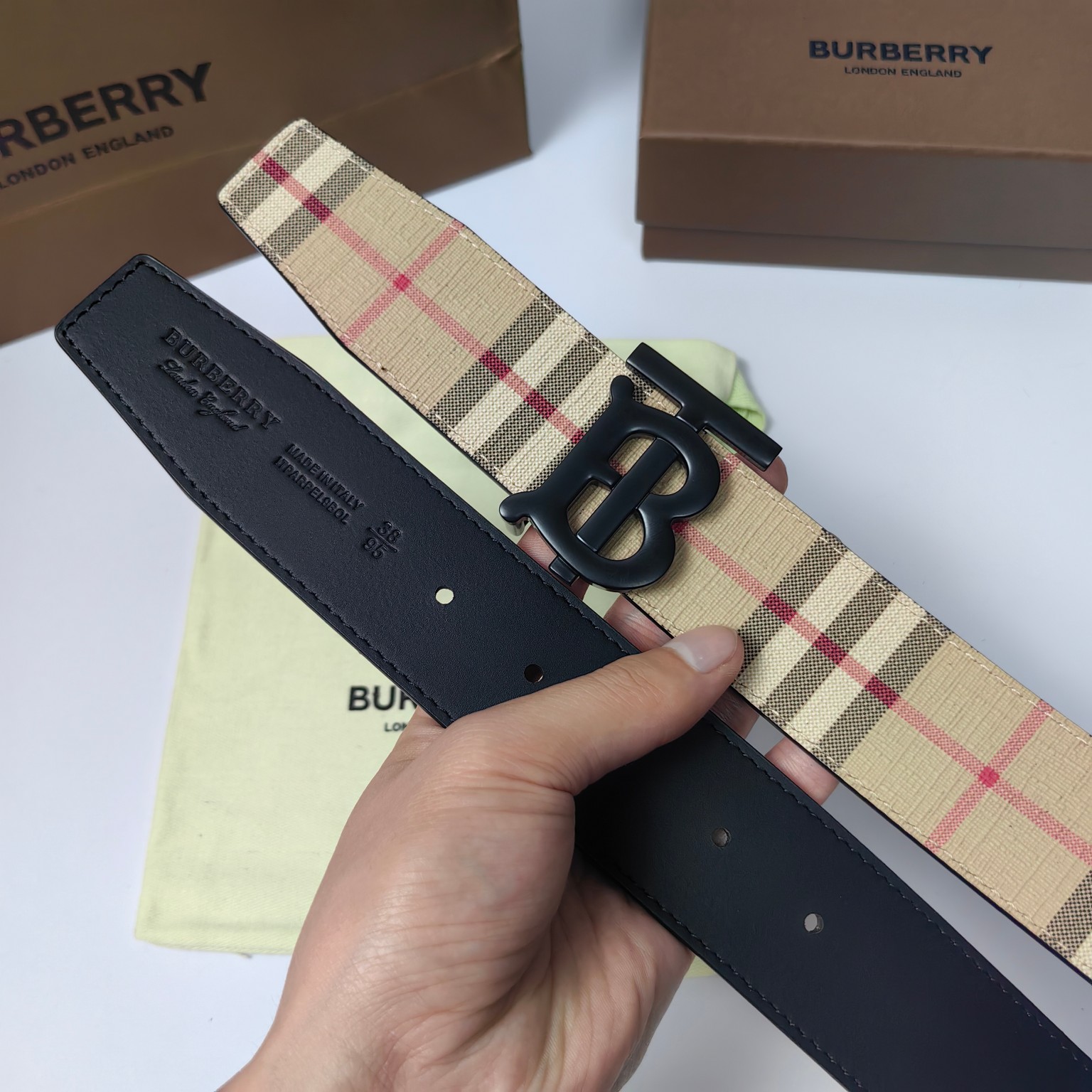 这款皮带是AAAAA 1:1 质量 (非常棒). 使用了和原版一模一样的材料. 商标部分也保持了和巴宝莉/Burberry一样. 图片拍摄是实物皮带拍摄, 您所收到的实物保证和我们图片一模一样.