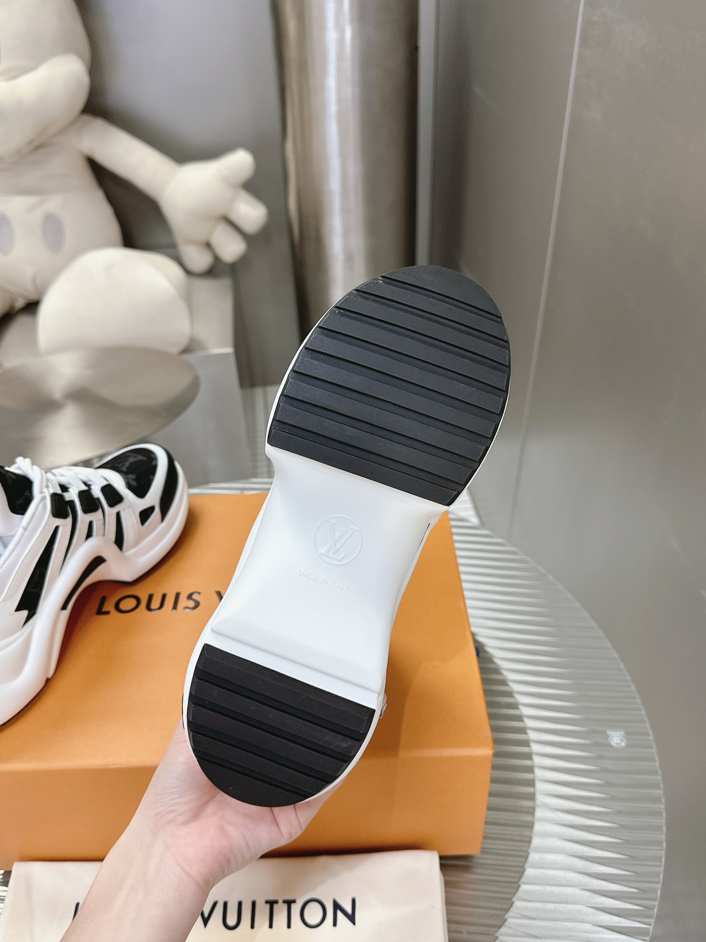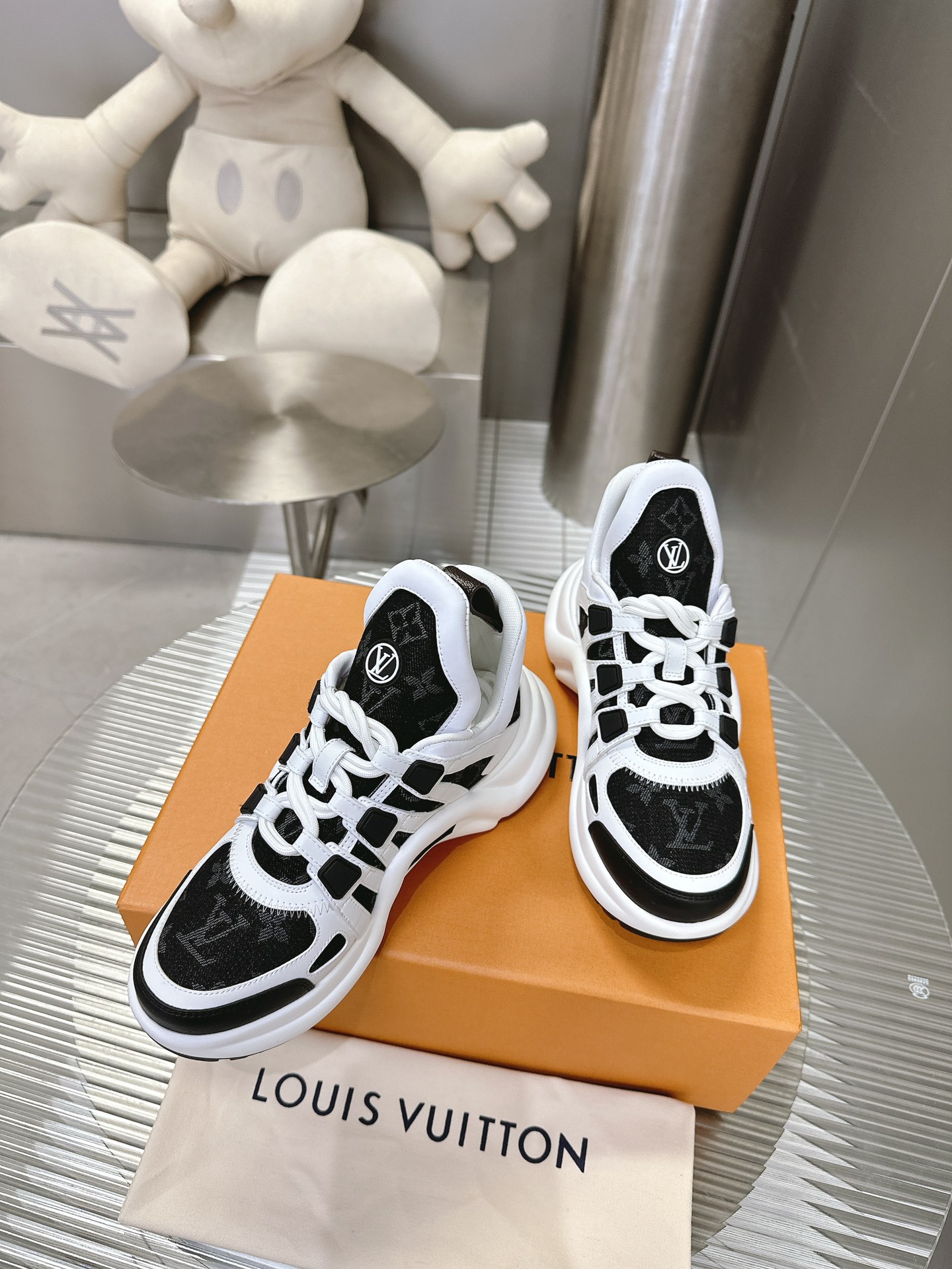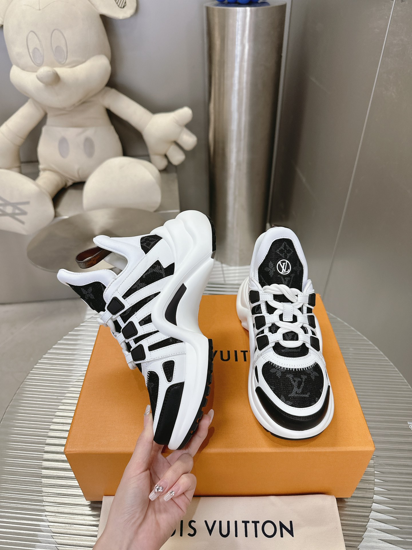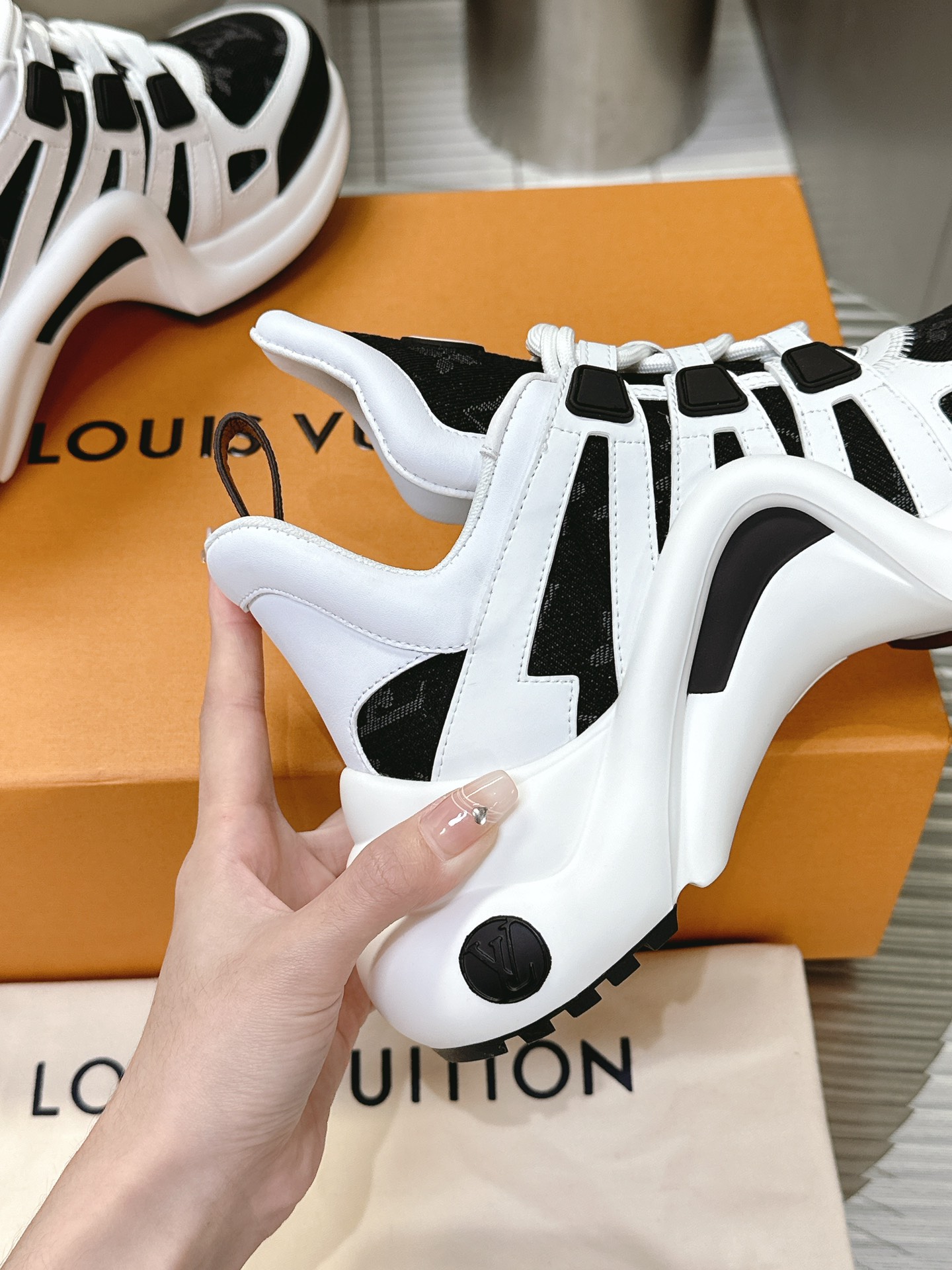 这款鞋子是AAAAA 1:1 质量 (非常棒). 使用了和原版一模一样的材料. 商标部分也保持了和路易威登/Louis Vuitton一样. 图片拍摄是实物鞋子拍摄, 您所收到的实物保证和我们图片一模一样.