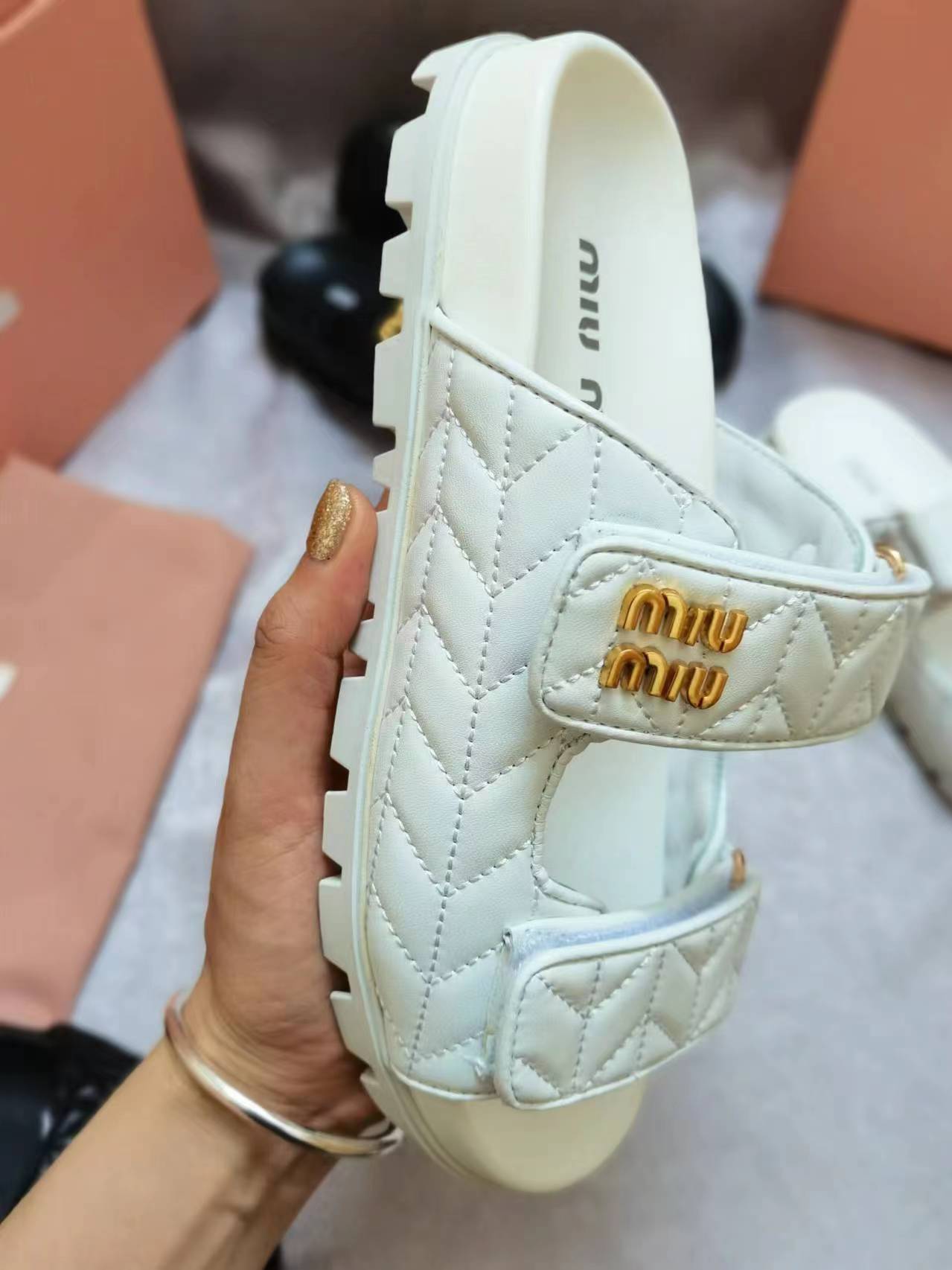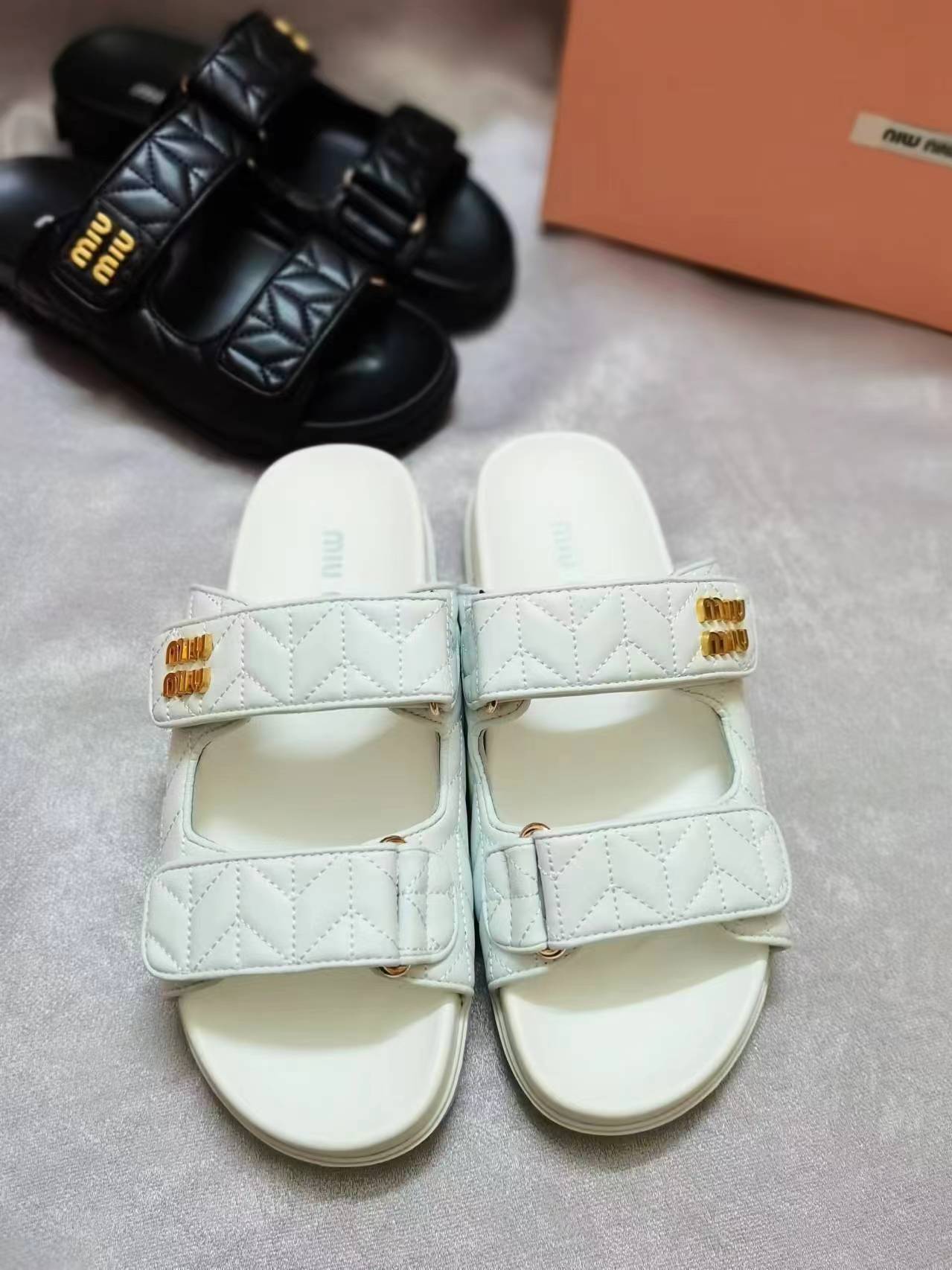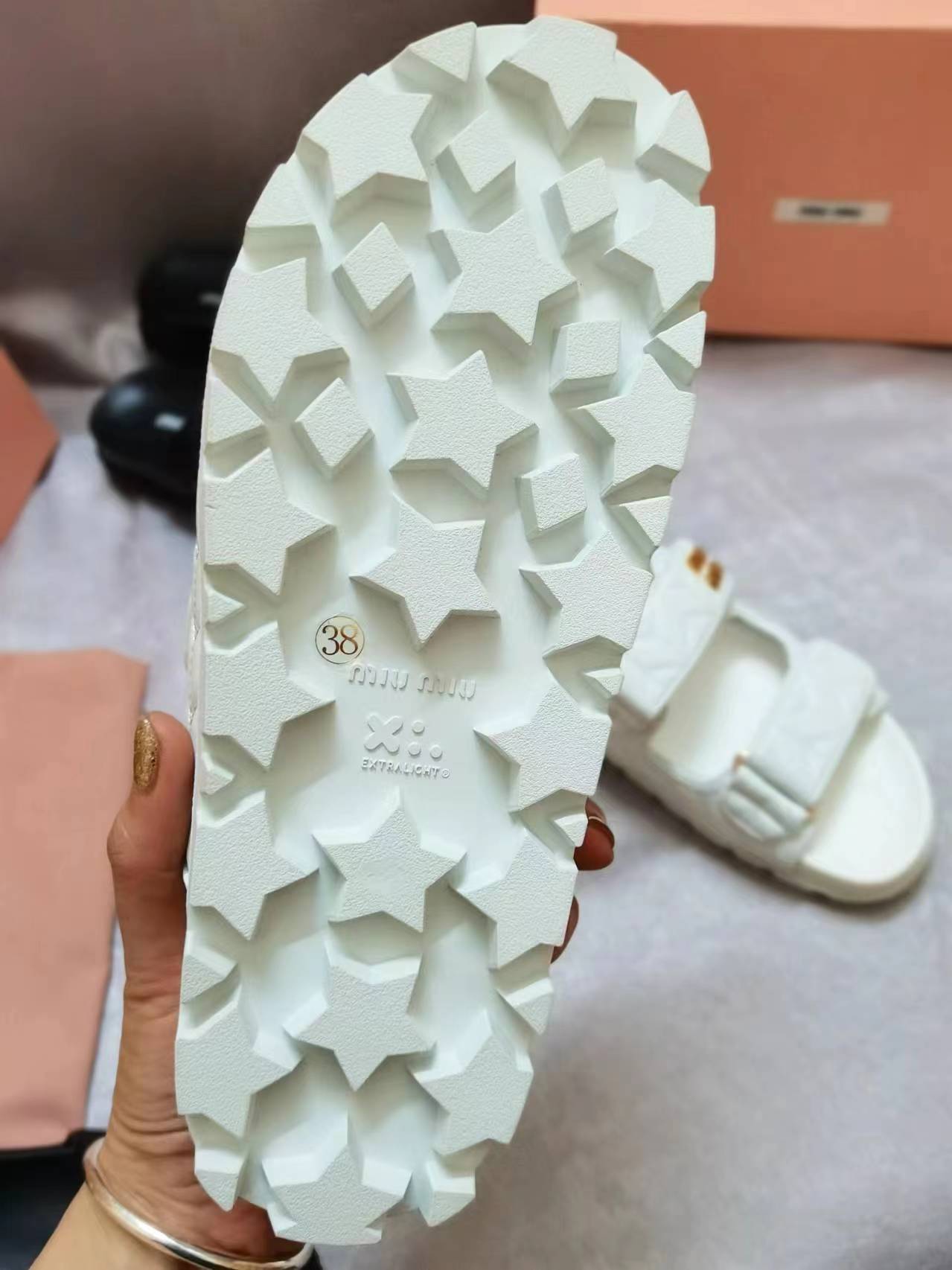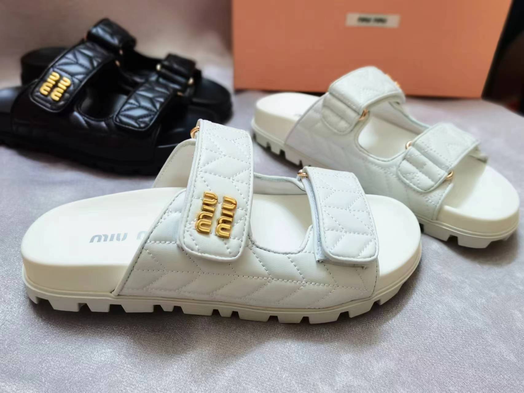 这款鞋子是AAAAA 1:1 质量 (非常棒). 使用了和原版一模一样的材料. 商标部分也保持了和缪缪/Miu Miu一样. 图片拍摄是实物鞋子拍摄, 您所收到的实物保证和我们图片一模一样.