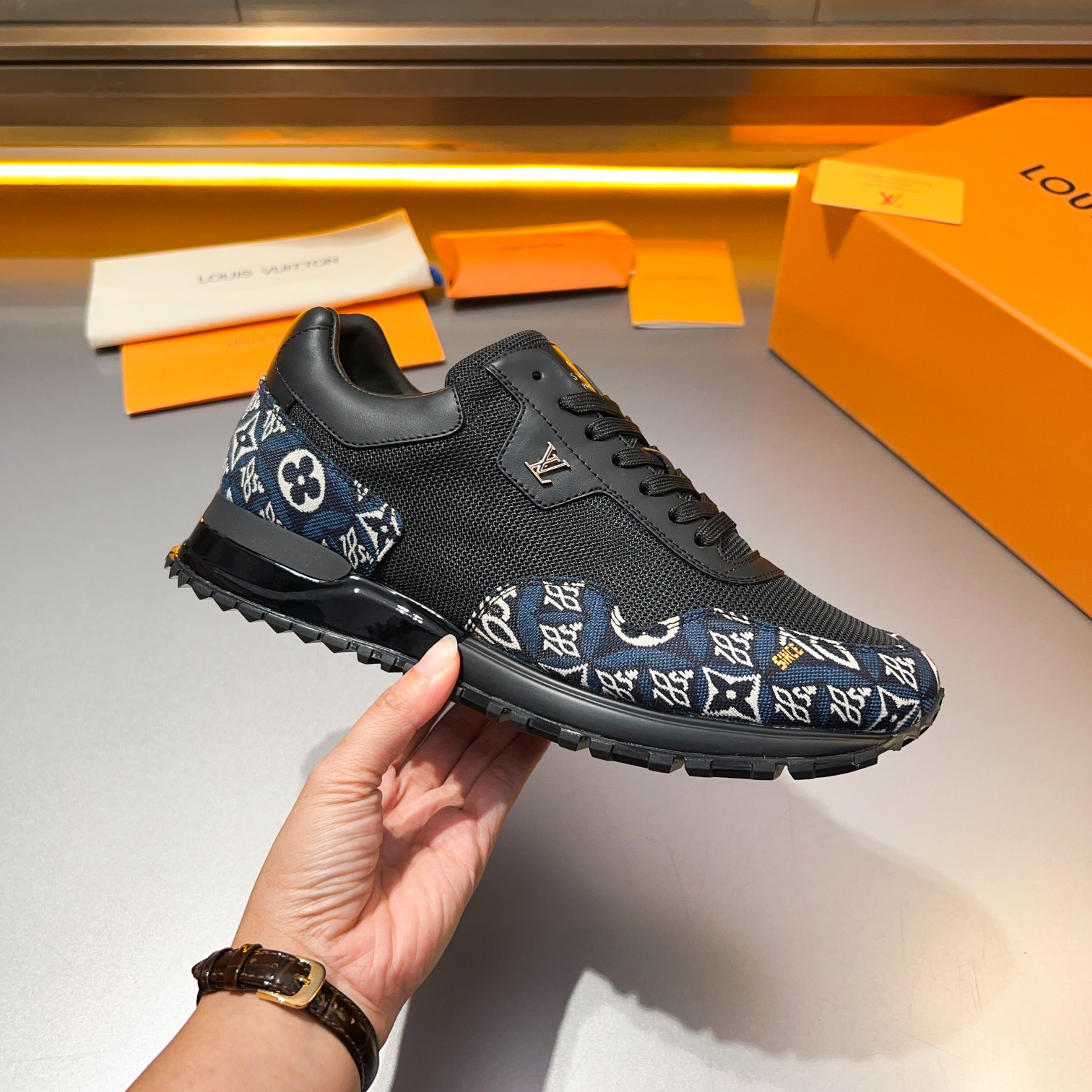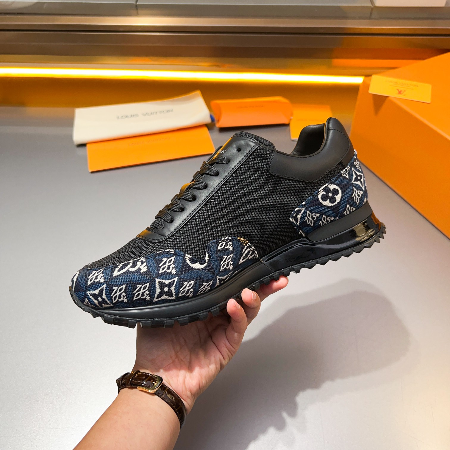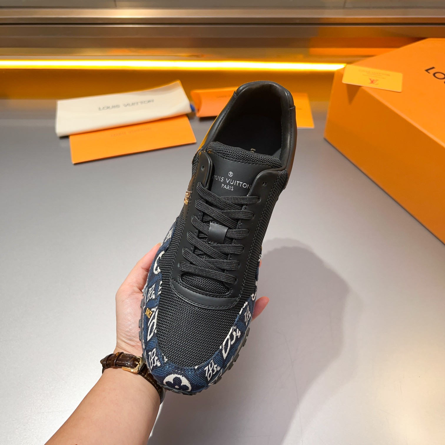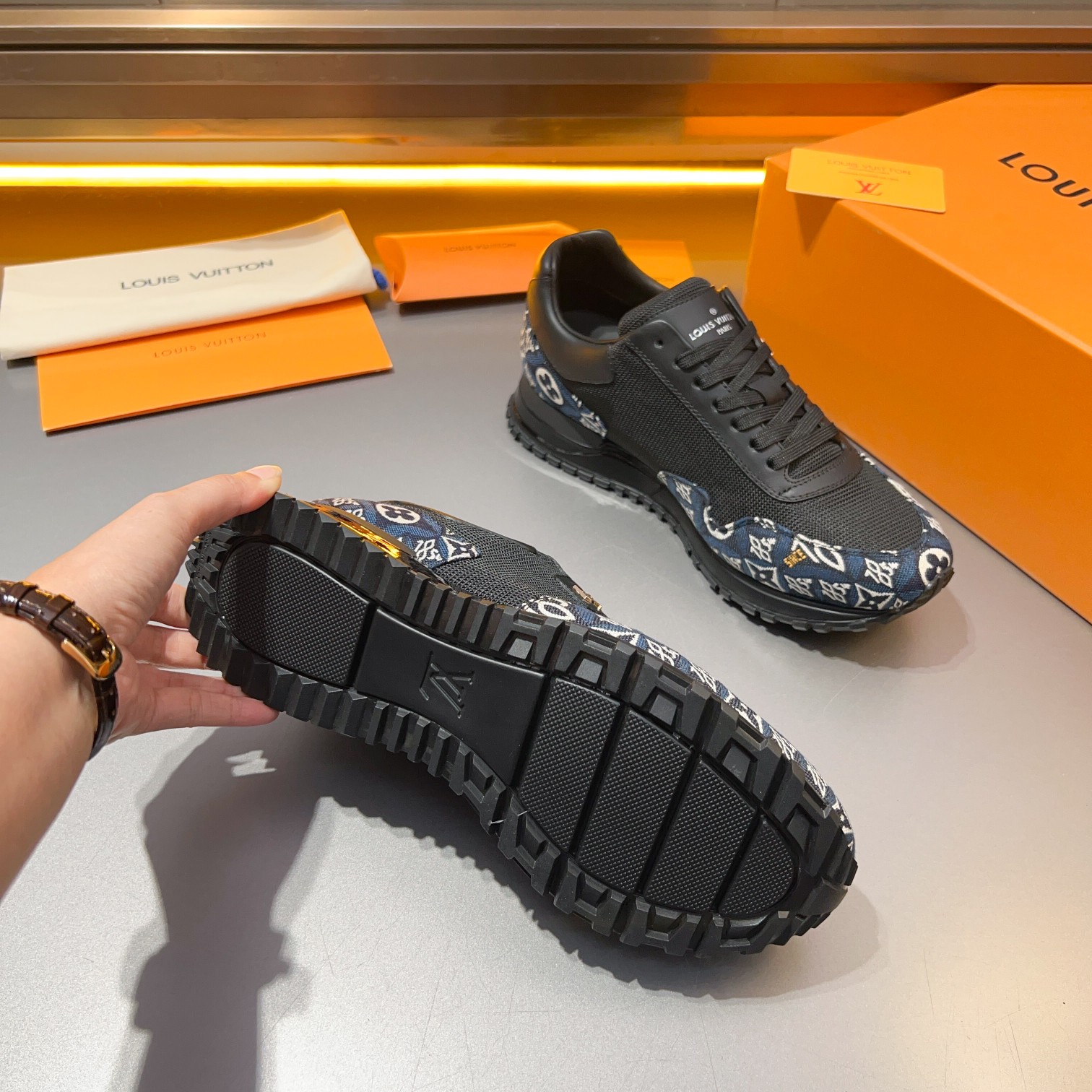 这款鞋子是AAAAA 1:1 质量 (非常棒). 使用了和原版一模一样的材料. 商标部分也保持了和路易威登/Louis Vuitton一样. 图片拍摄是实物鞋子拍摄, 您所收到的实物保证和我们图片一模一样.