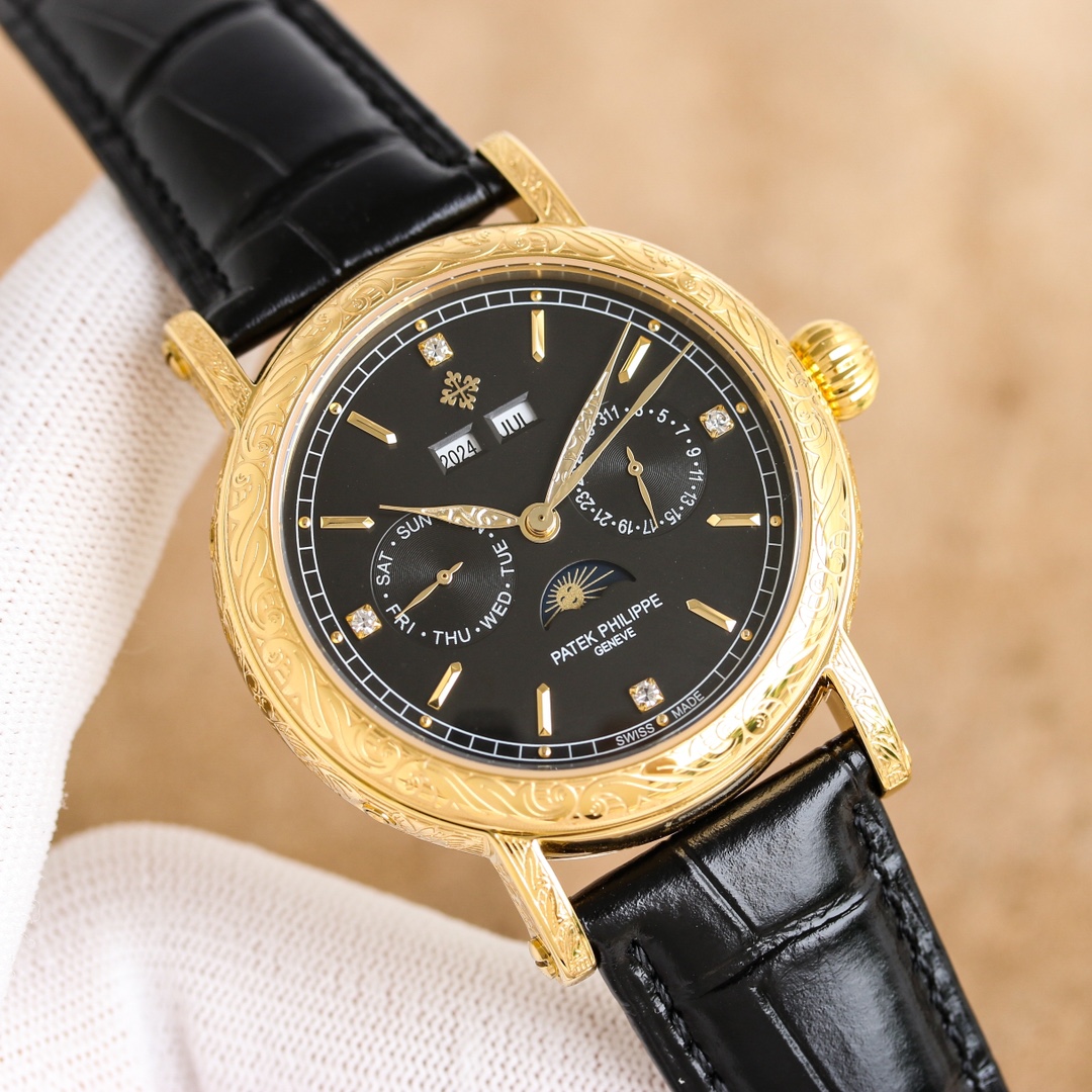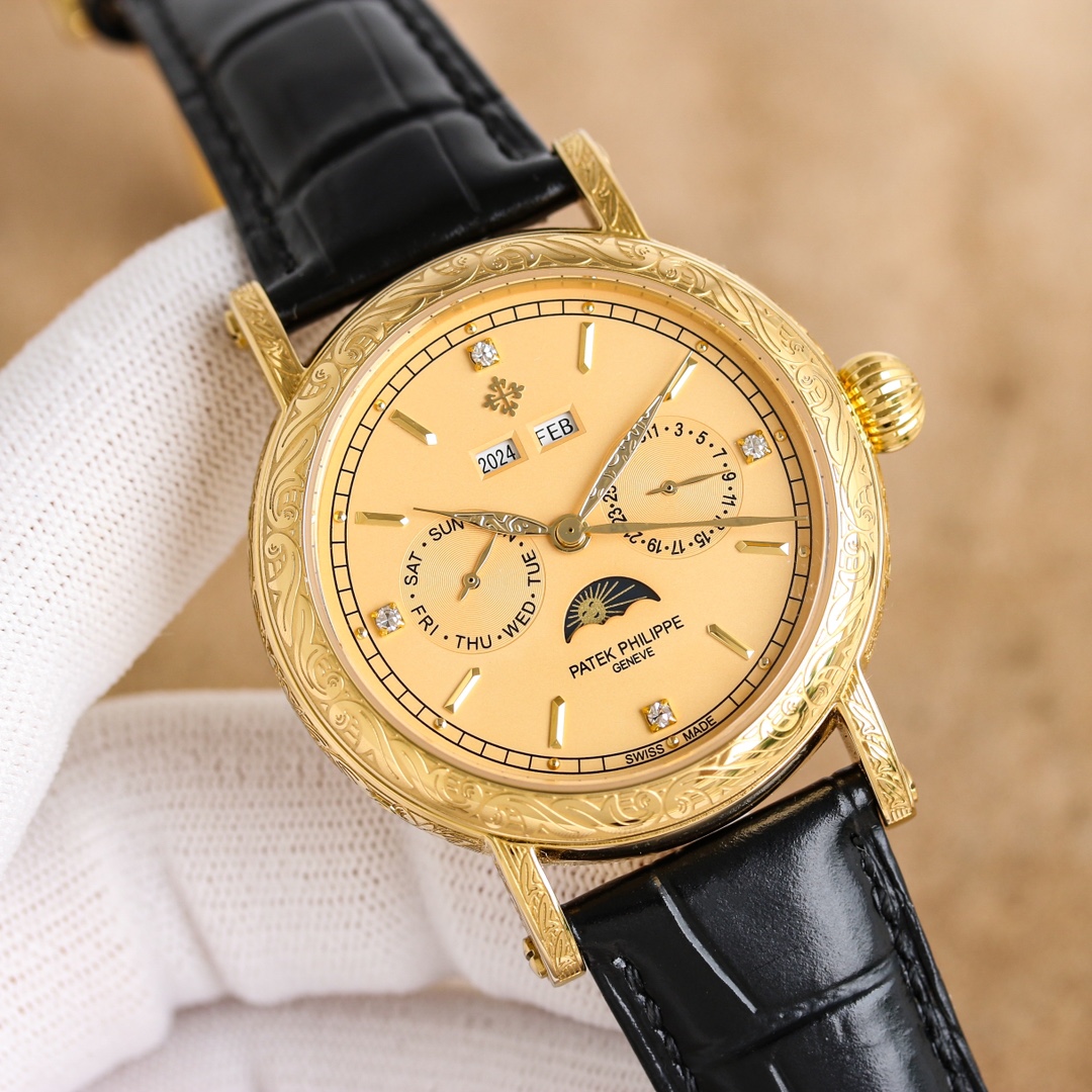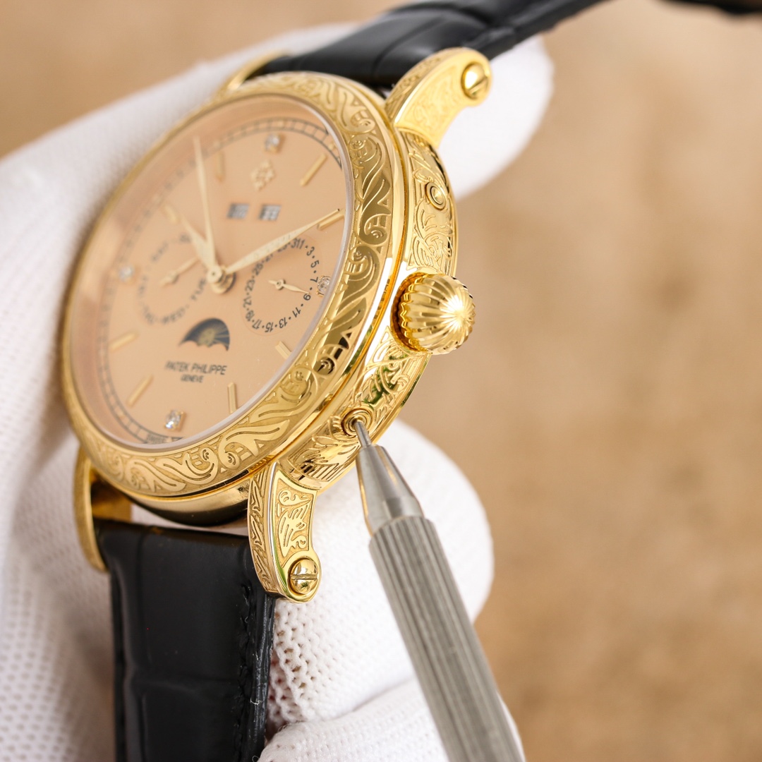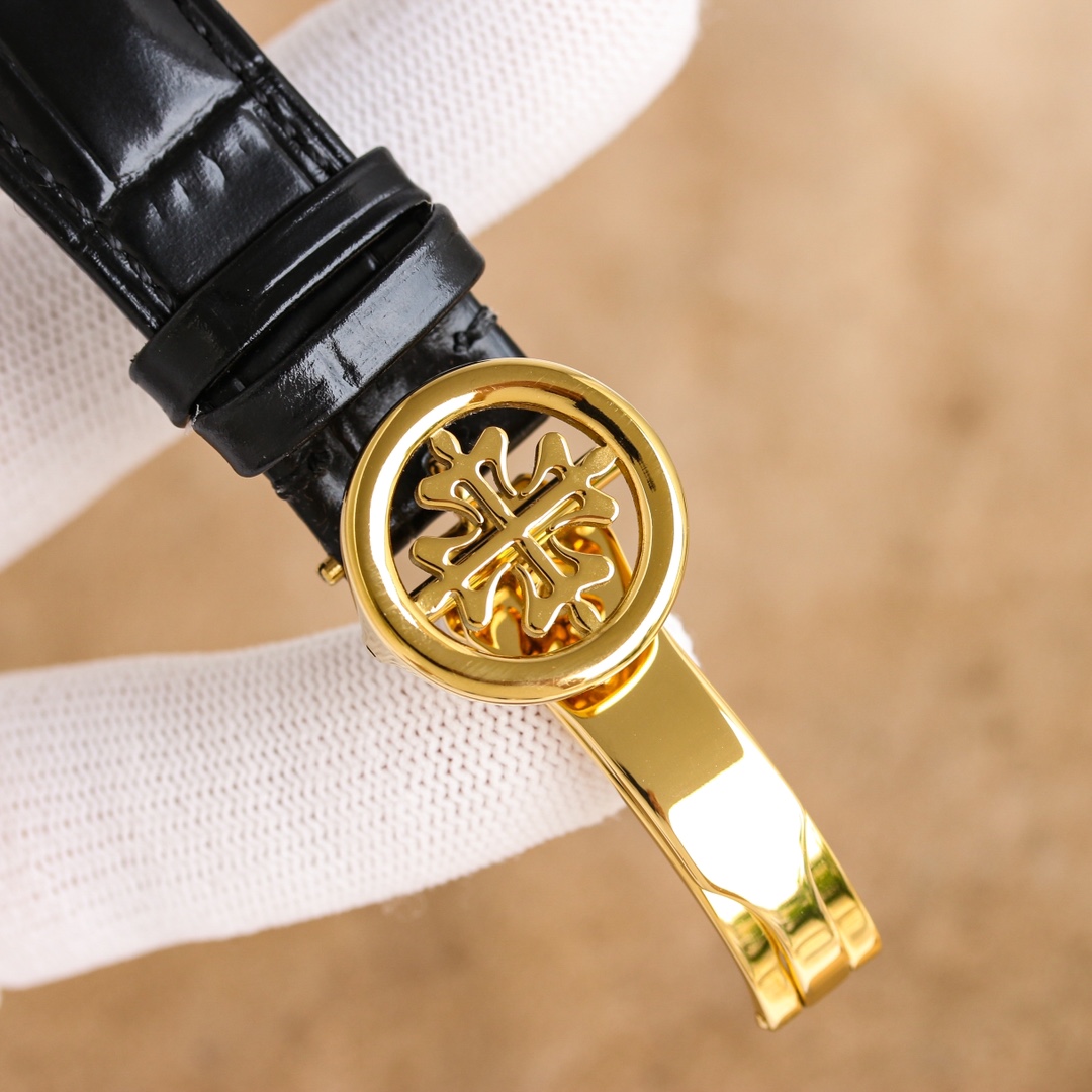 这款手表是AAAAA 1:1 质量 (非常棒). 使用了和原版一模一样的材料. 商标部分也保持了和百达翡丽/Patek Philippe一样. 图片拍摄是实物手表拍摄, 您所收到的实物保证和我们图片一模一样.