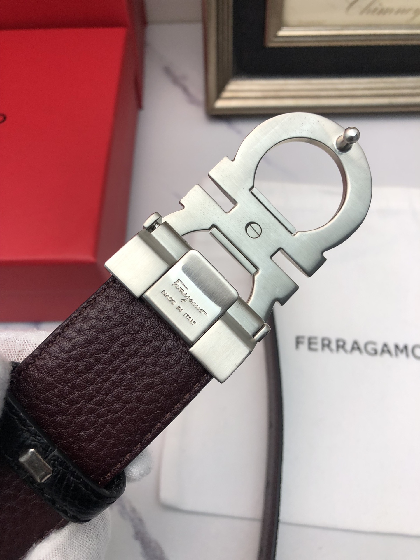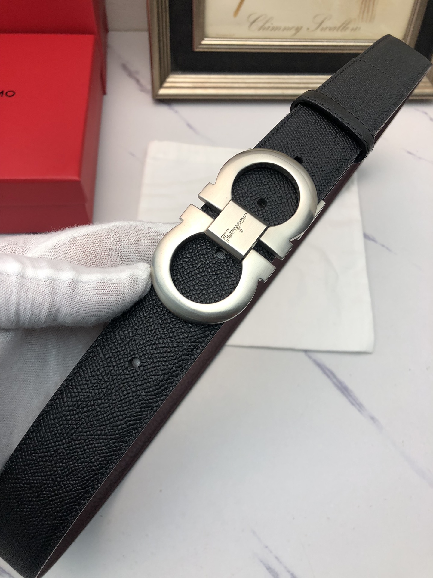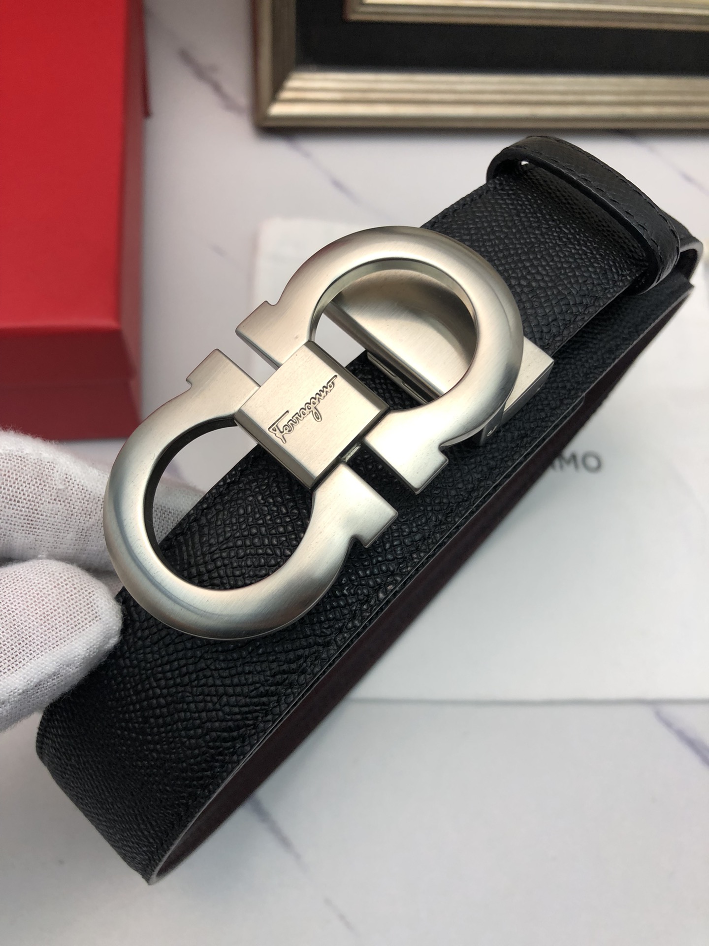 这款皮带是AAAAA 1:1 质量 (非常棒). 使用了和原版一模一样的材料. 商标部分也保持了和菲拉格慕/Salvatore Ferragamo一样. 图片拍摄是实物皮带拍摄, 您所收到的实物保证和我们图片一模一样.