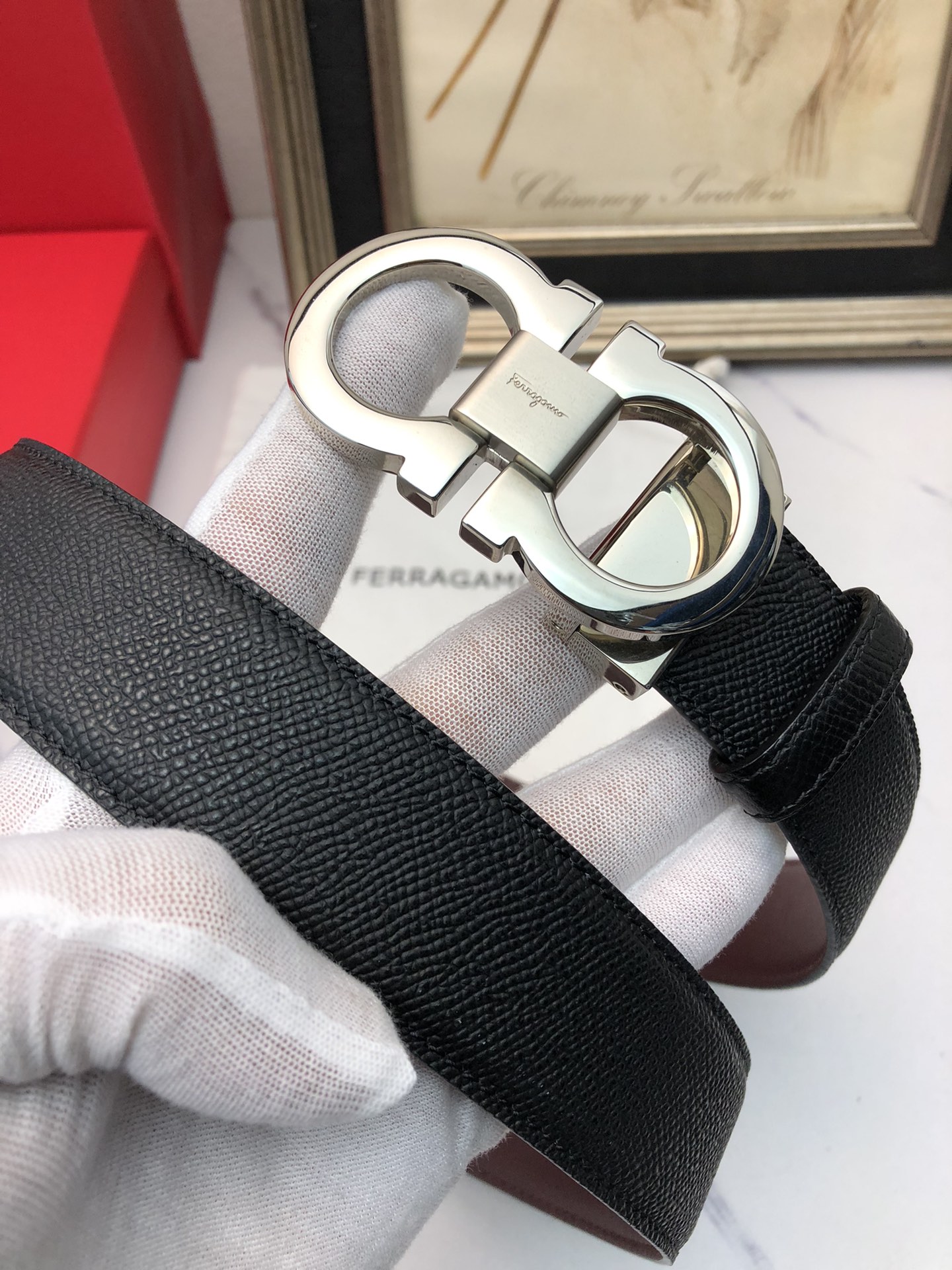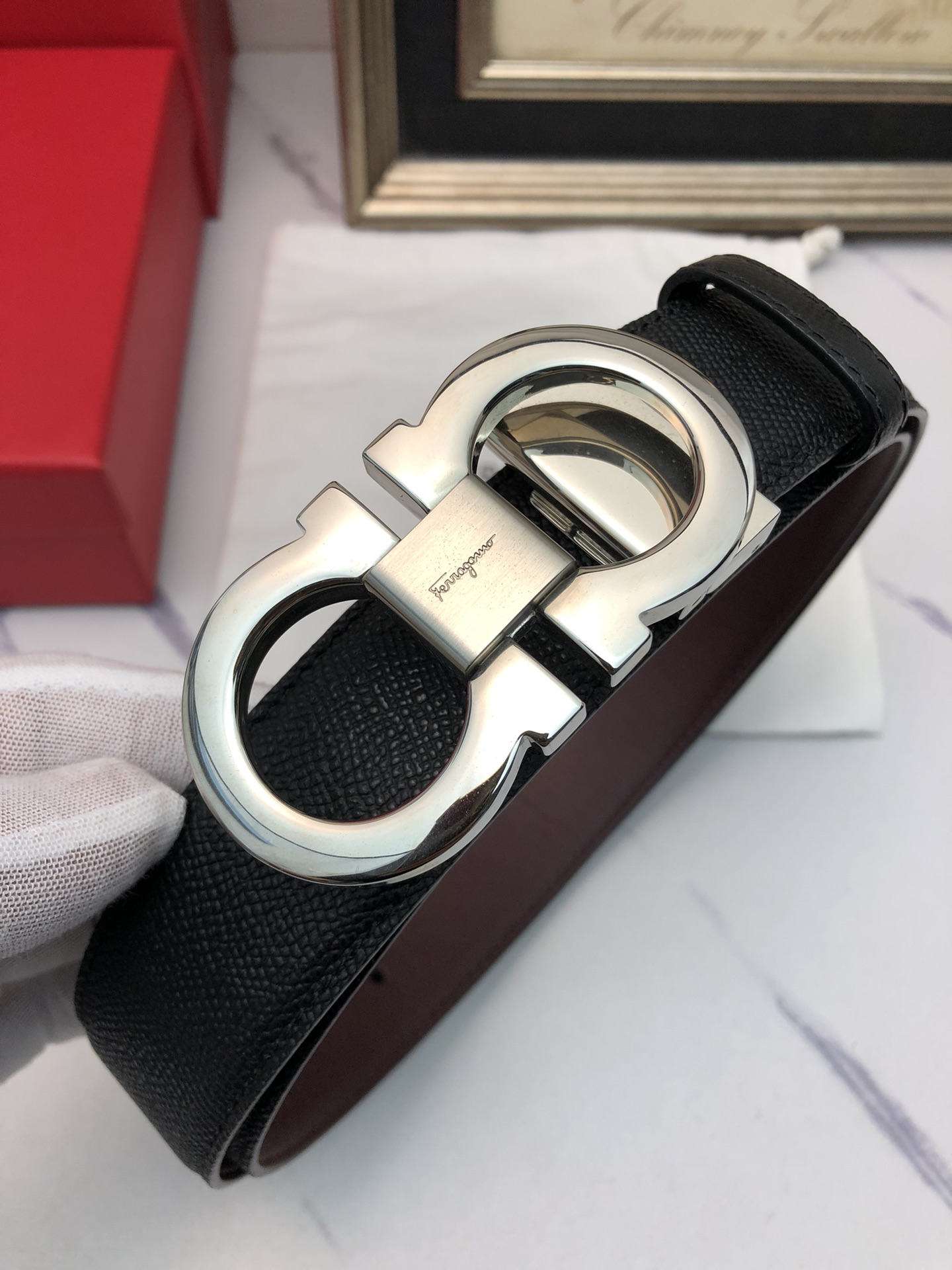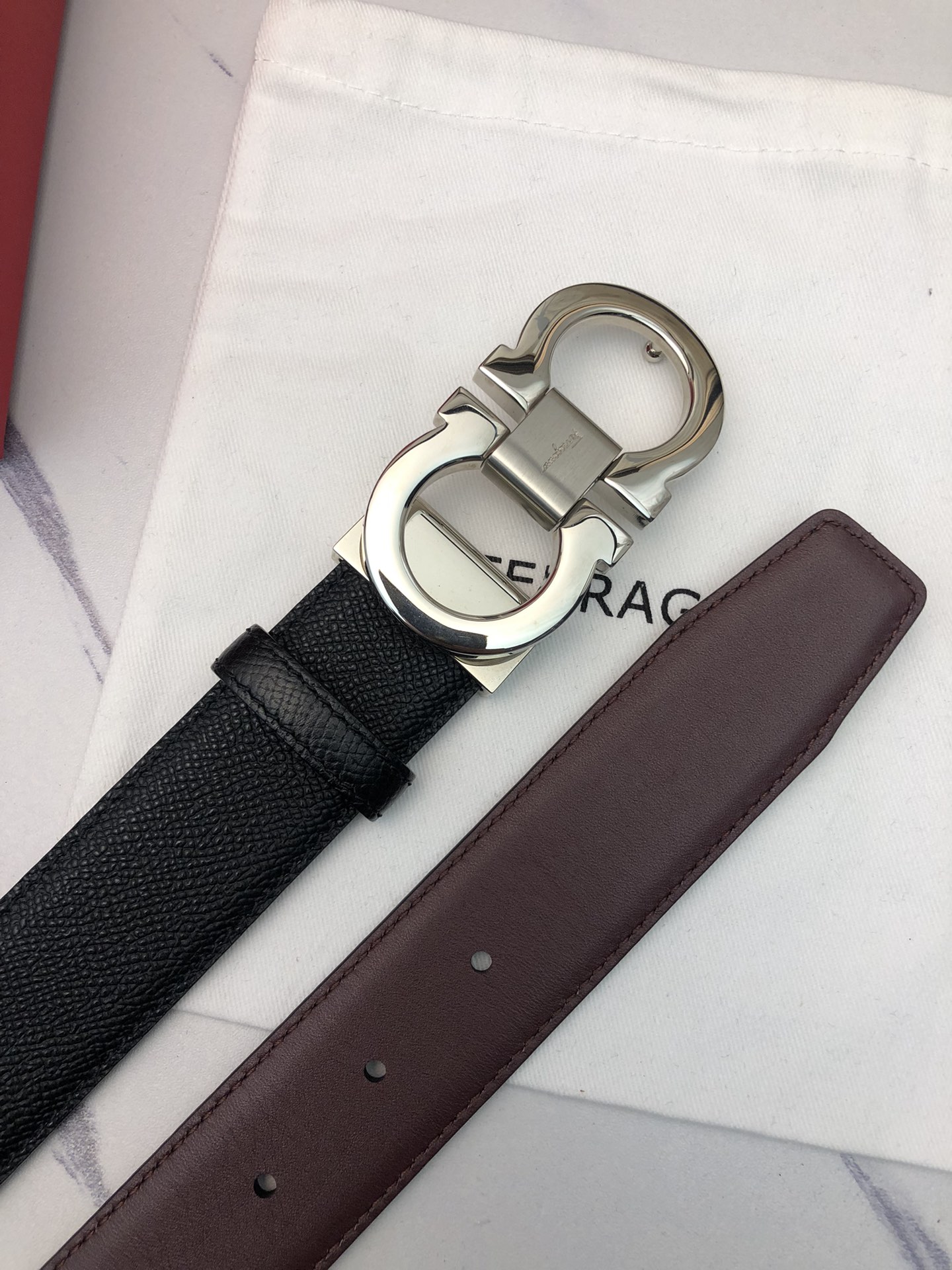 这款皮带是AAAAA 1:1 质量 (非常棒). 使用了和原版一模一样的材料. 商标部分也保持了和菲拉格慕/Salvatore Ferragamo一样. 图片拍摄是实物皮带拍摄, 您所收到的实物保证和我们图片一模一样.