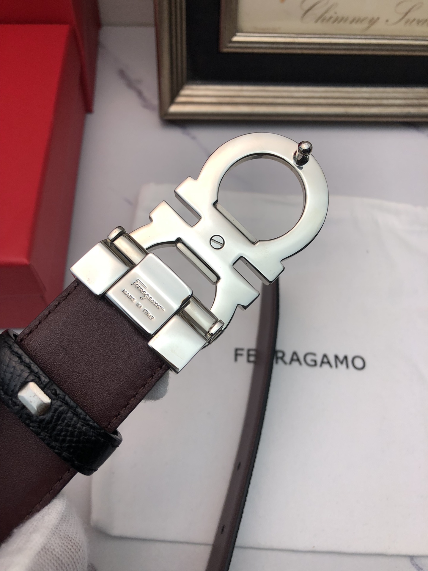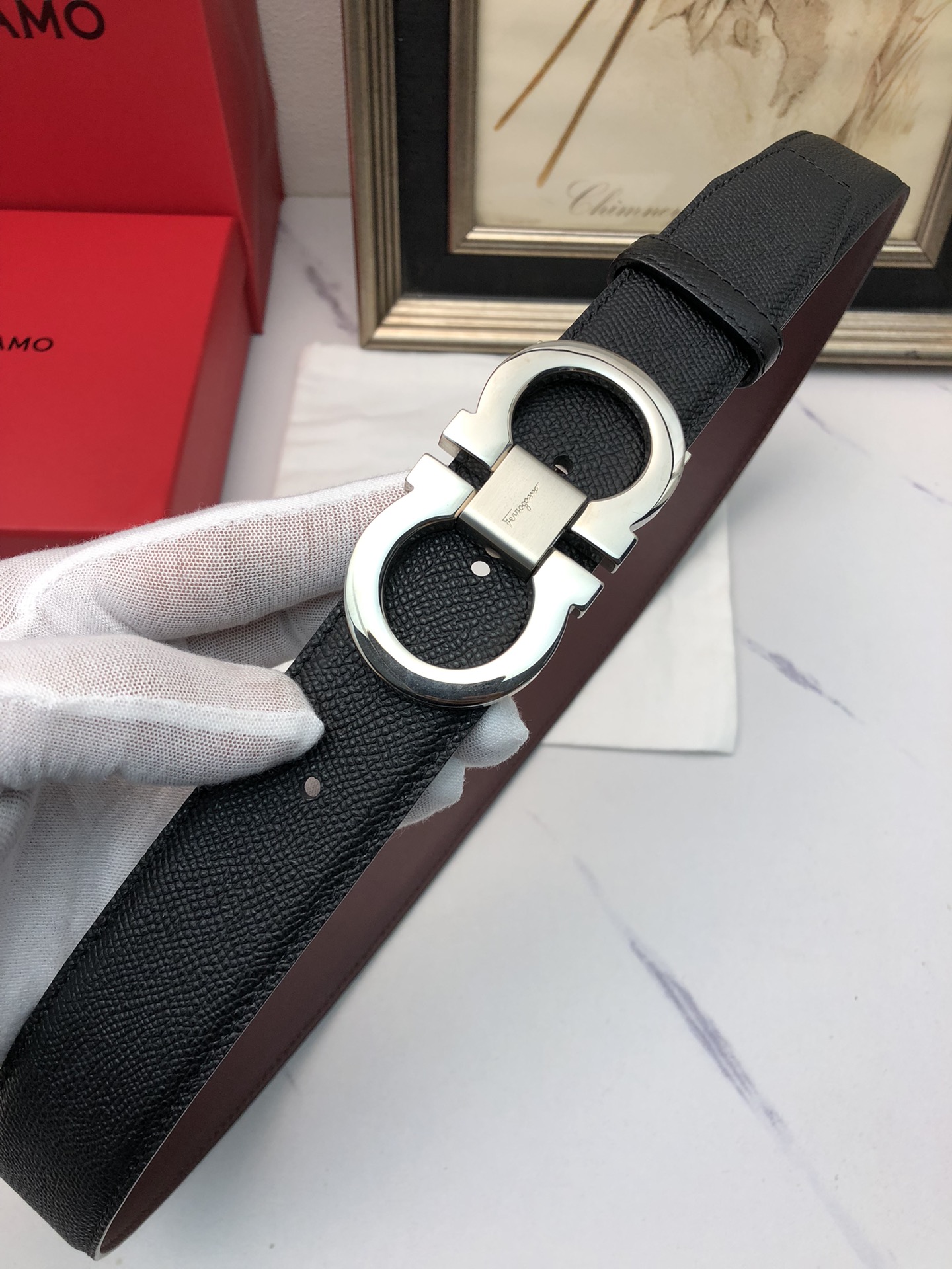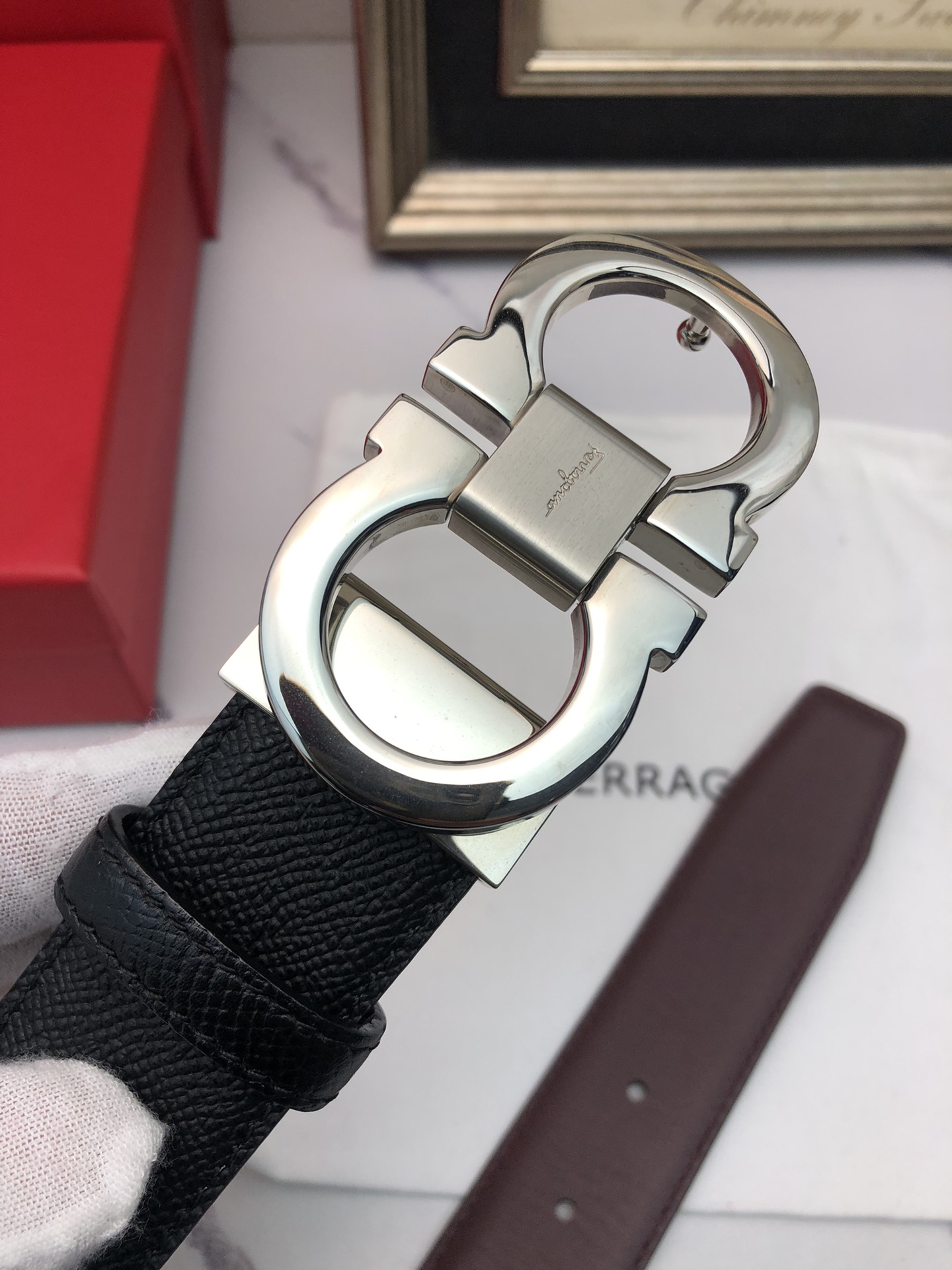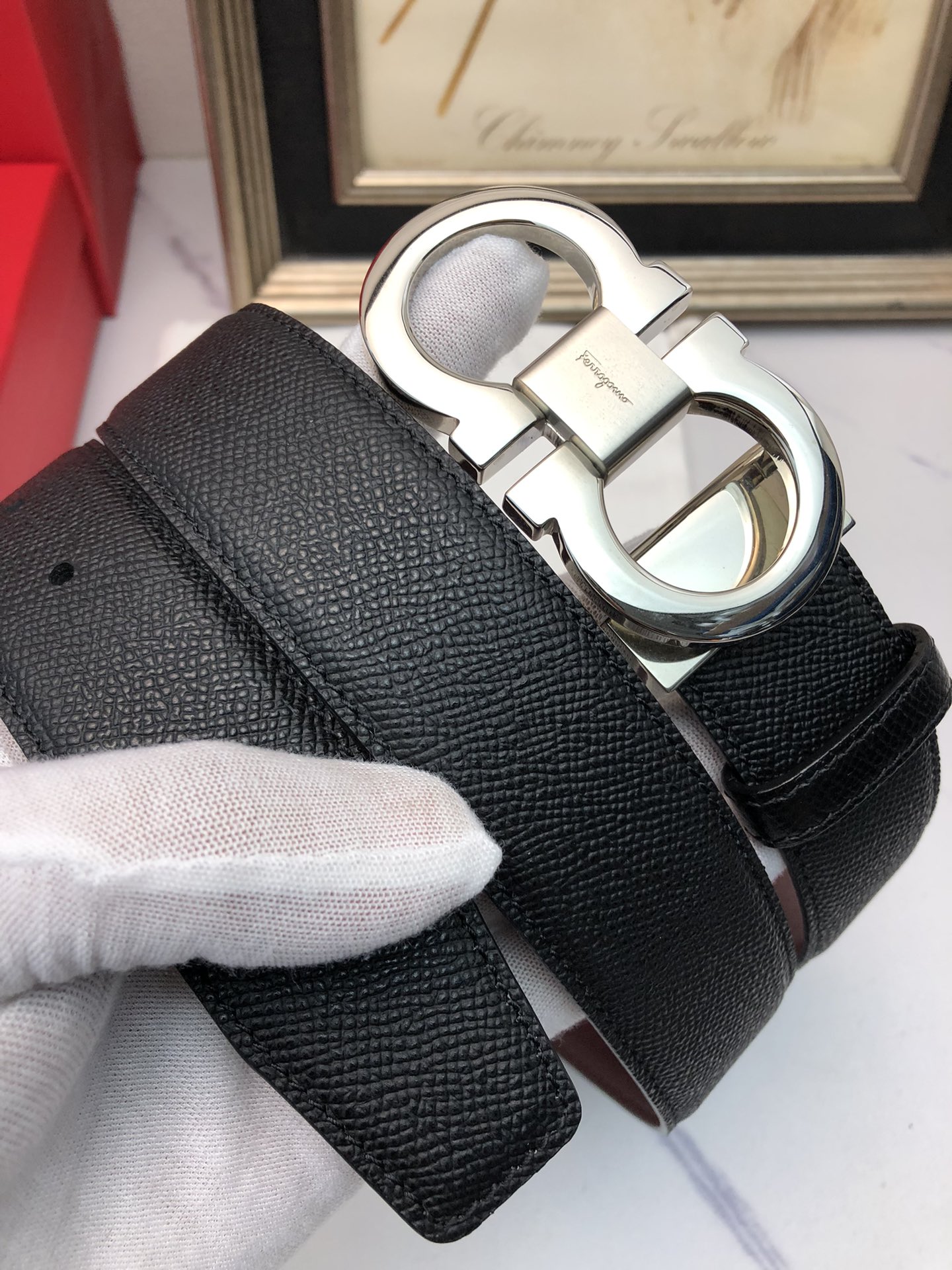 这款皮带是AAAAA 1:1 质量 (非常棒). 使用了和原版一模一样的材料. 商标部分也保持了和菲拉格慕/Salvatore Ferragamo一样. 图片拍摄是实物皮带拍摄, 您所收到的实物保证和我们图片一模一样.
