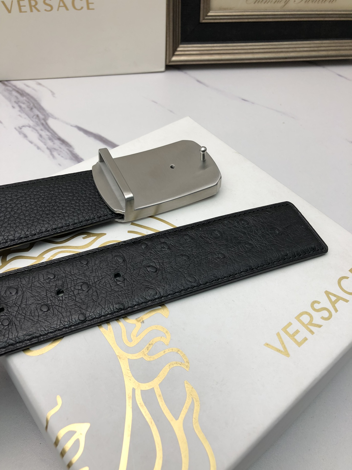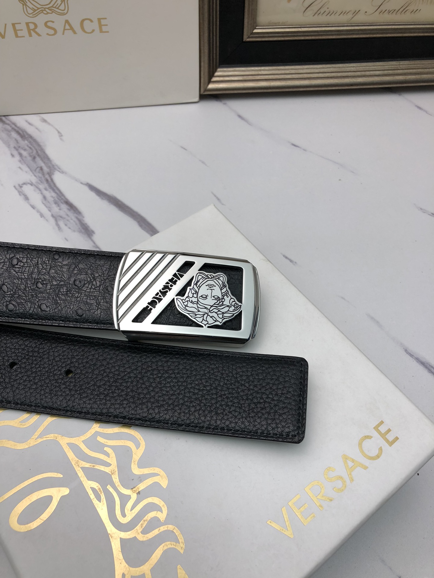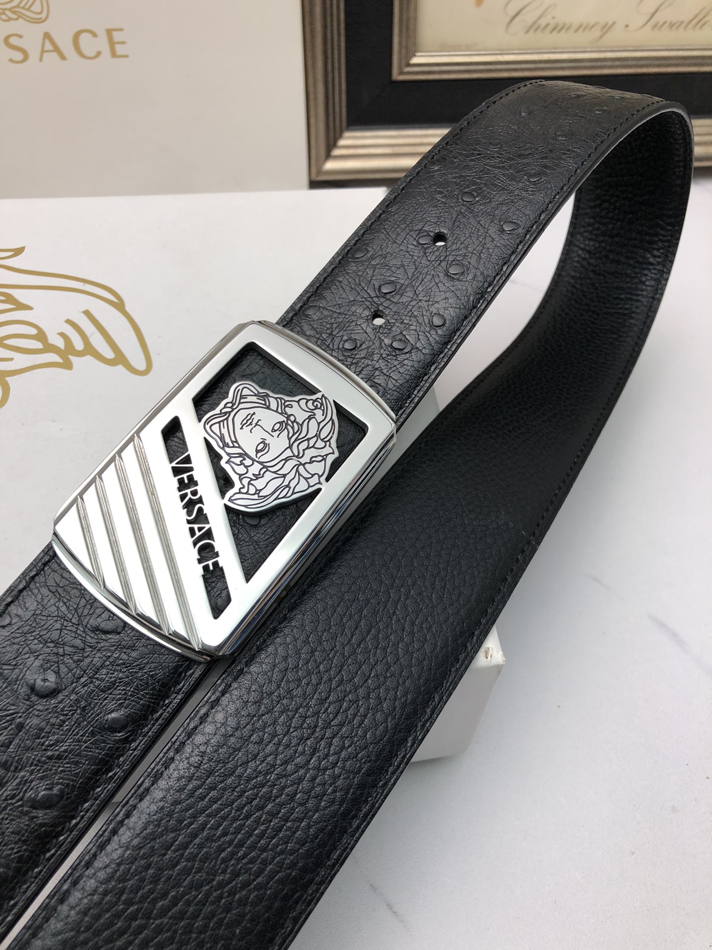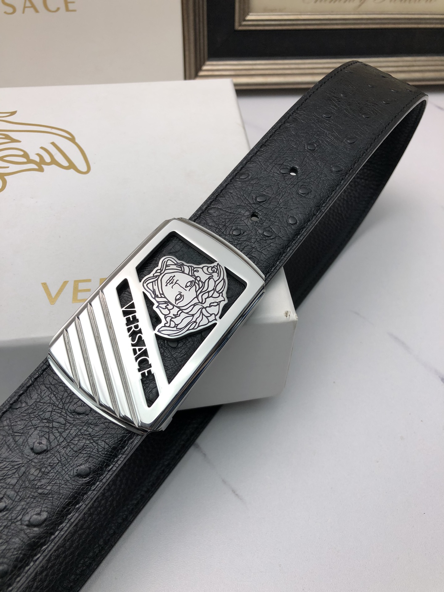 这款皮带是AAAAA 1:1 质量 (非常棒). 使用了和原版一模一样的材料. 商标部分也保持了和范思哲/Versace一样. 图片拍摄是实物皮带拍摄, 您所收到的实物保证和我们图片一模一样.