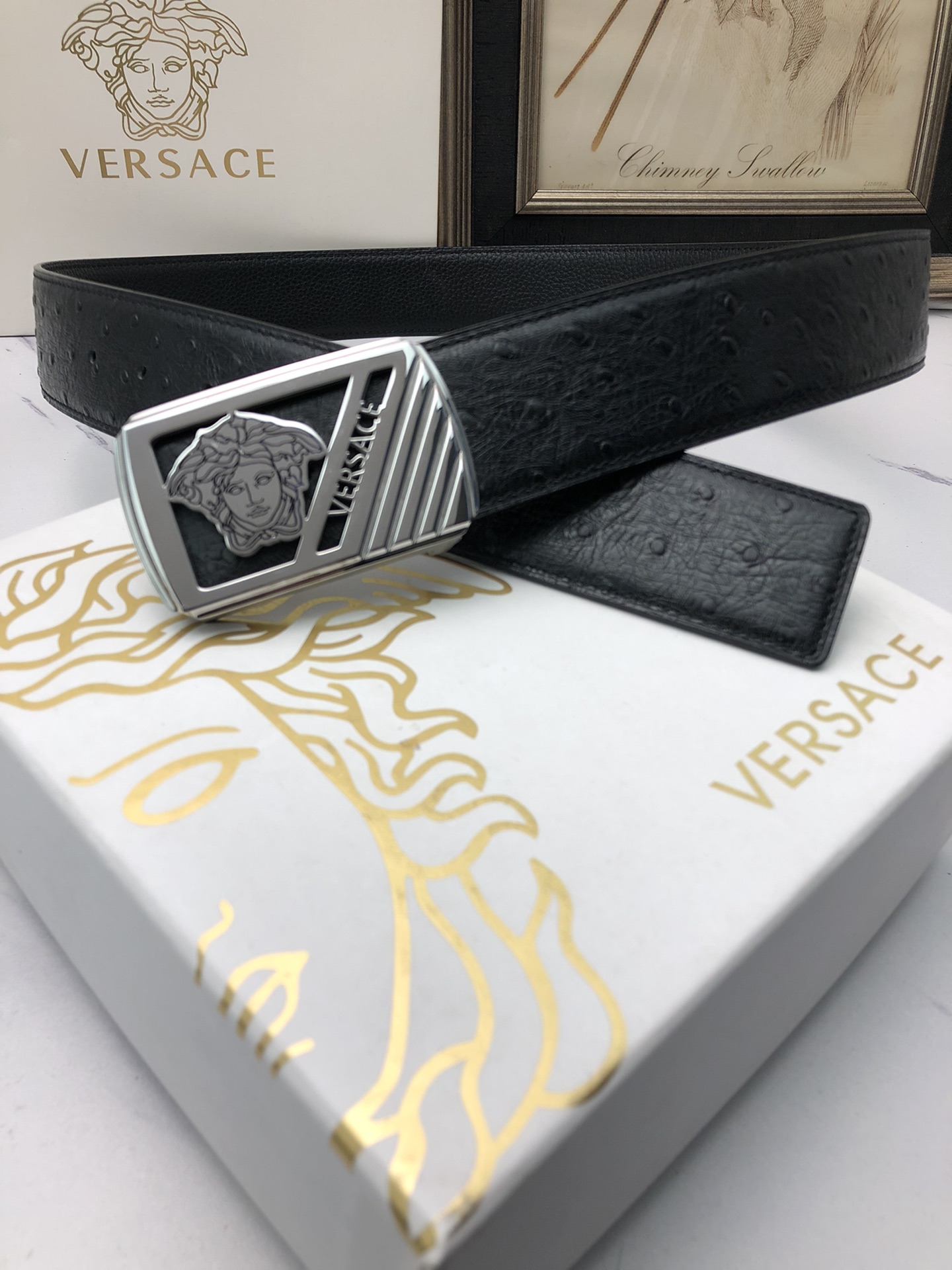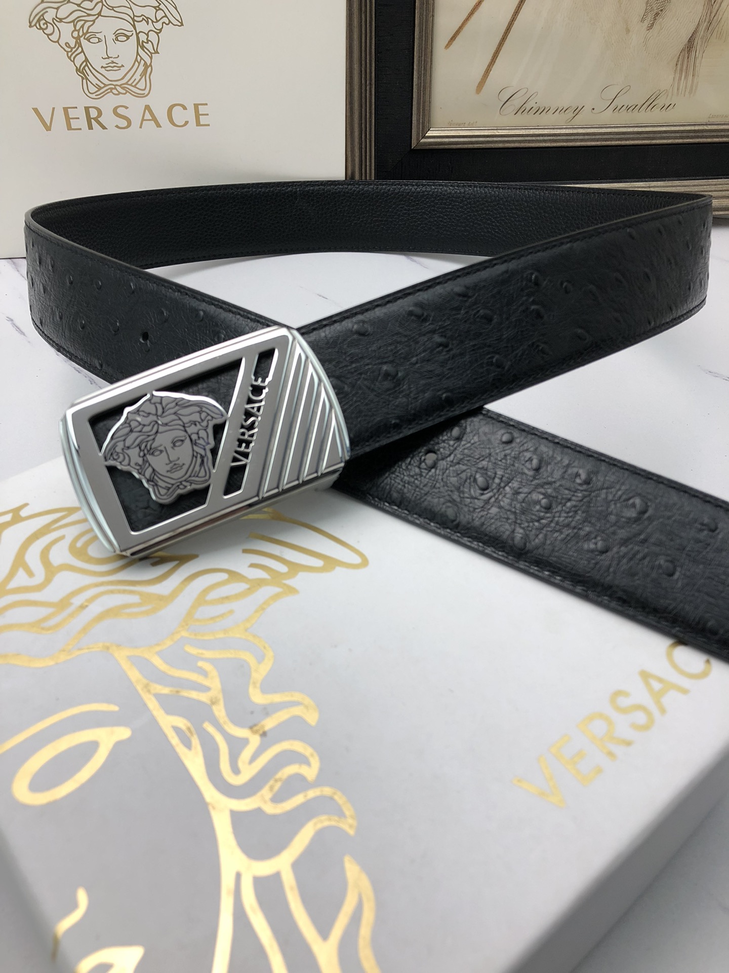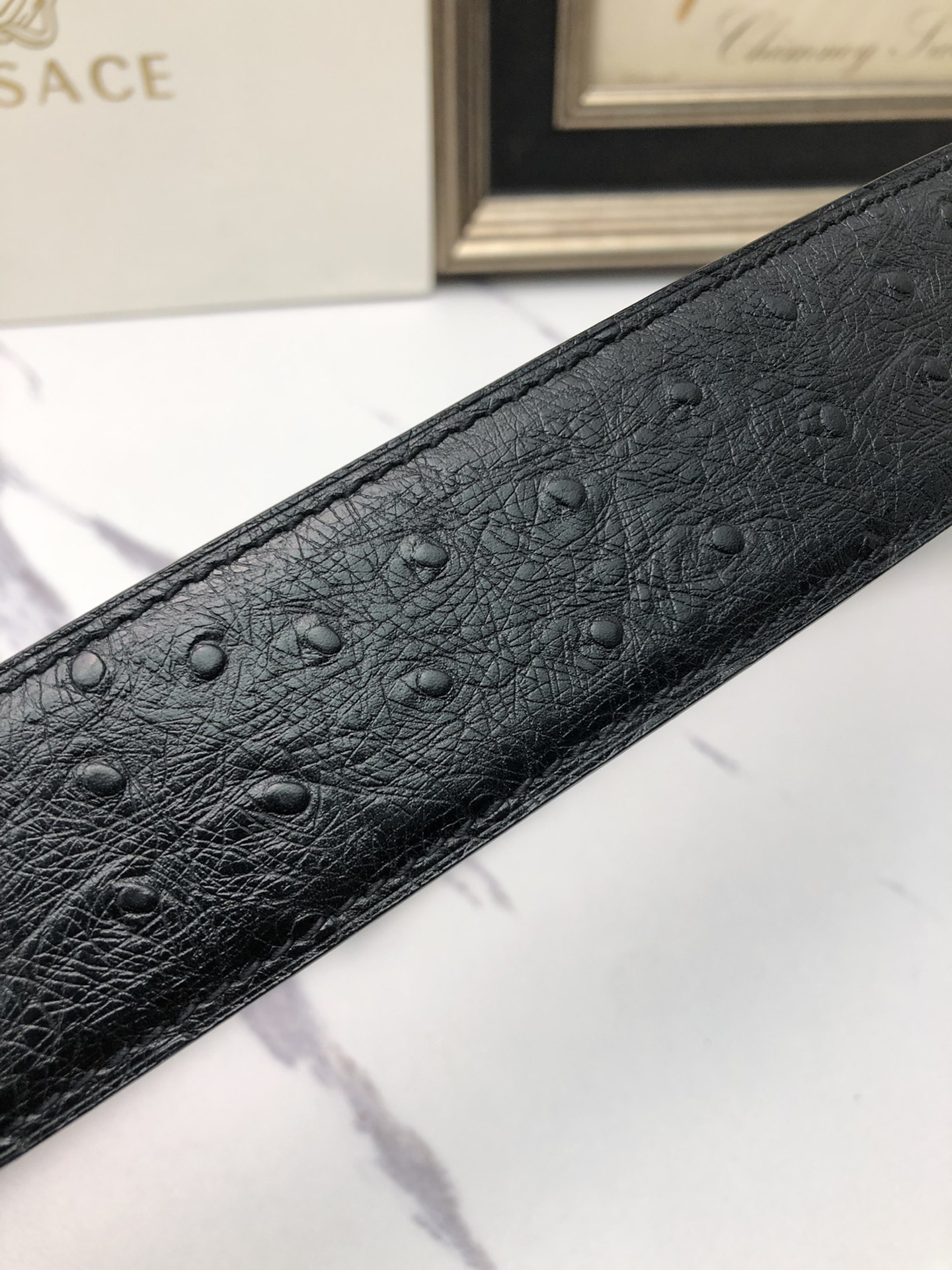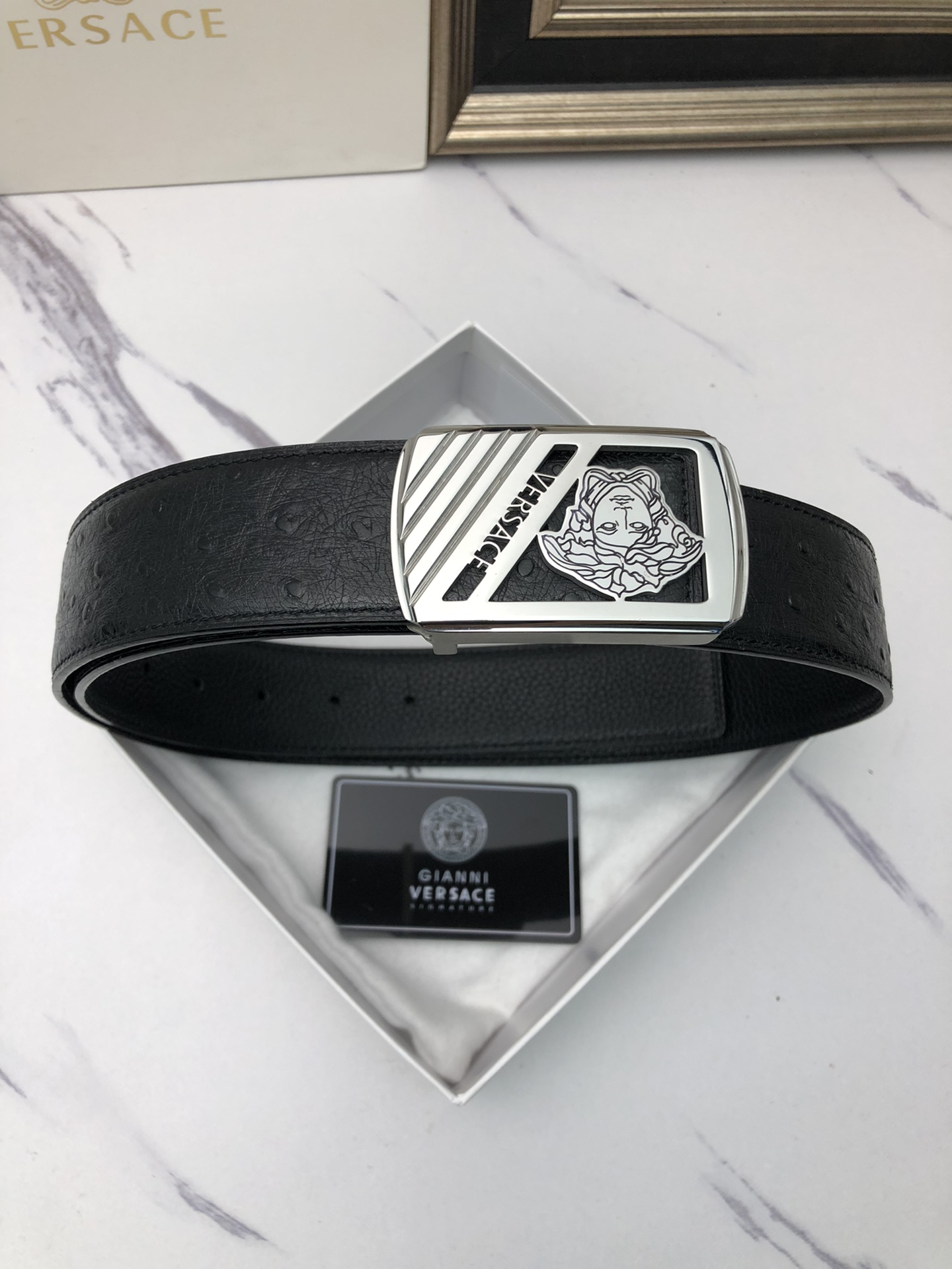 这款皮带是AAAAA 1:1 质量 (非常棒). 使用了和原版一模一样的材料. 商标部分也保持了和范思哲/Versace一样. 图片拍摄是实物皮带拍摄, 您所收到的实物保证和我们图片一模一样.