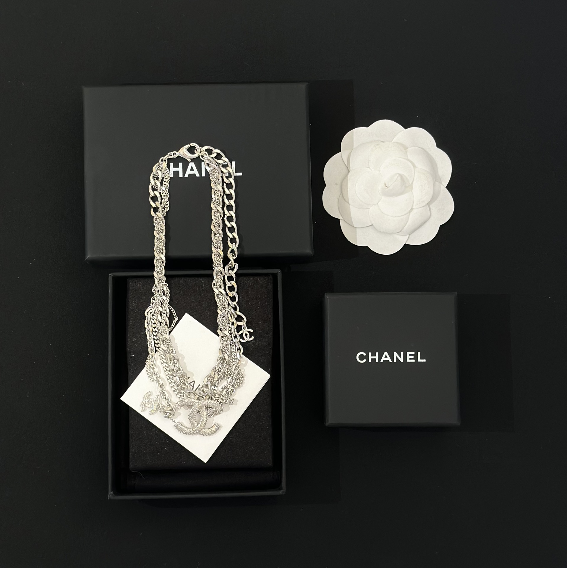 这款首饰是AAAAA 1:1 质量 (非常棒). 使用了和原版一模一样的材料. 商标部分也保持了和香奈儿/Chanel一样. 图片拍摄是实物首饰拍摄, 您所收到的实物保证和我们图片一模一样.
