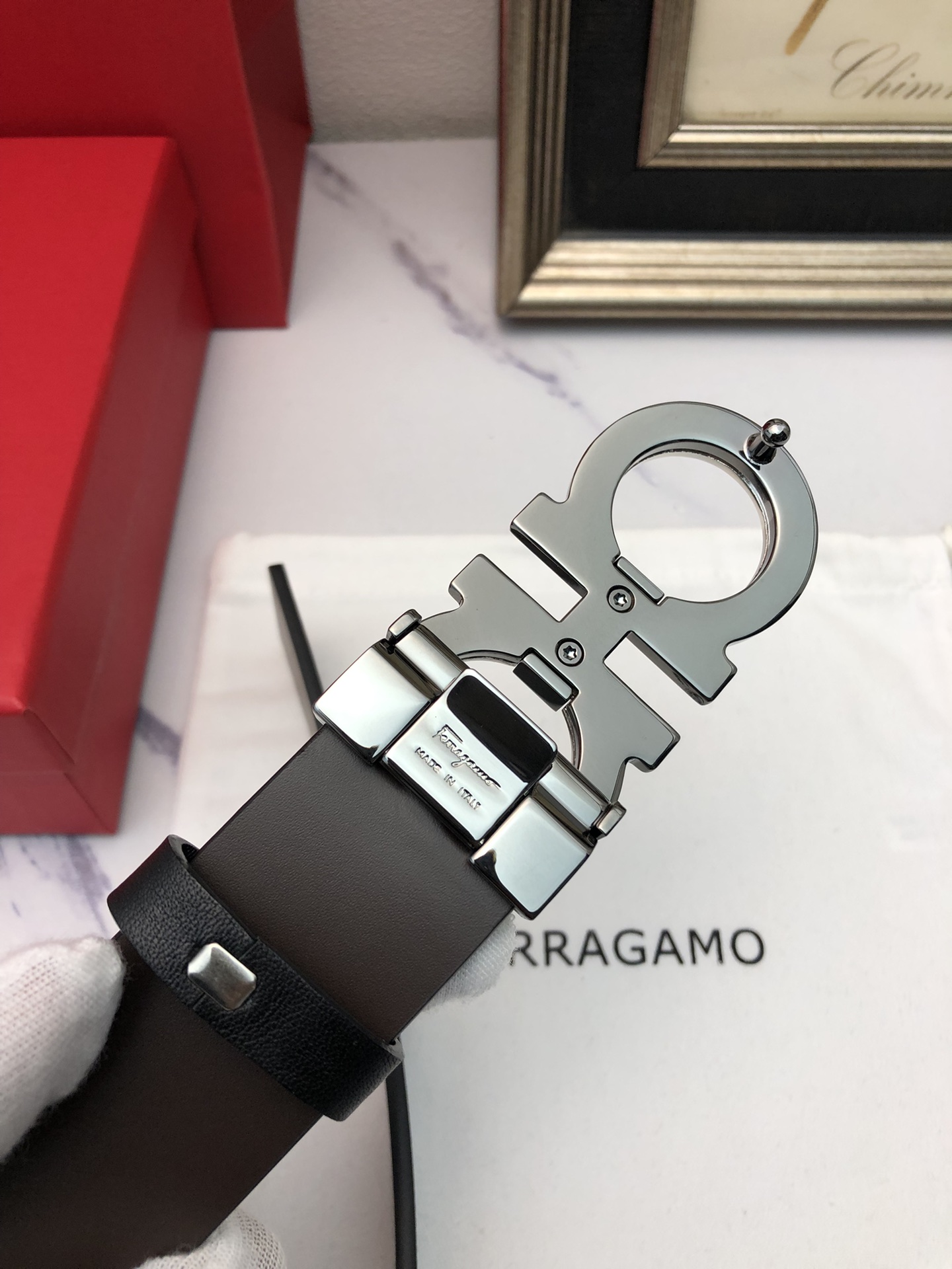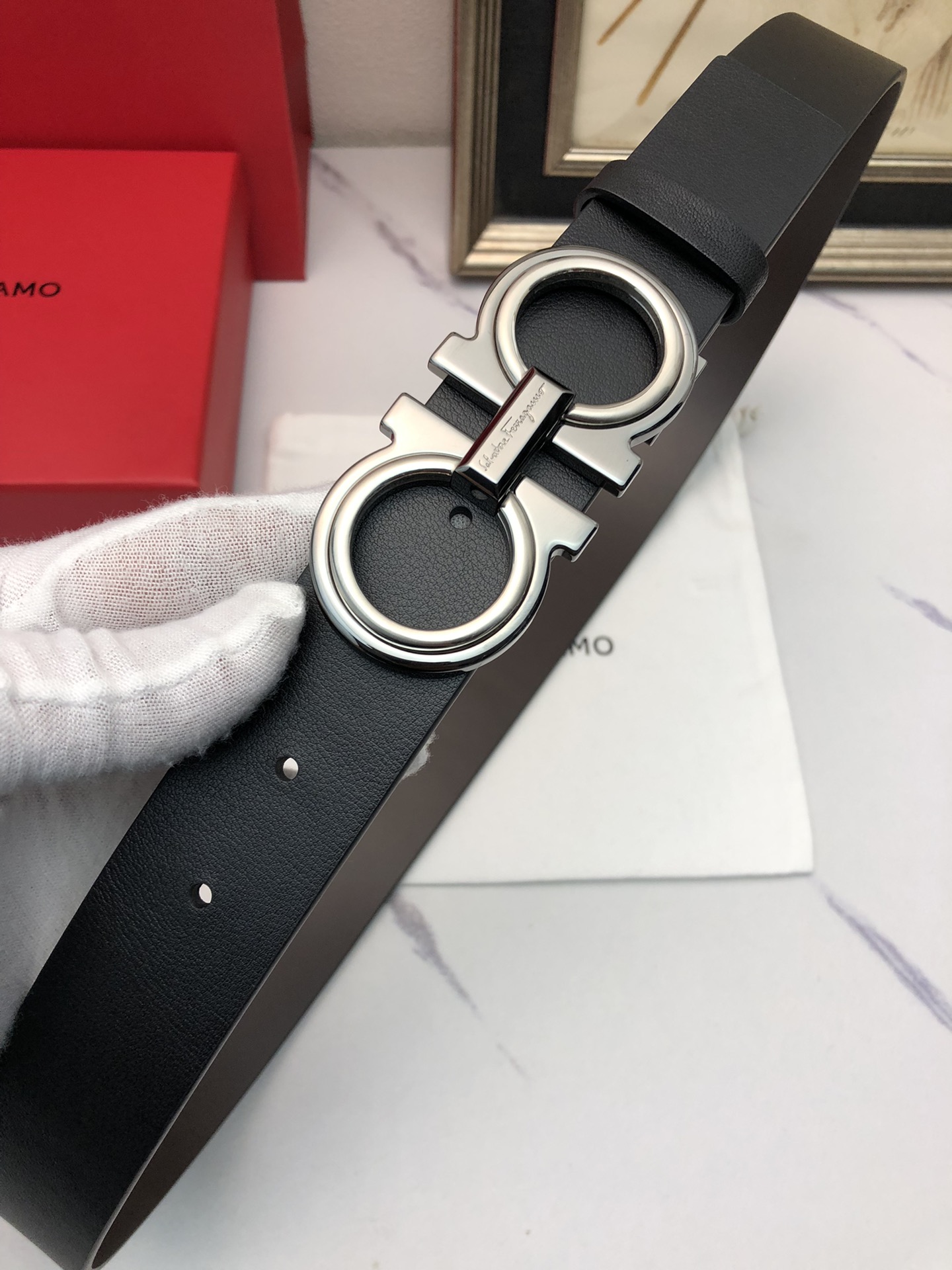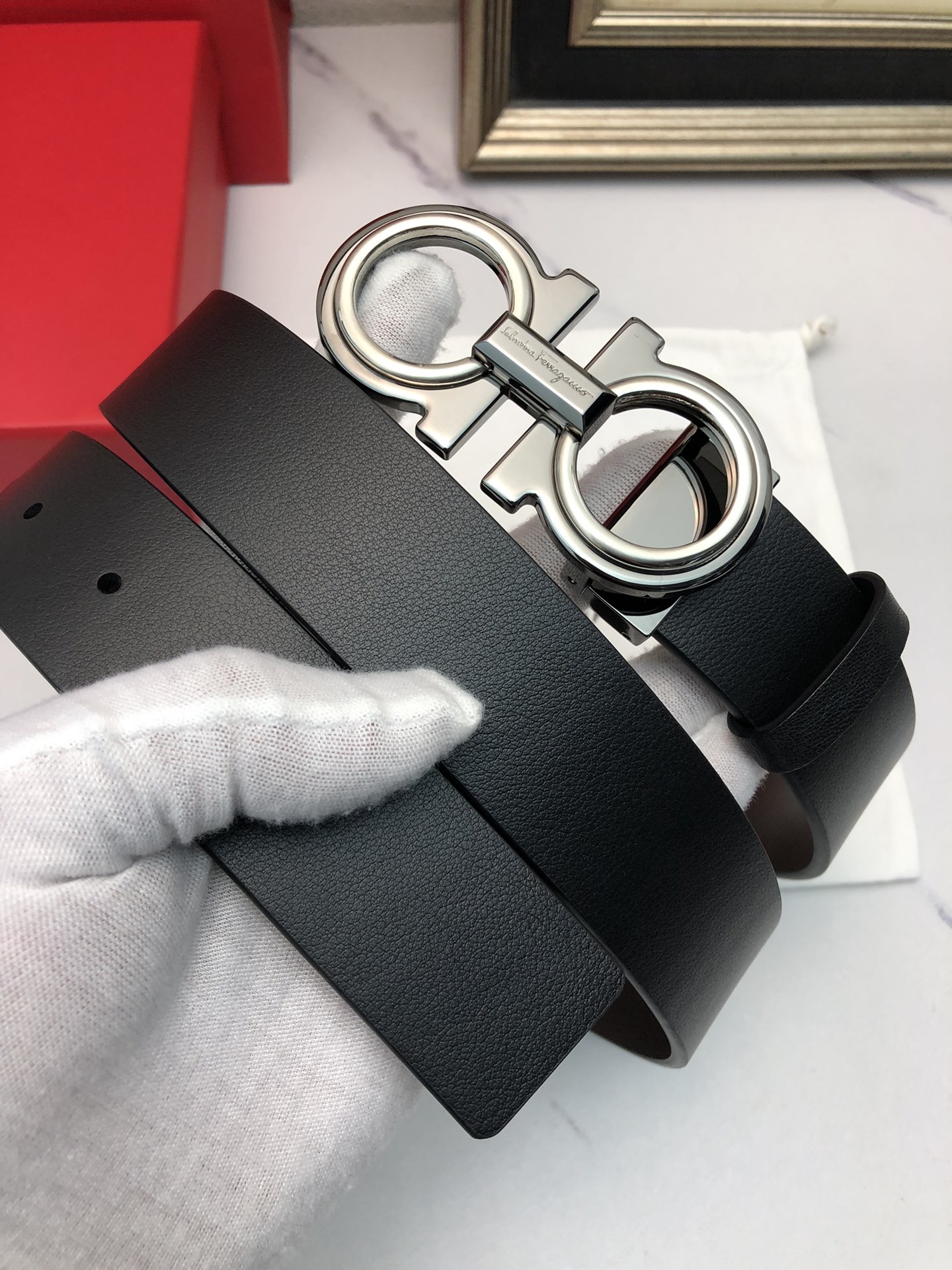 这款皮带是AAAAA 1:1 质量 (非常棒). 使用了和原版一模一样的材料. 商标部分也保持了和菲拉格慕/Salvatore Ferragamo一样. 图片拍摄是实物皮带拍摄, 您所收到的实物保证和我们图片一模一样.