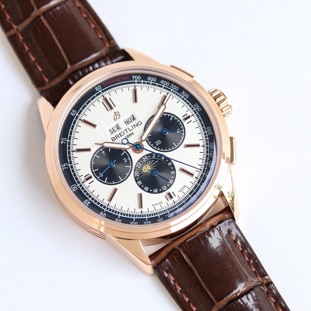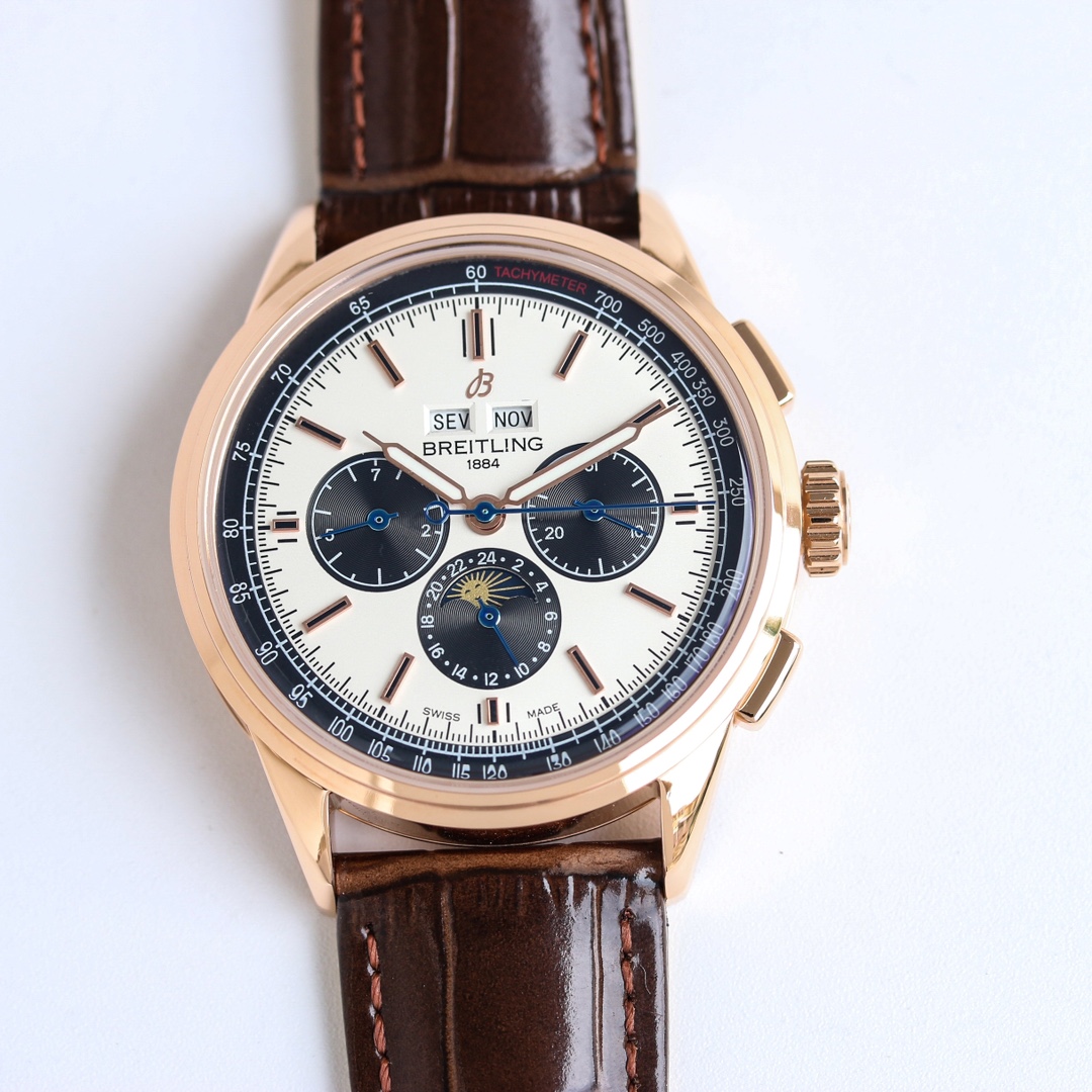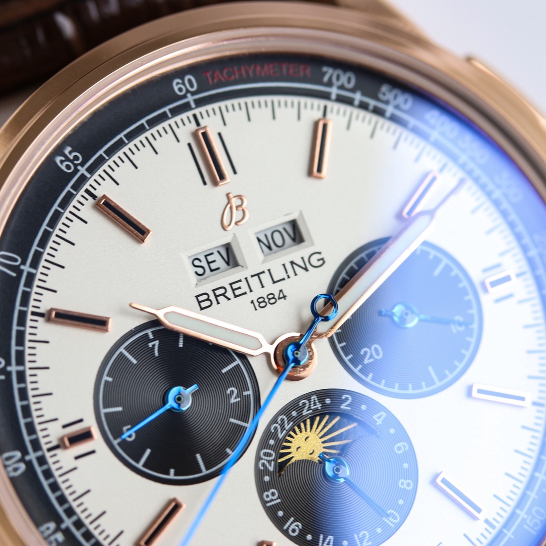 这款手表是AAAAA 1:1 质量 (非常棒). 使用了和原版一模一样的材料. 商标部分也保持了和Breitling一样. 图片拍摄是实物手表拍摄, 您所收到的实物保证和我们图片一模一样.
