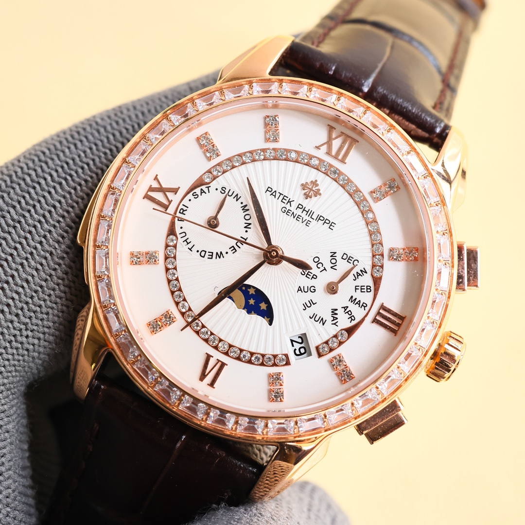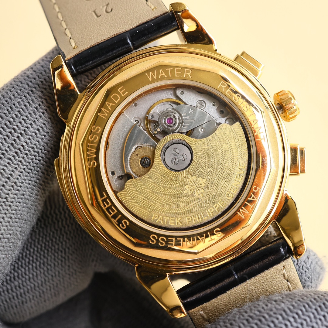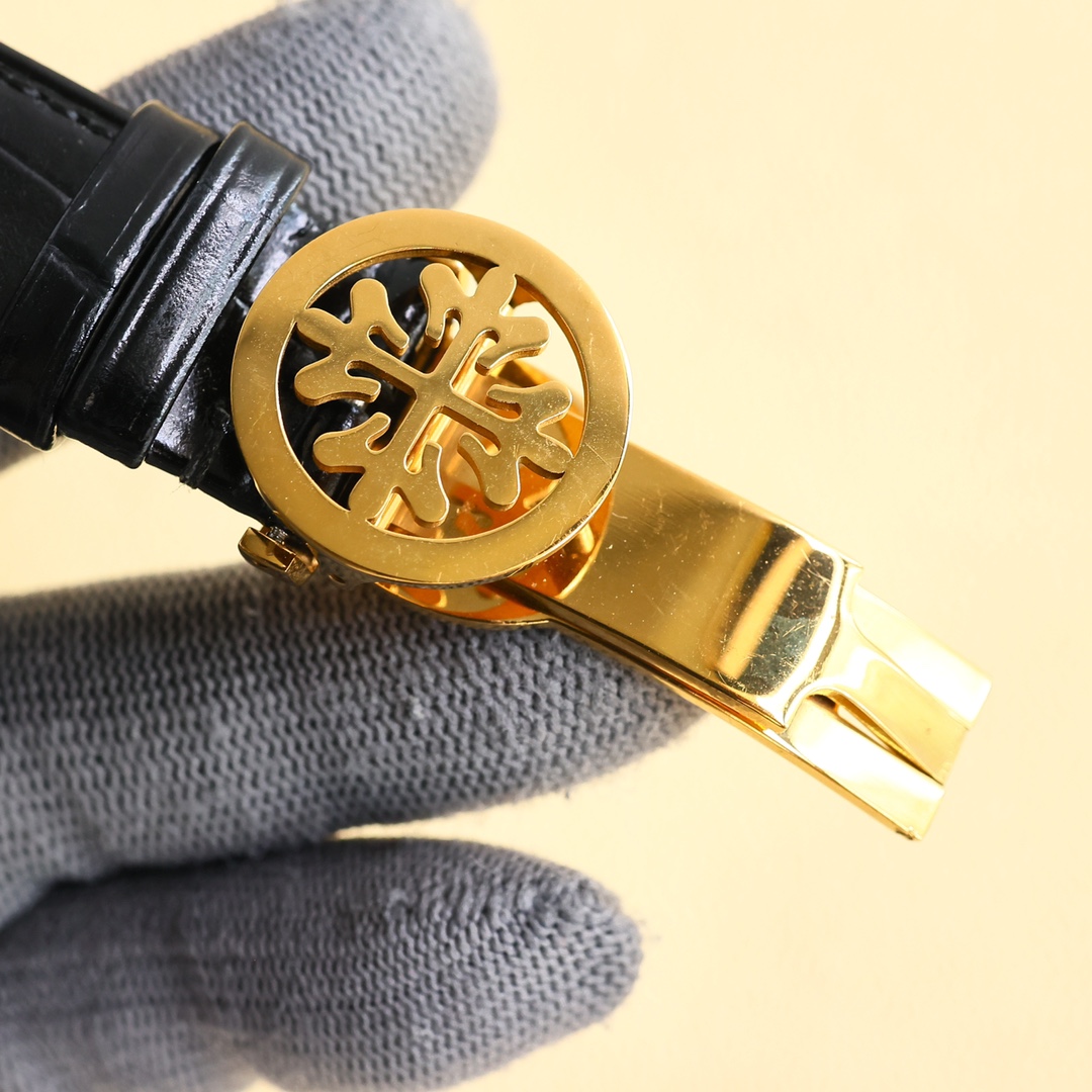 这款手表是AAAAA 1:1 质量 (非常棒). 使用了和原版一模一样的材料. 商标部分也保持了和百达翡丽/Patek Philippe一样. 图片拍摄是实物手表拍摄, 您所收到的实物保证和我们图片一模一样.