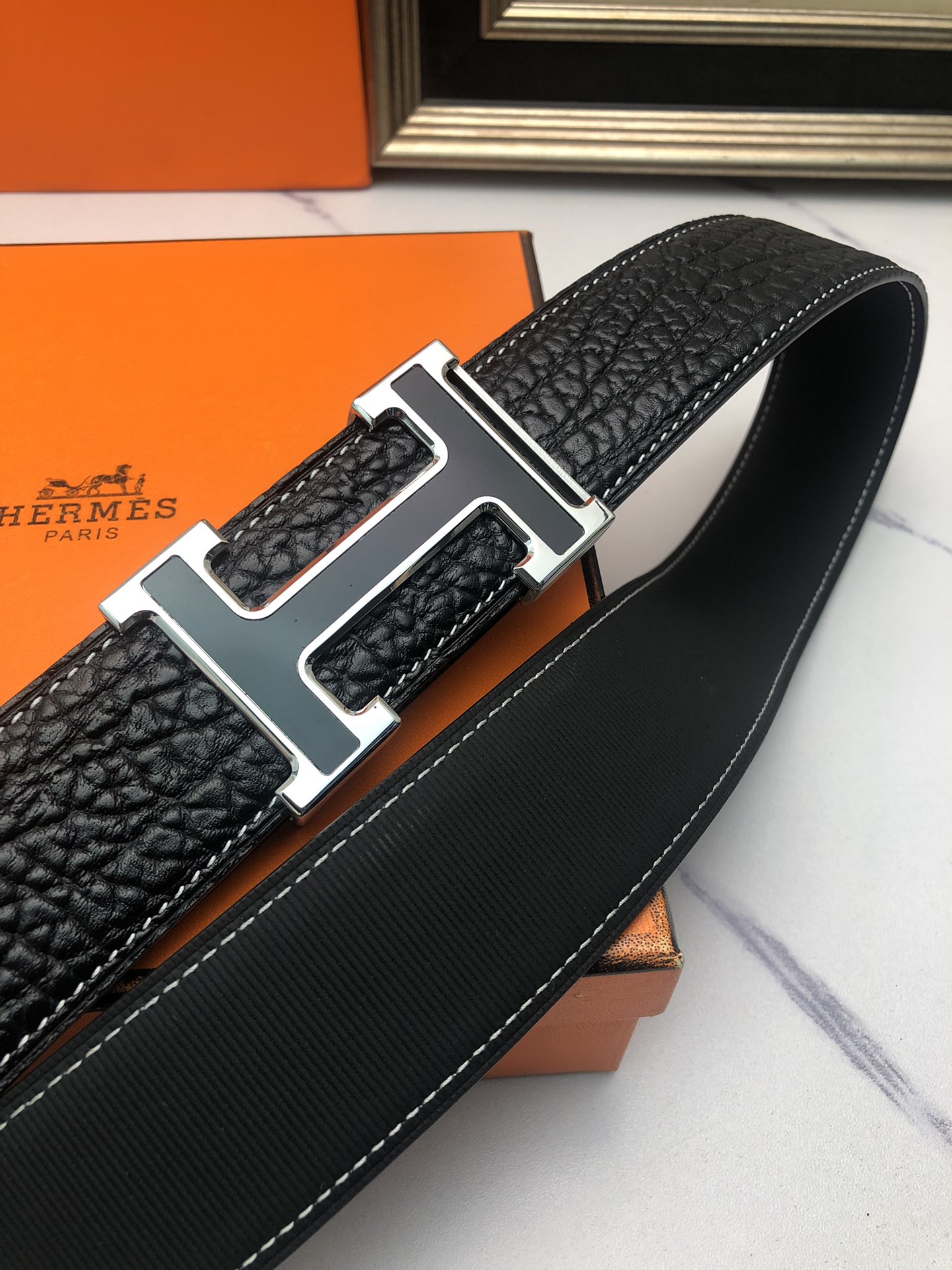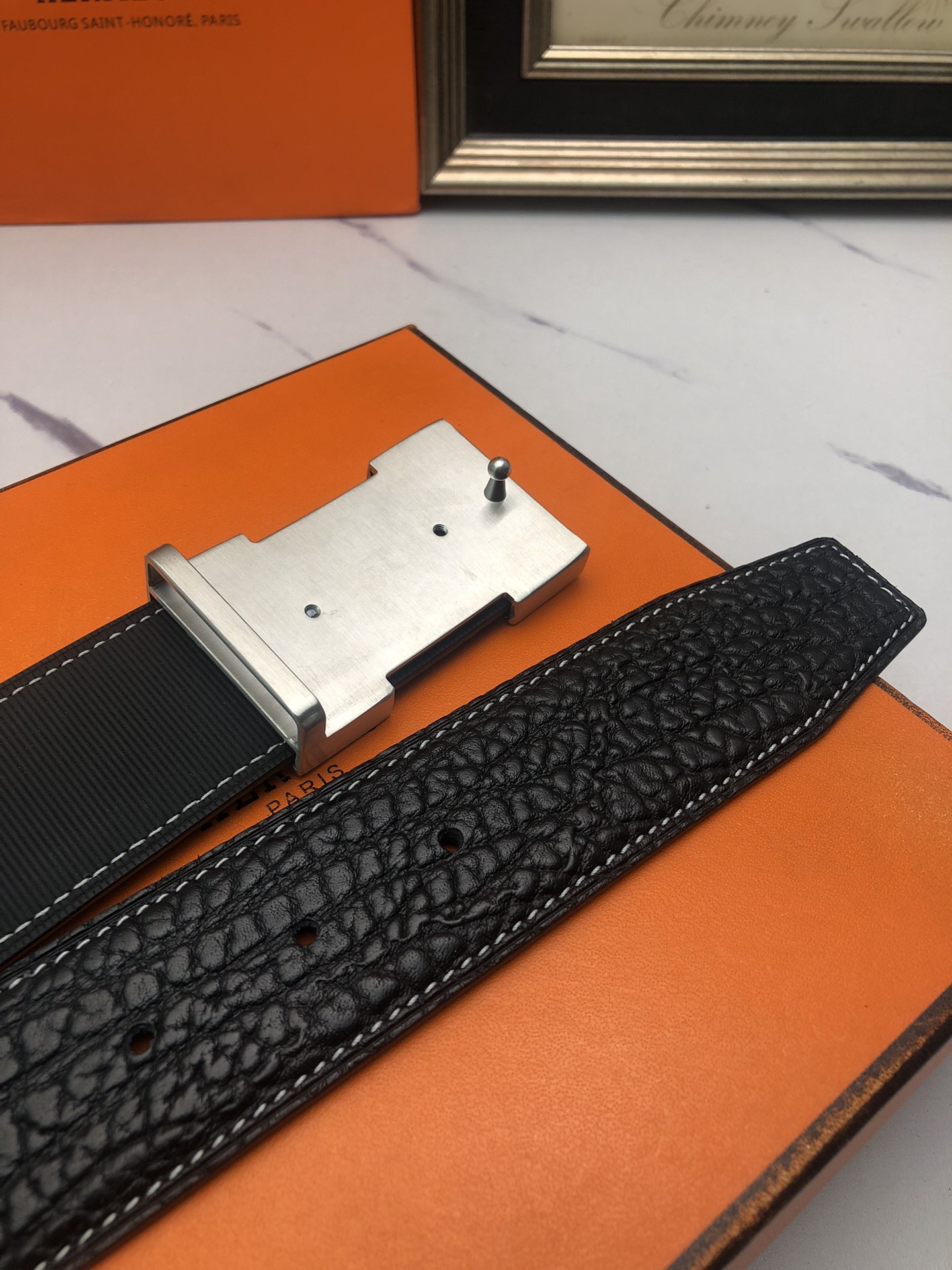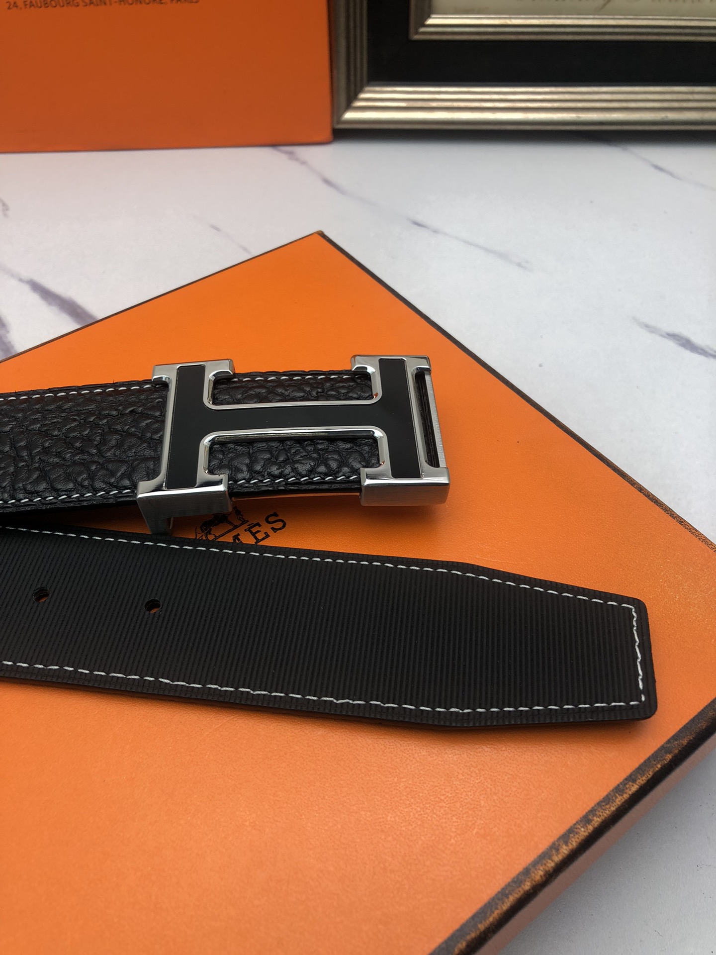 这款皮带是AAAAA 1:1 质量 (非常棒). 使用了和原版一模一样的材料. 商标部分也保持了和爱马仕/Hermes一样. 图片拍摄是实物皮带拍摄, 您所收到的实物保证和我们图片一模一样.