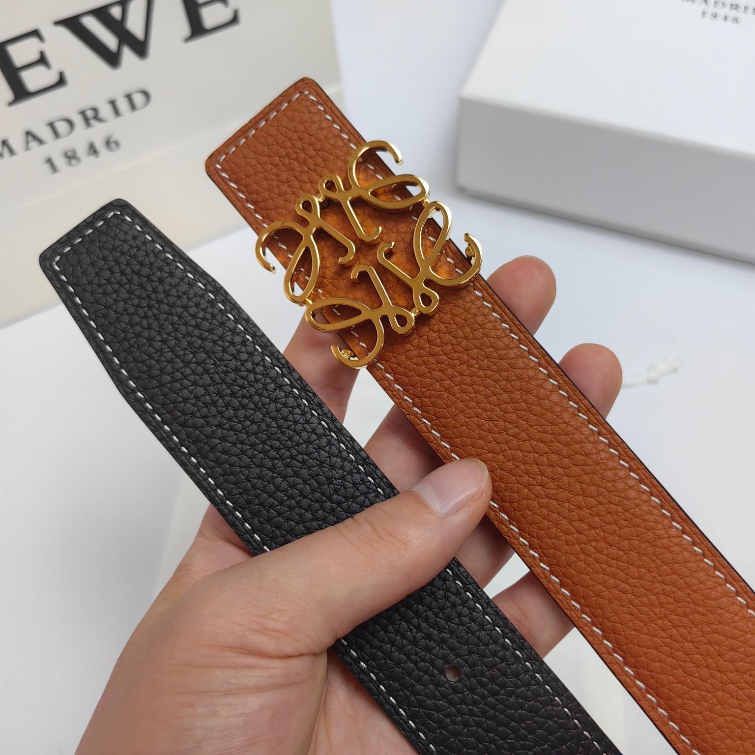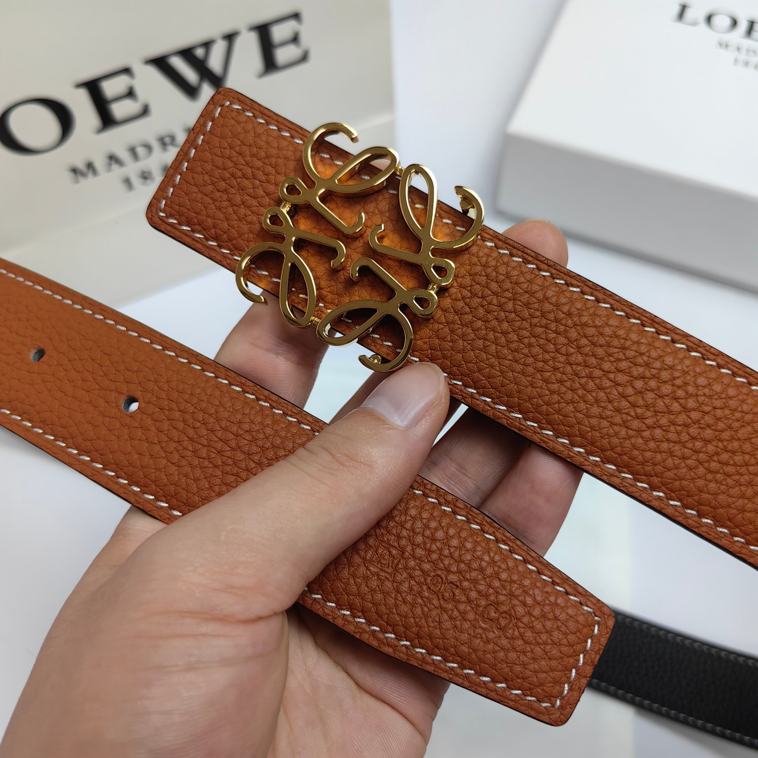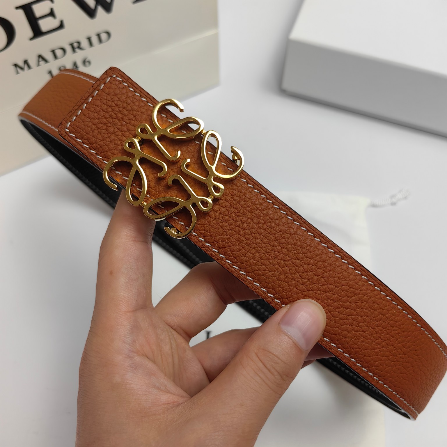这款皮带是AAAAA 1:1 质量 (非常棒). 使用了和原版一模一样的材料. 商标部分也保持了和罗意威/Loewe一样. 图片拍摄是实物皮带拍摄, 您所收到的实物保证和我们图片一模一样.