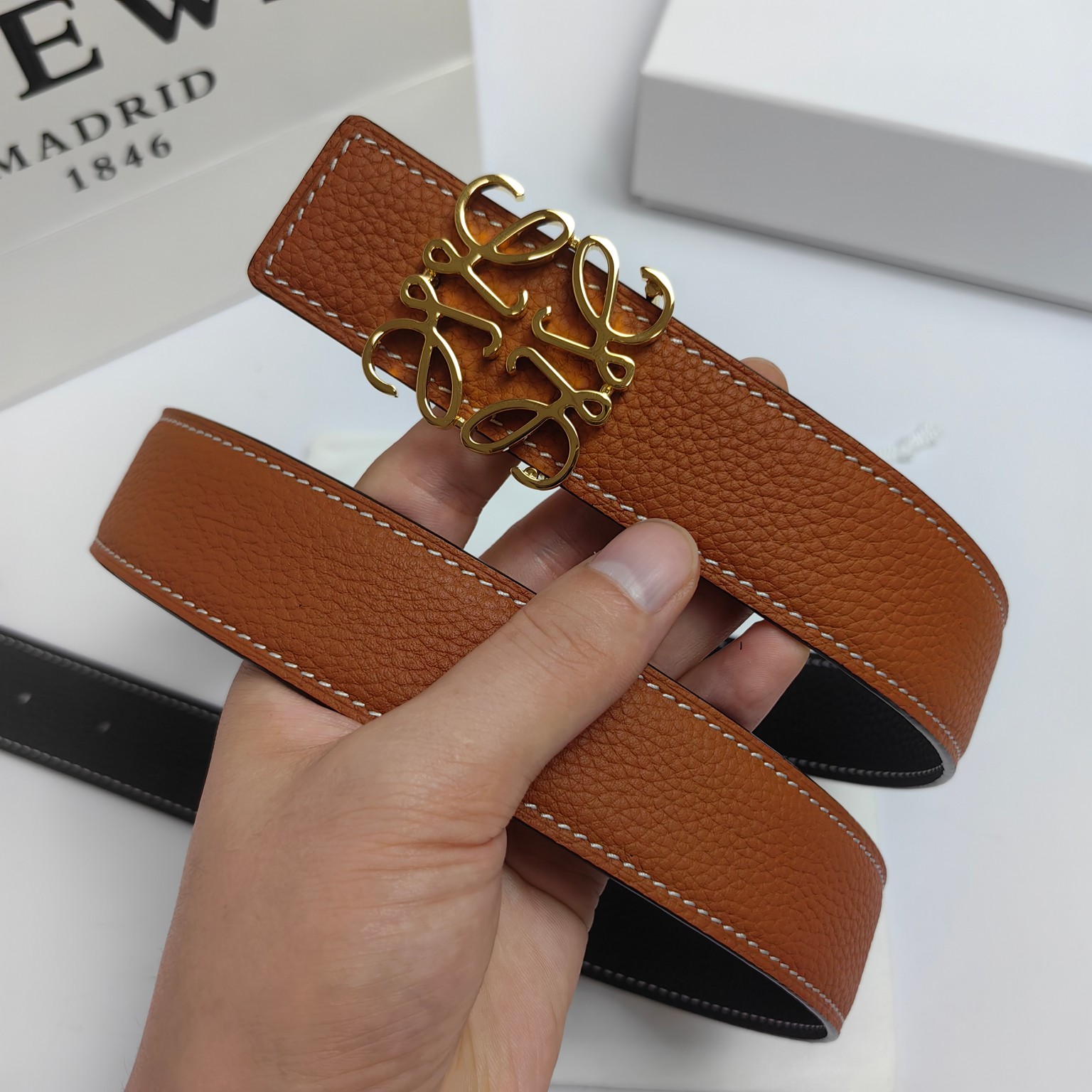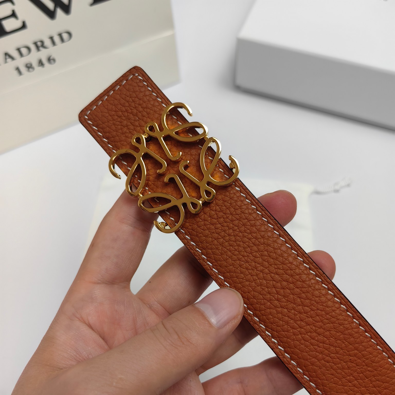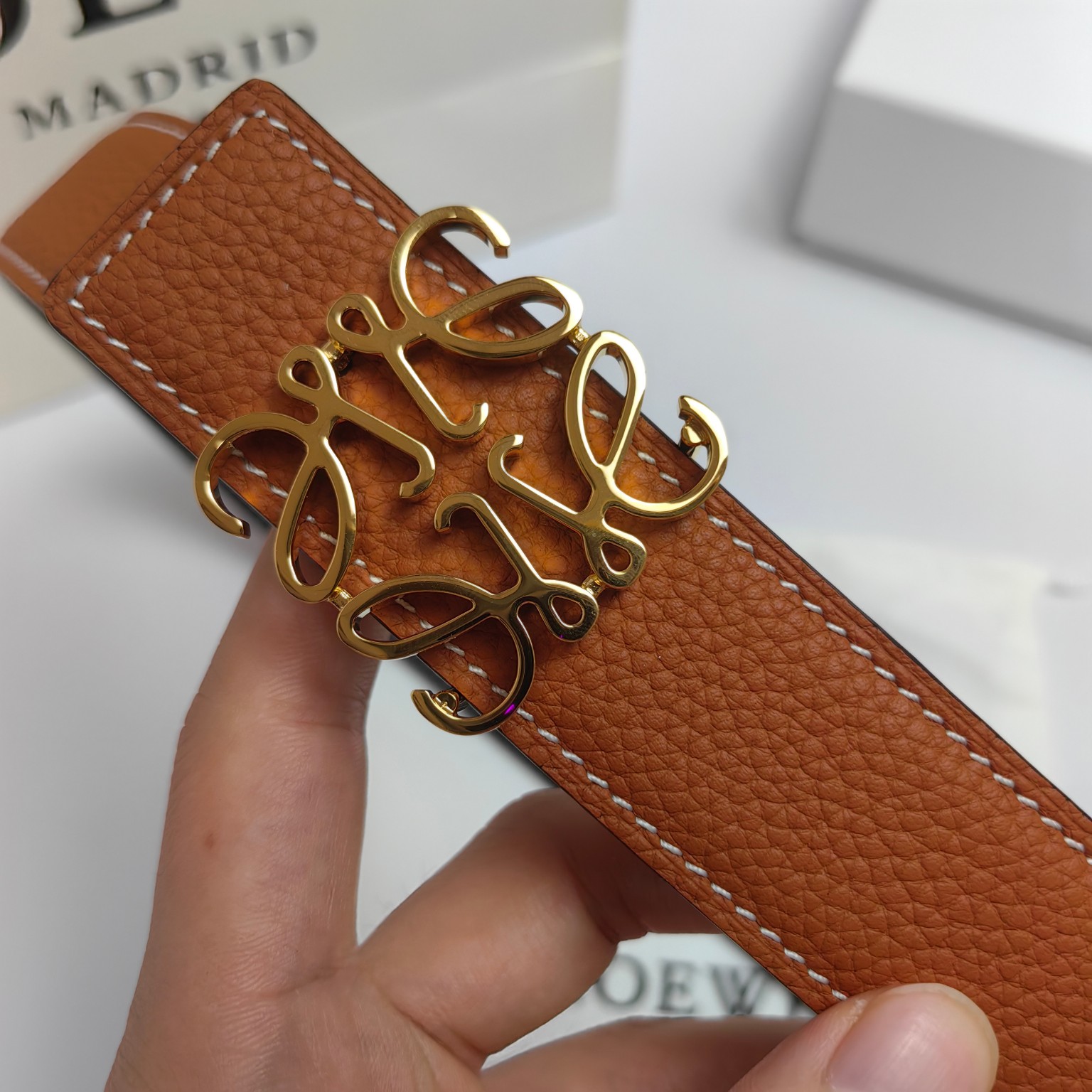 这款皮带是AAAAA 1:1 质量 (非常棒). 使用了和原版一模一样的材料. 商标部分也保持了和罗意威/Loewe一样. 图片拍摄是实物皮带拍摄, 您所收到的实物保证和我们图片一模一样.
