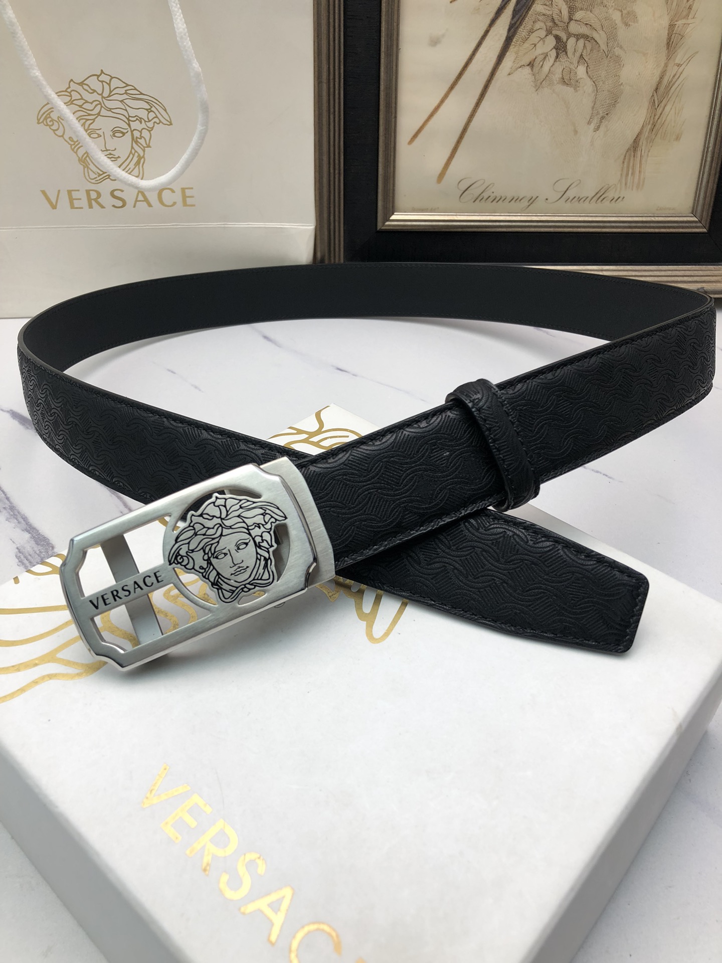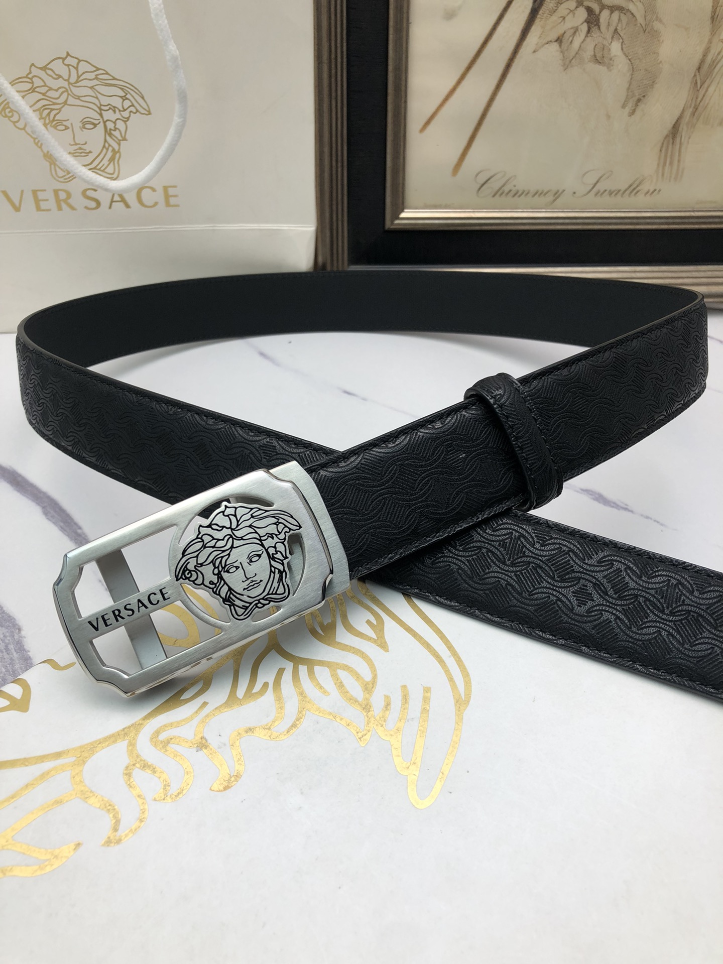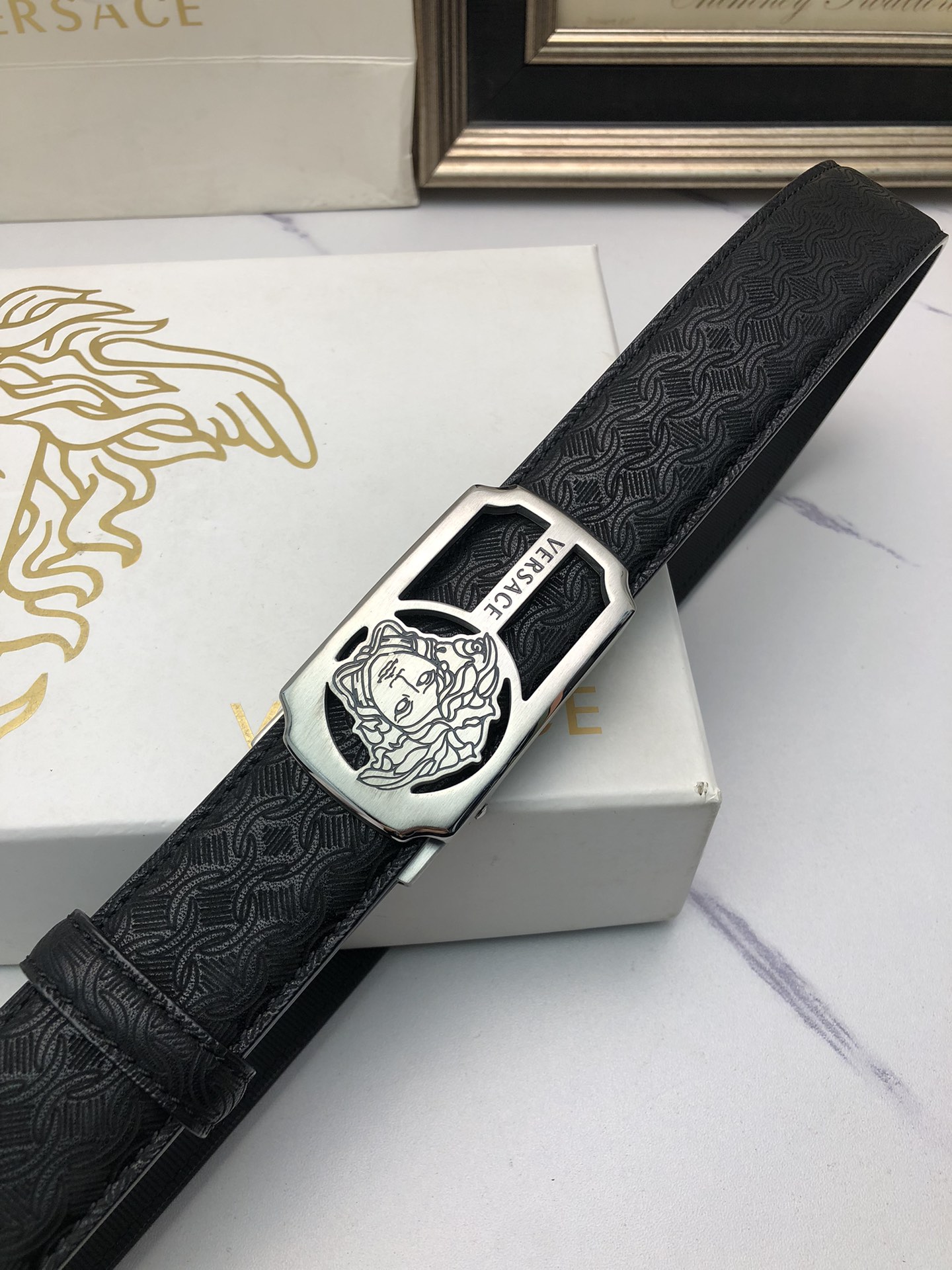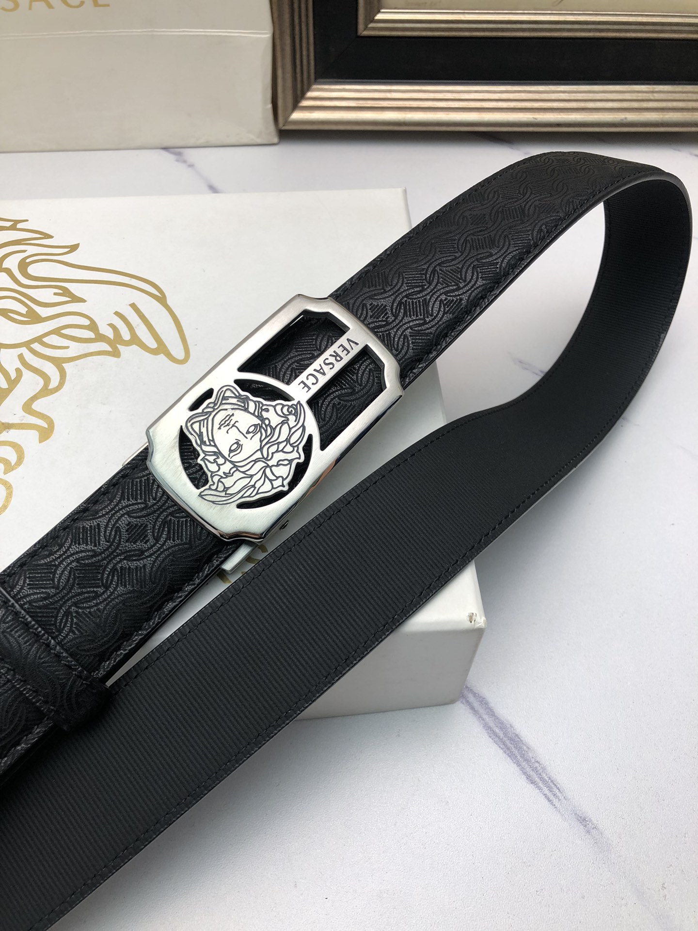 这款皮带是AAAAA 1:1 质量 (非常棒). 使用了和原版一模一样的材料. 商标部分也保持了和范思哲/Versace一样. 图片拍摄是实物皮带拍摄, 您所收到的实物保证和我们图片一模一样.