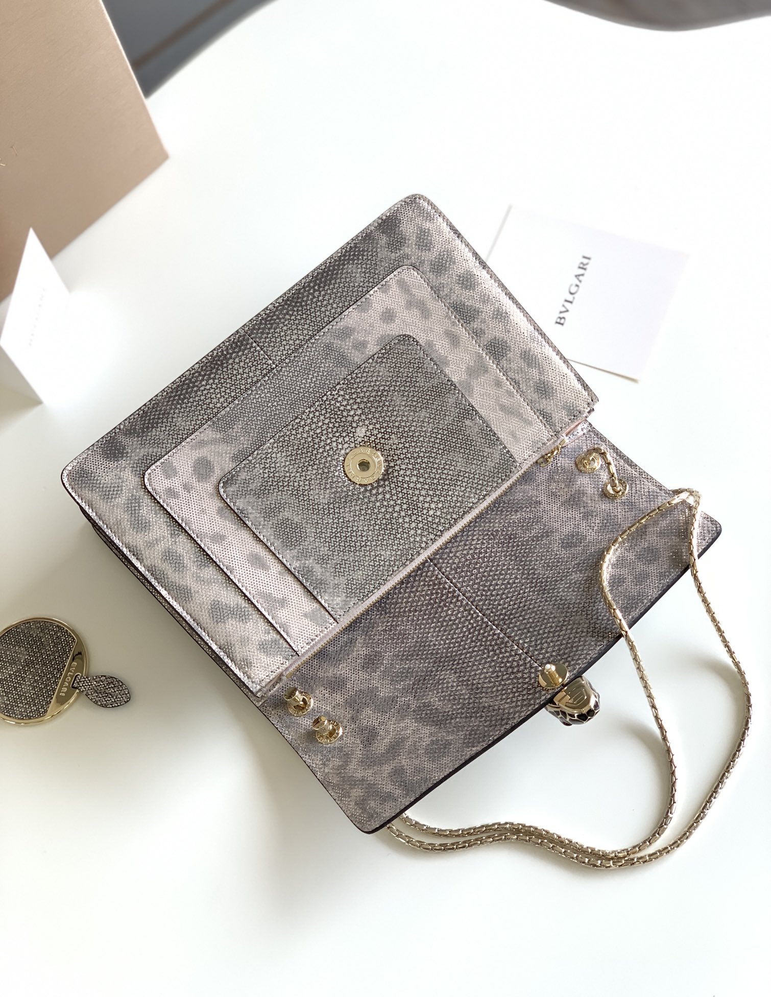 这款包包是AAAAA 1:1 质量 (非常棒). 使用了和原版一模一样的材料. 商标部分也保持了和宝格丽/Bulgari一样. 图片拍摄是实物包包拍摄, 您所收到的实物保证和我们图片一模一样.
