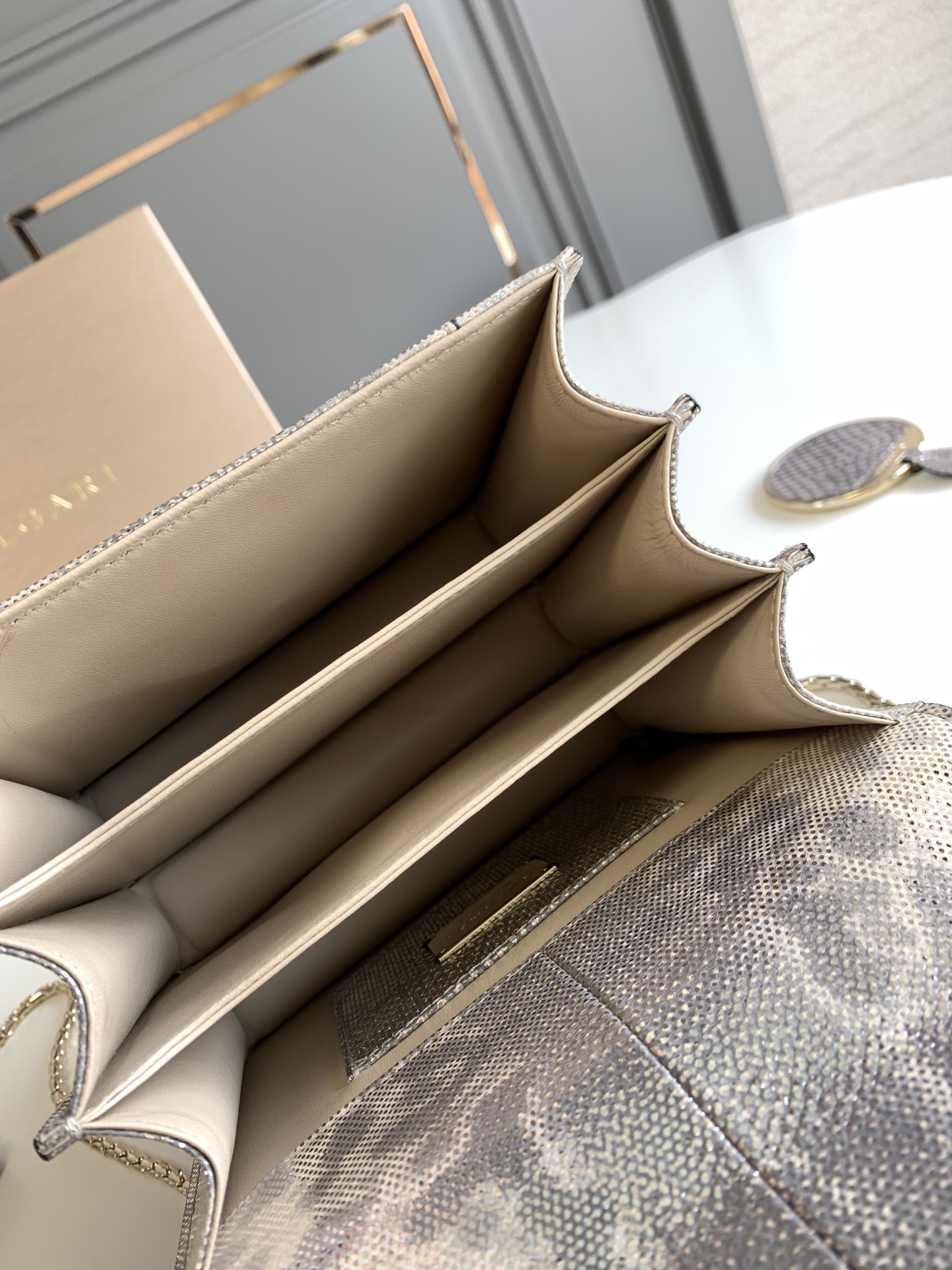 这款包包是AAAAA 1:1 质量 (非常棒). 使用了和原版一模一样的材料. 商标部分也保持了和宝格丽/Bulgari一样. 图片拍摄是实物包包拍摄, 您所收到的实物保证和我们图片一模一样.