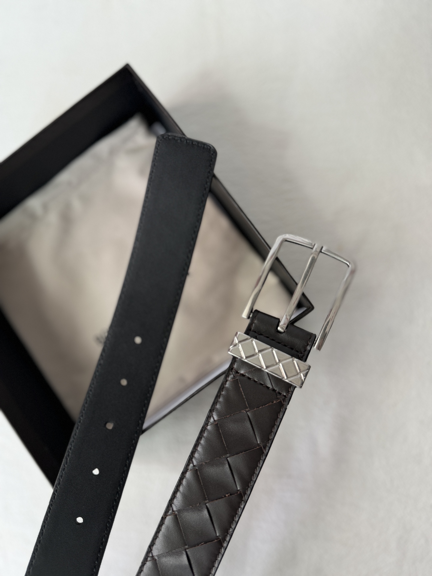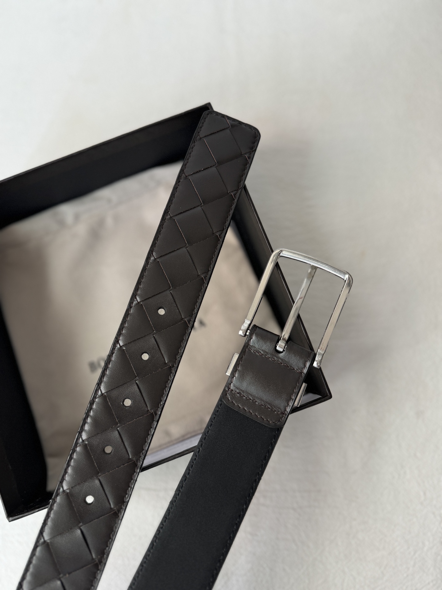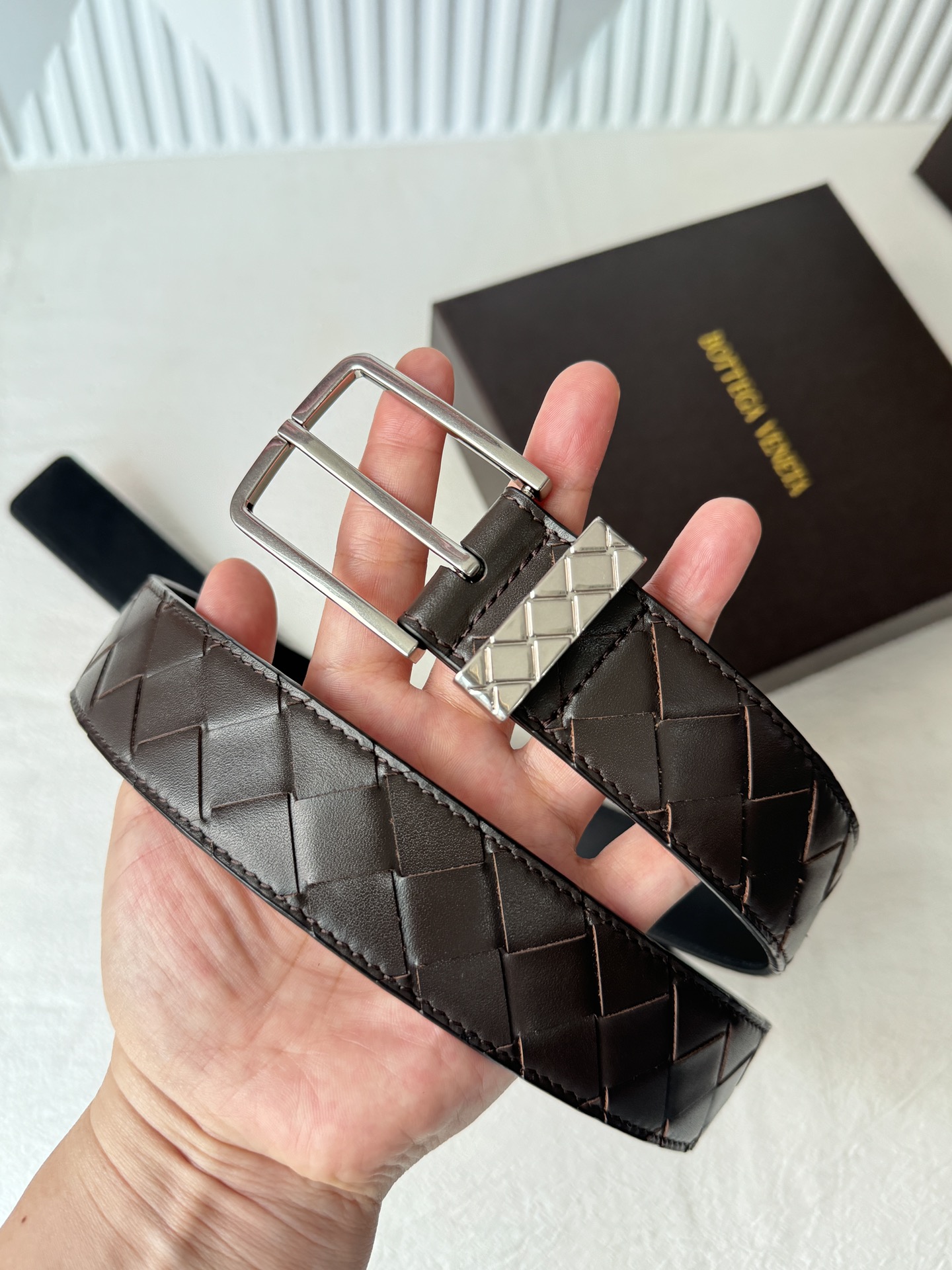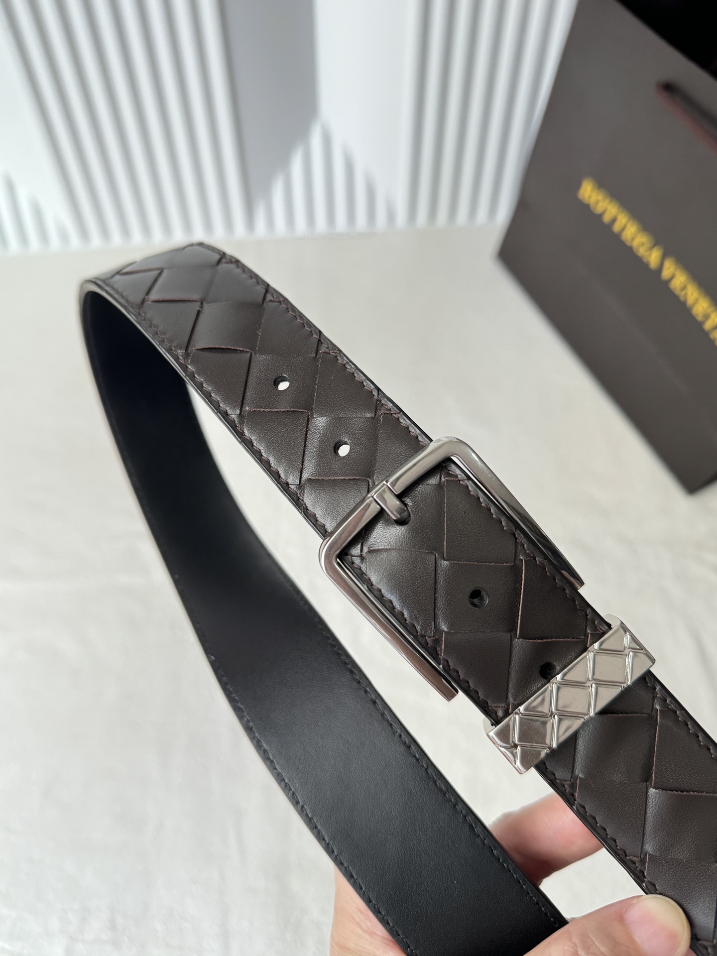 这款皮带是AAAAA 1:1 质量 (非常棒). 使用了和原版一模一样的材料. 商标部分也保持了和葆蝶家/Bottega Veneta一样. 图片拍摄是实物皮带拍摄, 您所收到的实物保证和我们图片一模一样.