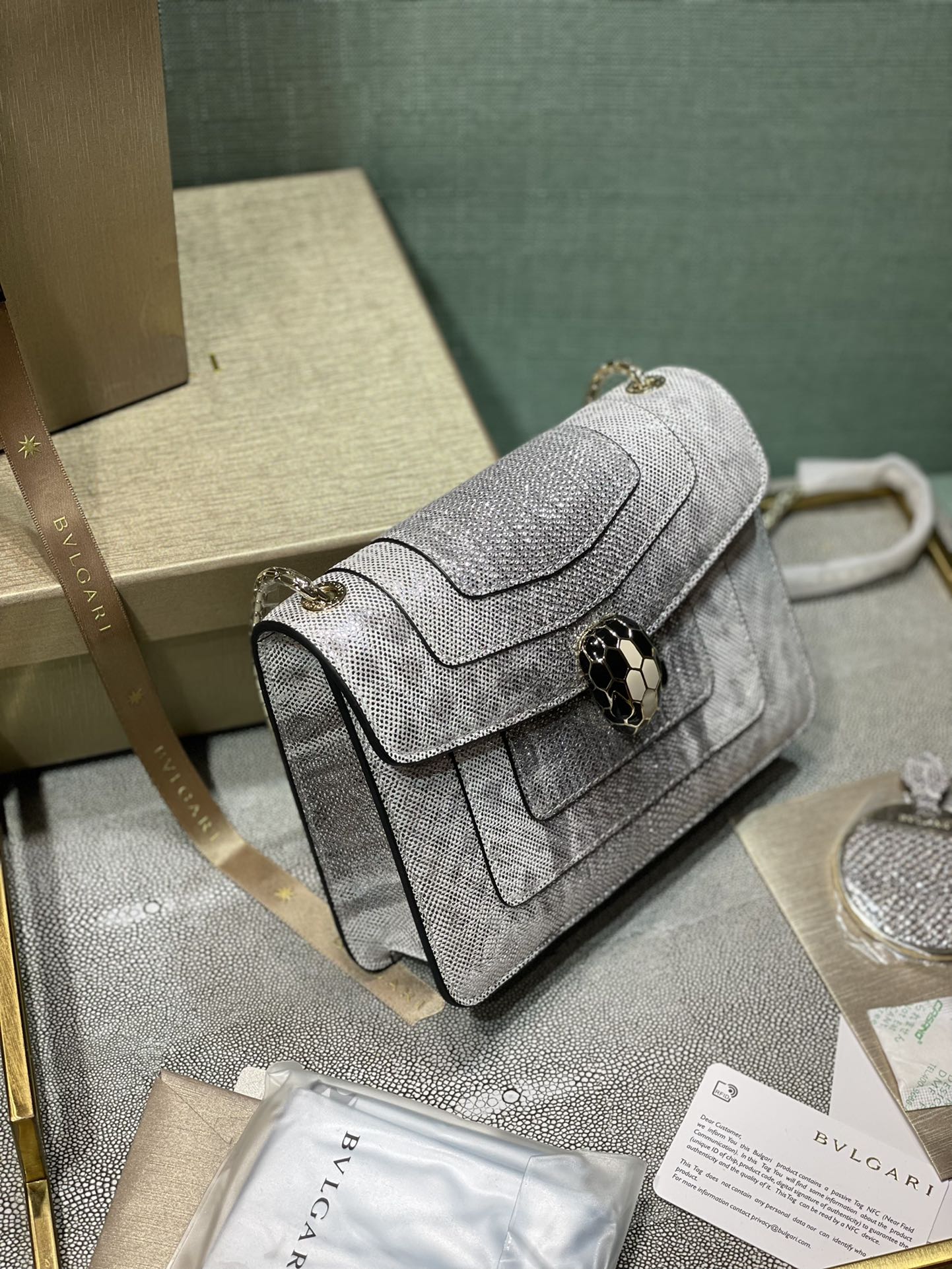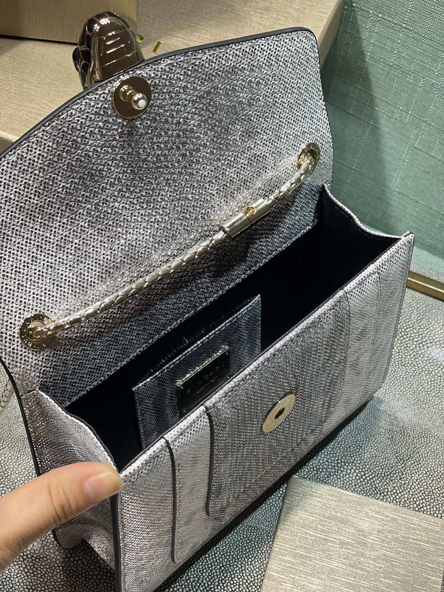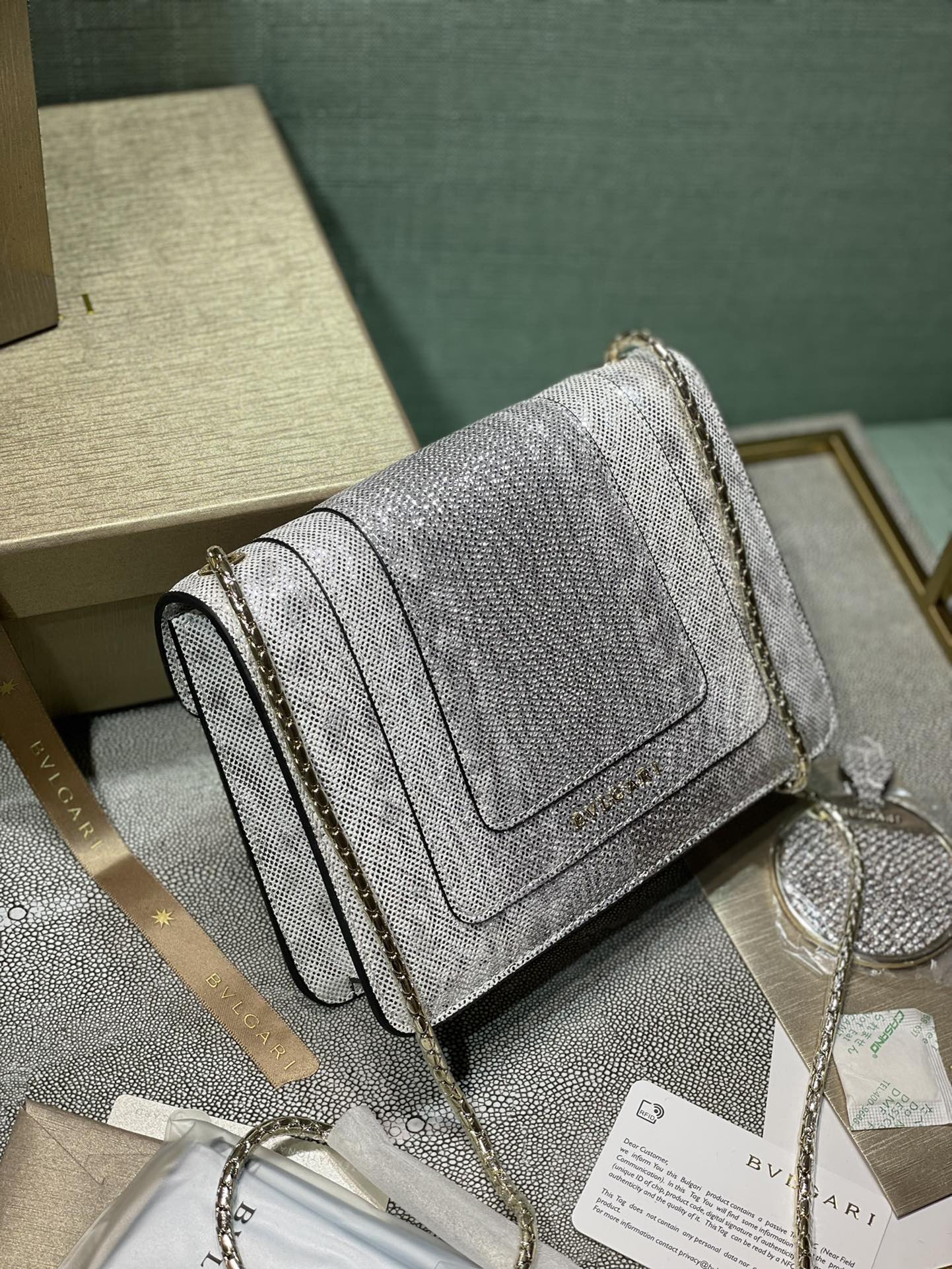 这款包包是AAAAA 1:1 质量 (非常棒). 使用了和原版一模一样的材料. 商标部分也保持了和宝格丽/Bulgari一样. 图片拍摄是实物包包拍摄, 您所收到的实物保证和我们图片一模一样.