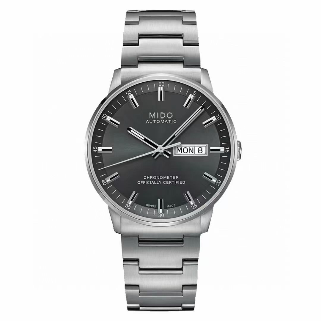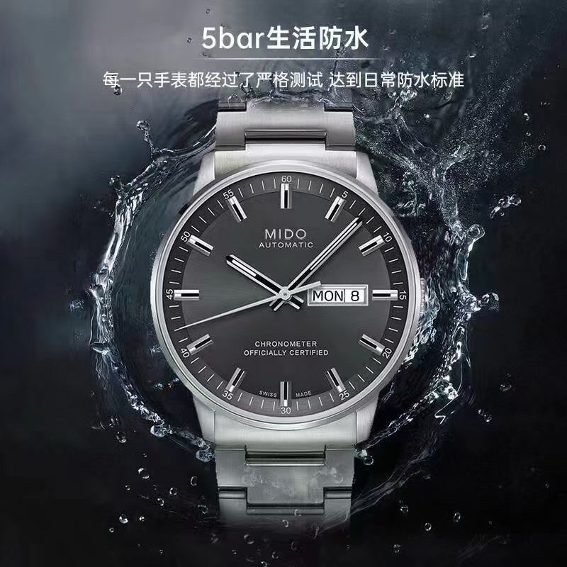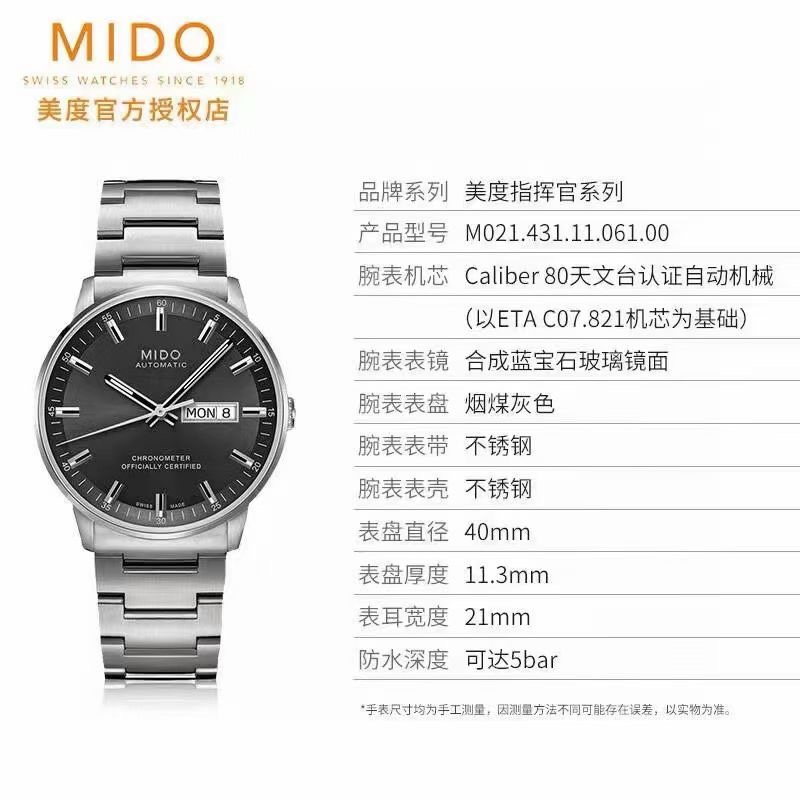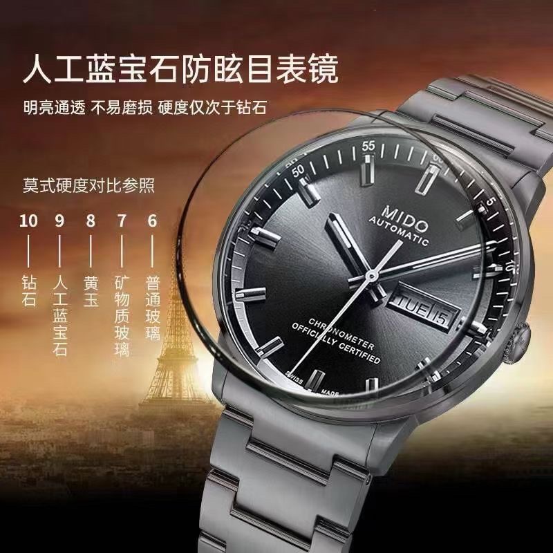 这款手表是AAAAA 1:1 质量 (非常棒). 使用了和原版一模一样的材料. 商标部分也保持了和Mido一样. 图片拍摄是实物手表拍摄, 您所收到的实物保证和我们图片一模一样.