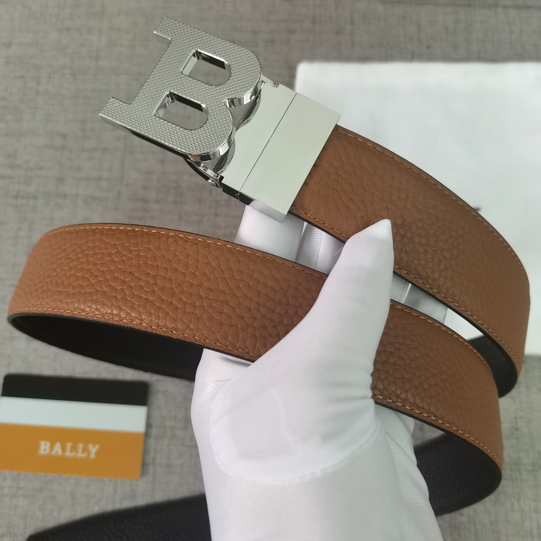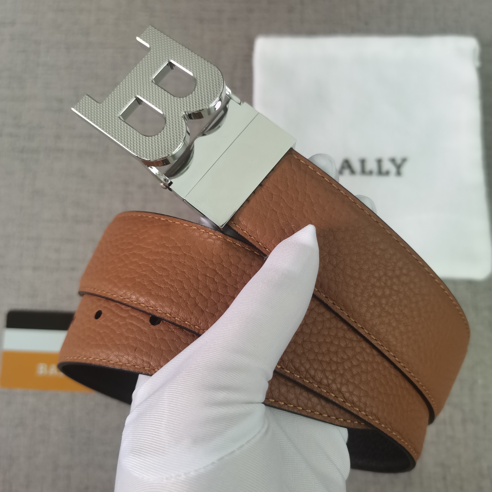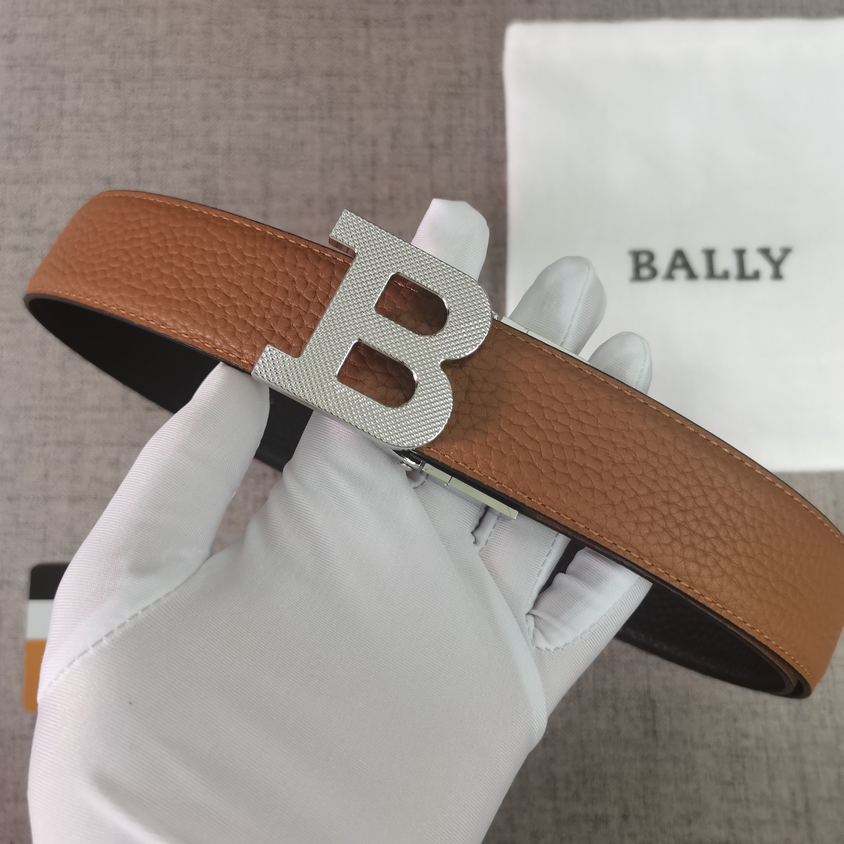 这款皮带是AAAAA 1:1 质量 (非常棒). 使用了和原版一模一样的材料. 商标部分也保持了和BALLY巴利/BALLY一样. 图片拍摄是实物皮带拍摄, 您所收到的实物保证和我们图片一模一样.