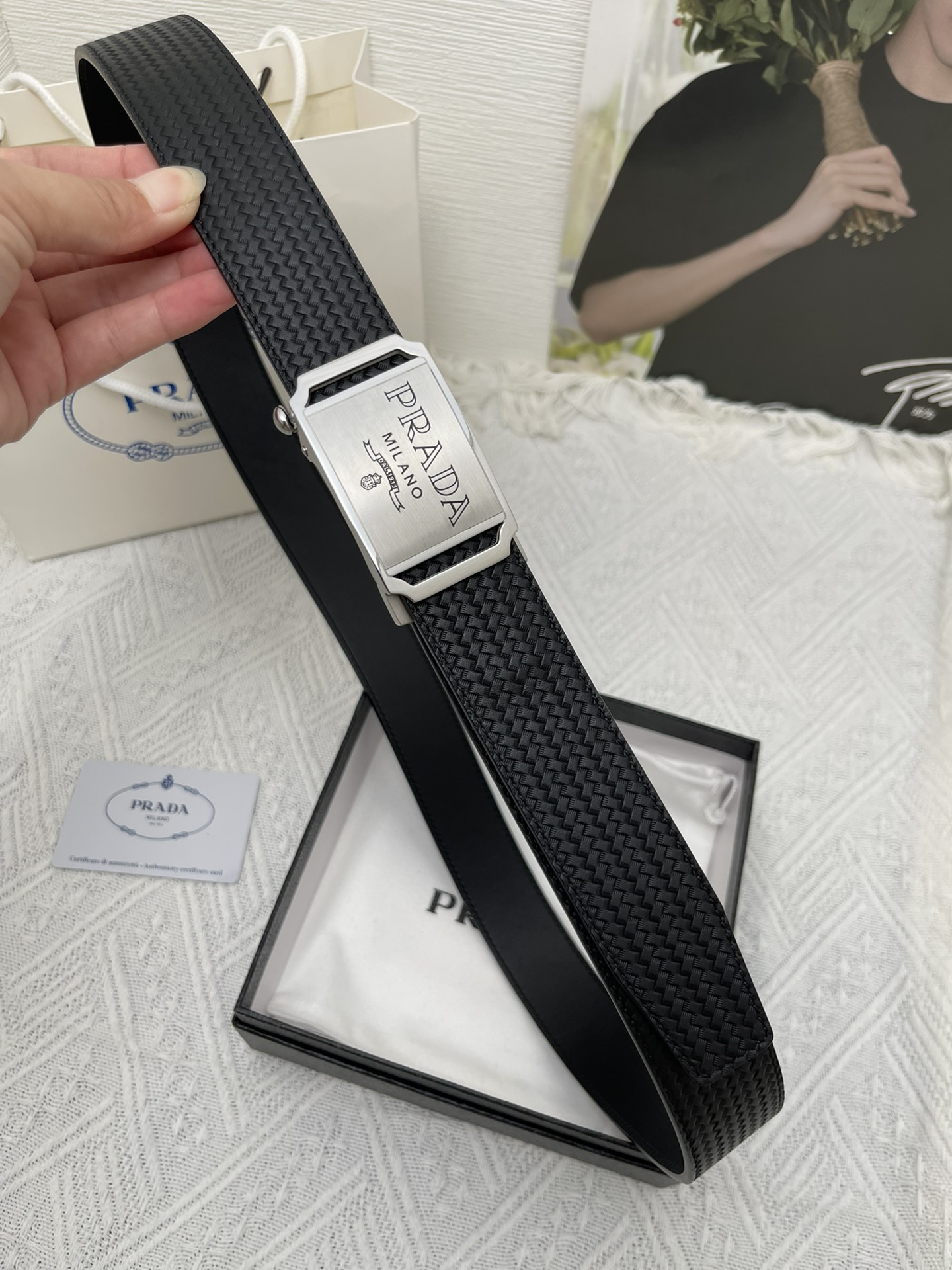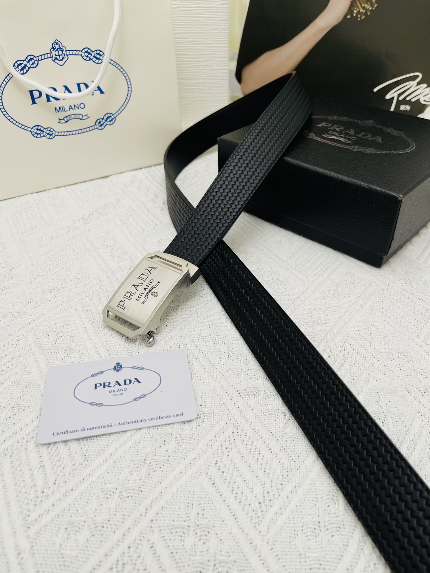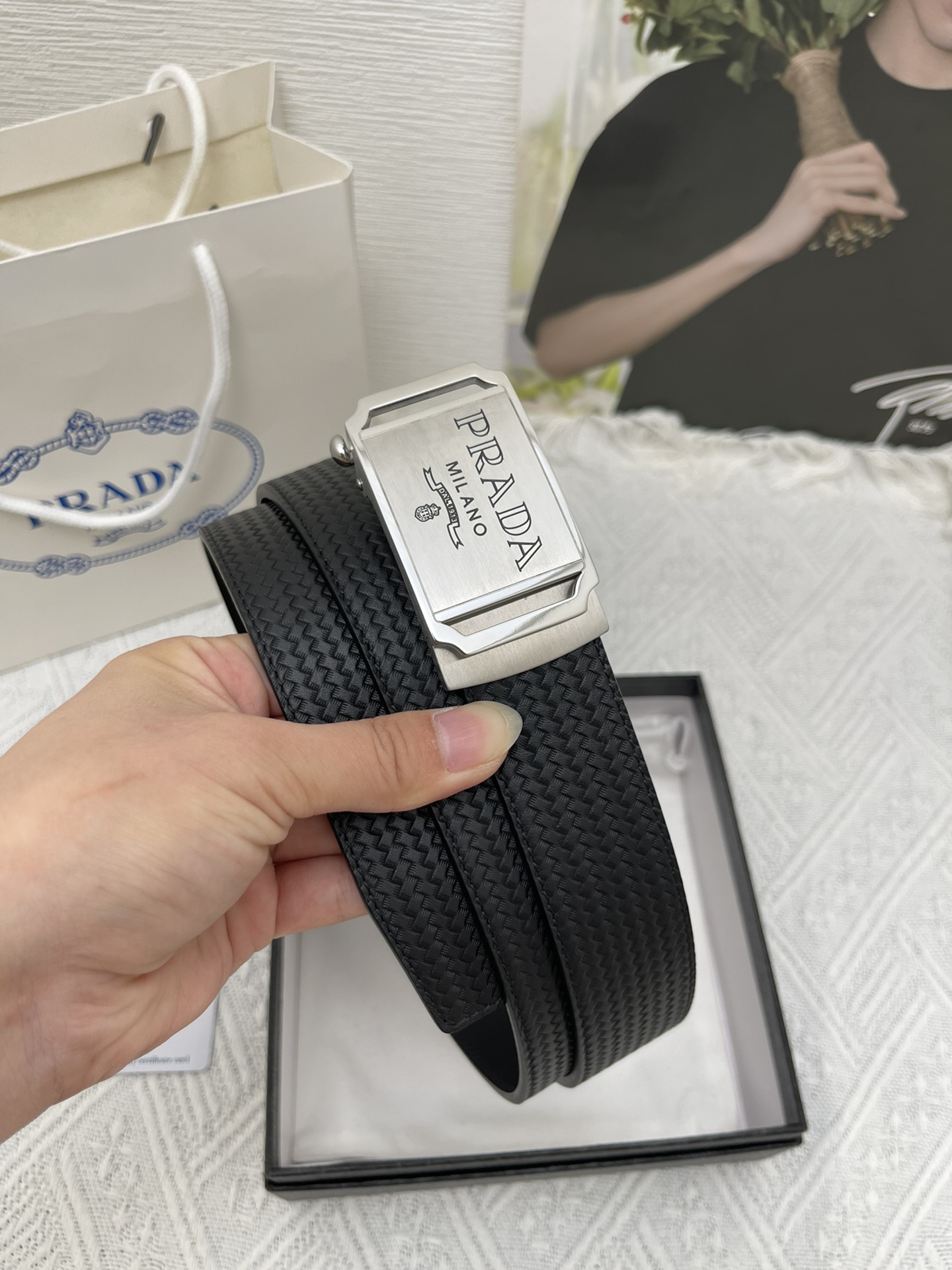 这款皮带是AAAAA 1:1 质量 (非常棒). 使用了和原版一模一样的材料. 商标部分也保持了和普拉达/Prada一样. 图片拍摄是实物皮带拍摄, 您所收到的实物保证和我们图片一模一样.