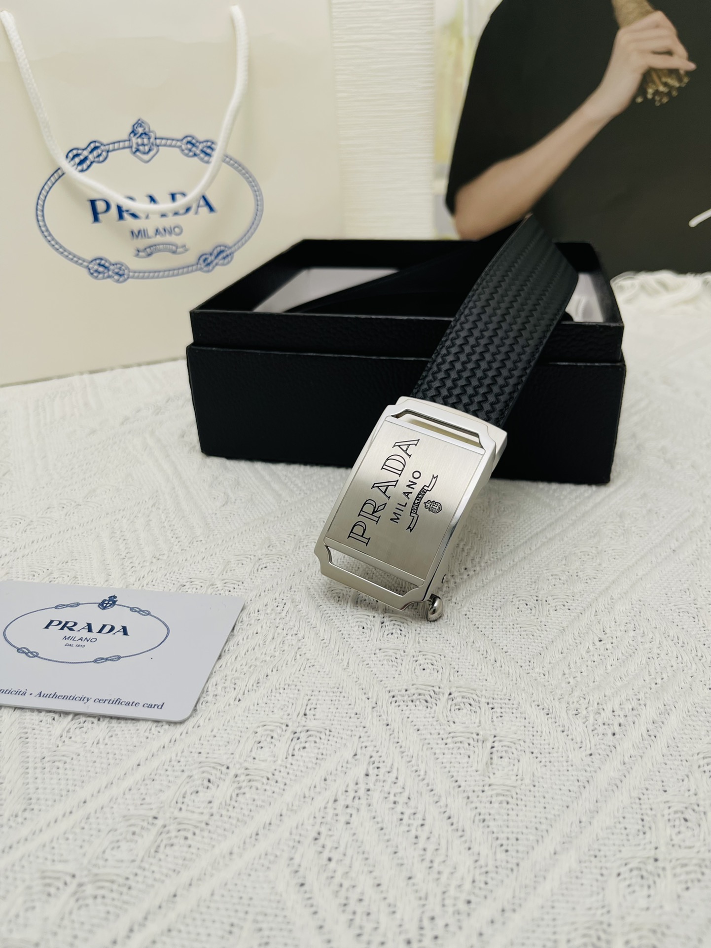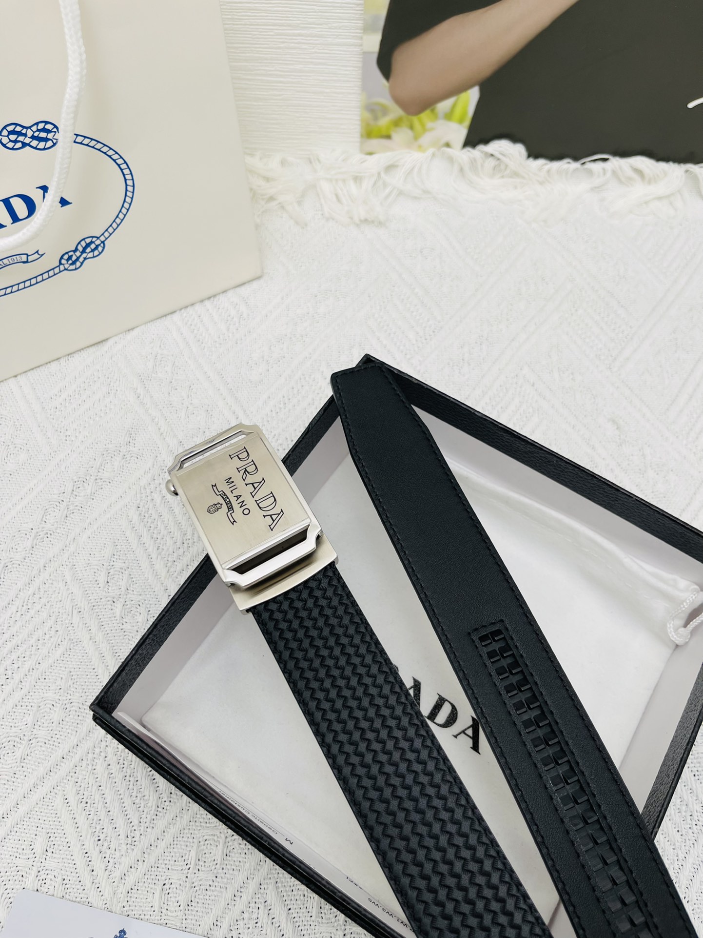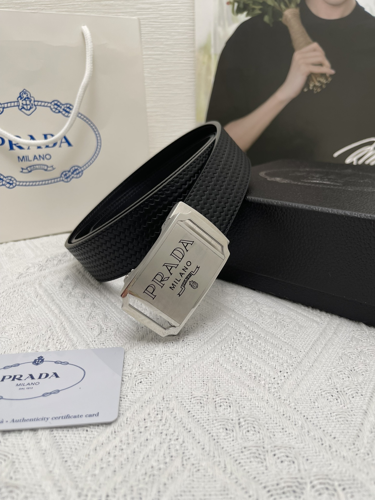 这款皮带是AAAAA 1:1 质量 (非常棒). 使用了和原版一模一样的材料. 商标部分也保持了和普拉达/Prada一样. 图片拍摄是实物皮带拍摄, 您所收到的实物保证和我们图片一模一样.