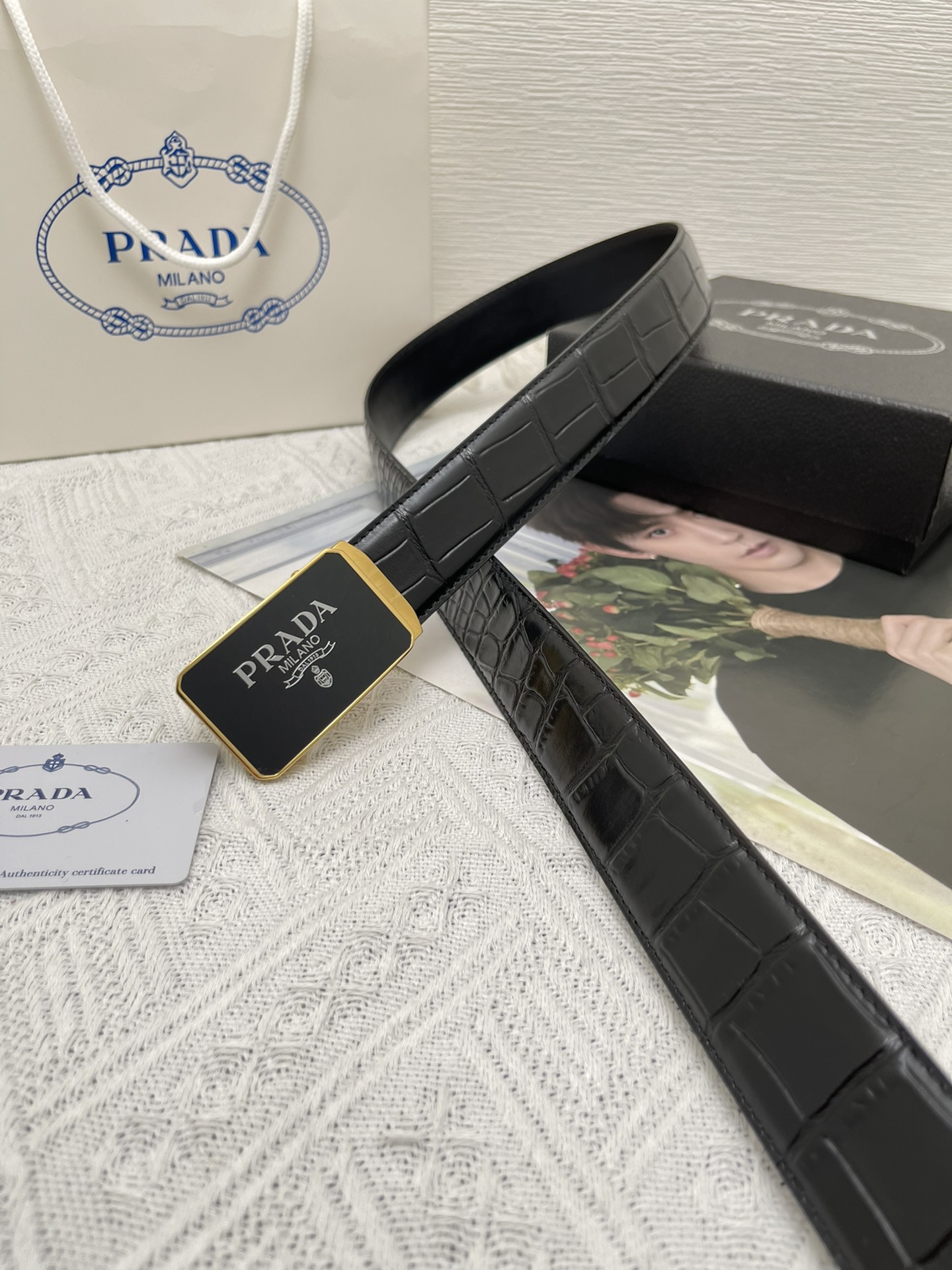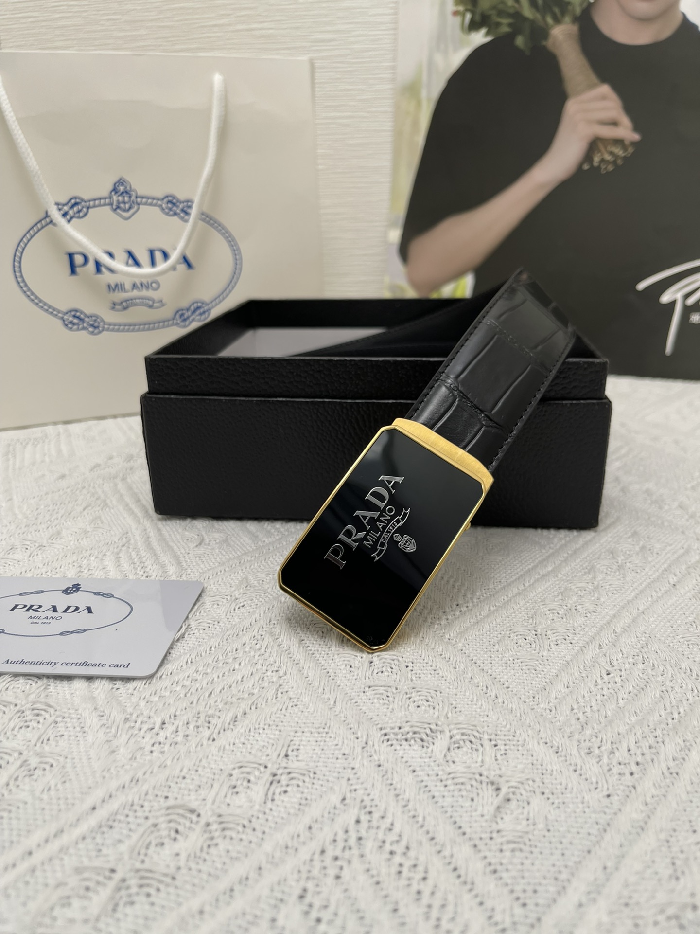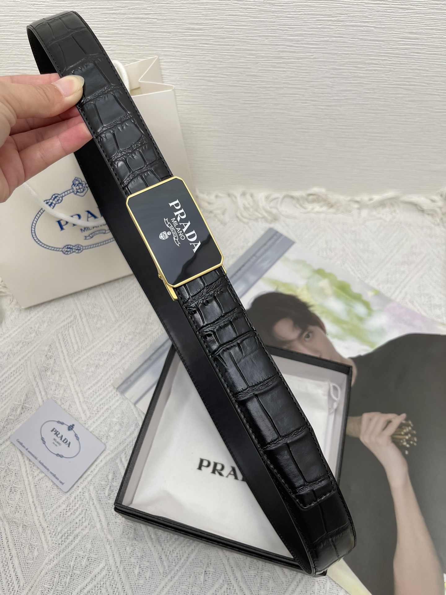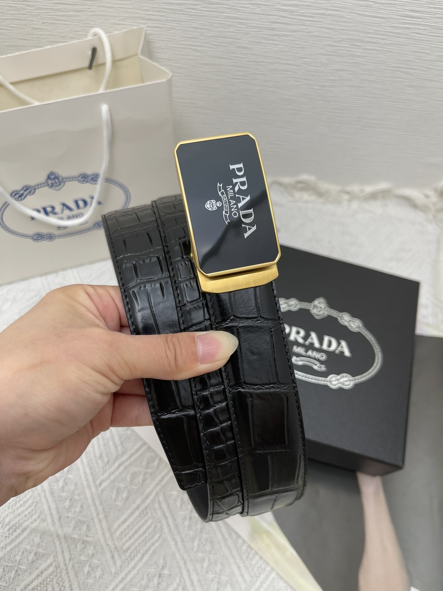 这款皮带是AAAAA 1:1 质量 (非常棒). 使用了和原版一模一样的材料. 商标部分也保持了和普拉达/Prada一样. 图片拍摄是实物皮带拍摄, 您所收到的实物保证和我们图片一模一样.