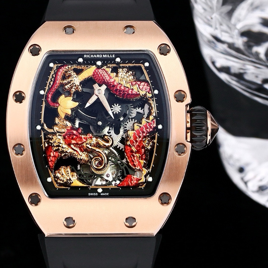 这款手表是AAAAA 1:1 质量 (非常棒). 使用了和原版一模一样的材料. 商标部分也保持了和理查德·米尔/Richard Mille一样. 图片拍摄是实物手表拍摄, 您所收到的实物保证和我们图片一模一样.