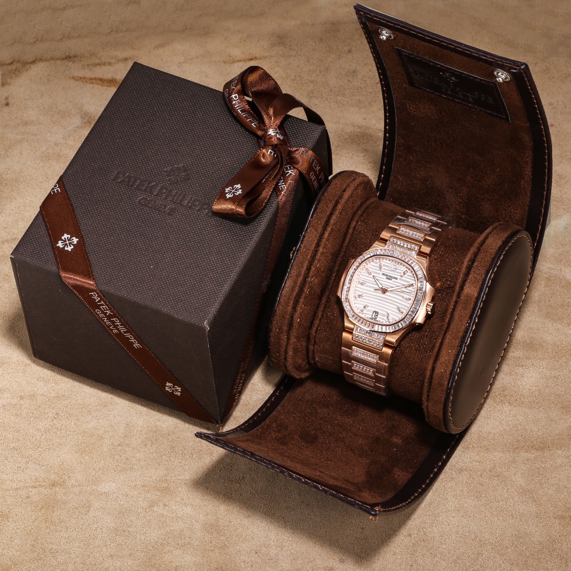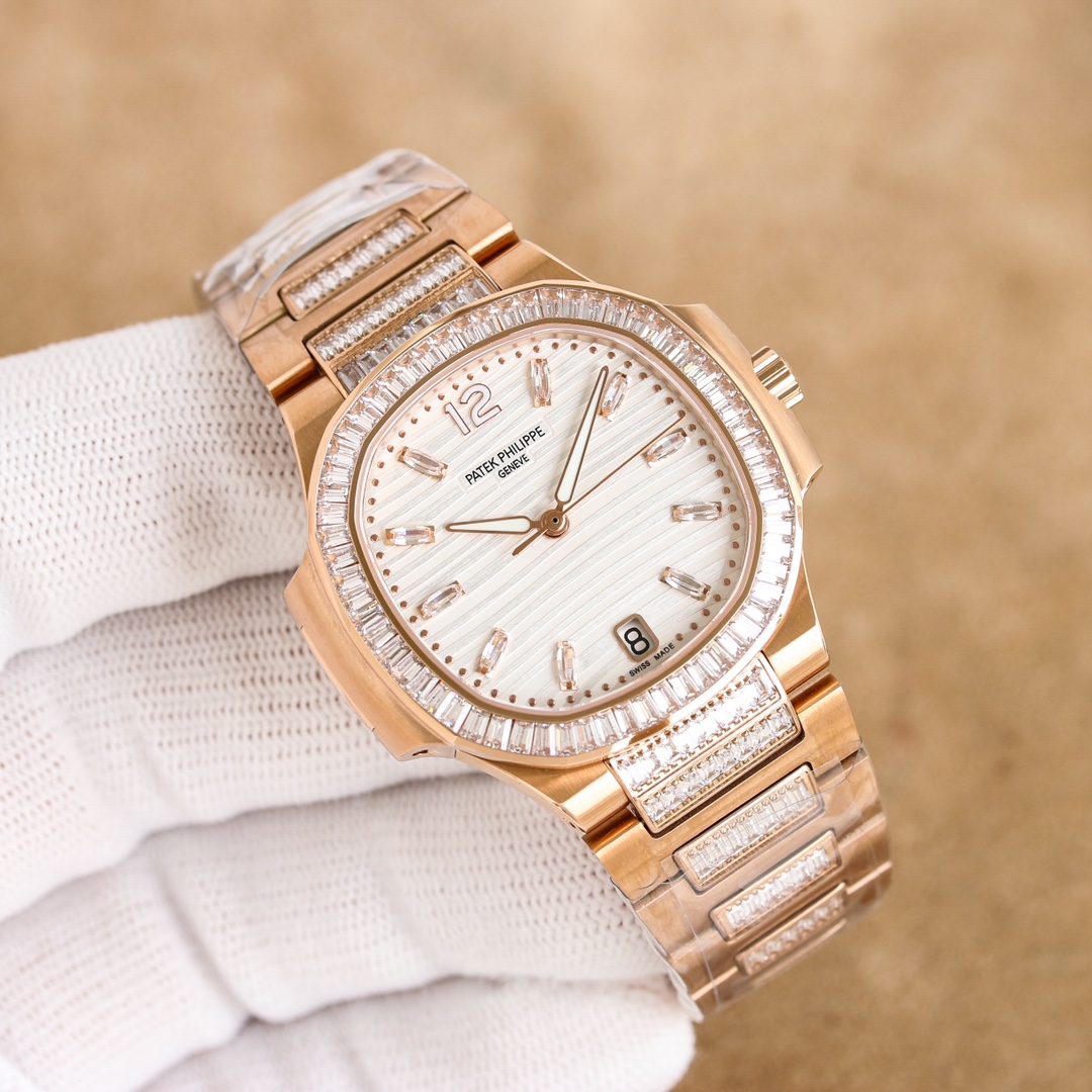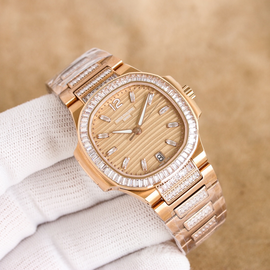 这款手表是AAAAA 1:1 质量 (非常棒). 使用了和原版一模一样的材料. 商标部分也保持了和百达翡丽/Patek Philippe一样. 图片拍摄是实物手表拍摄, 您所收到的实物保证和我们图片一模一样.