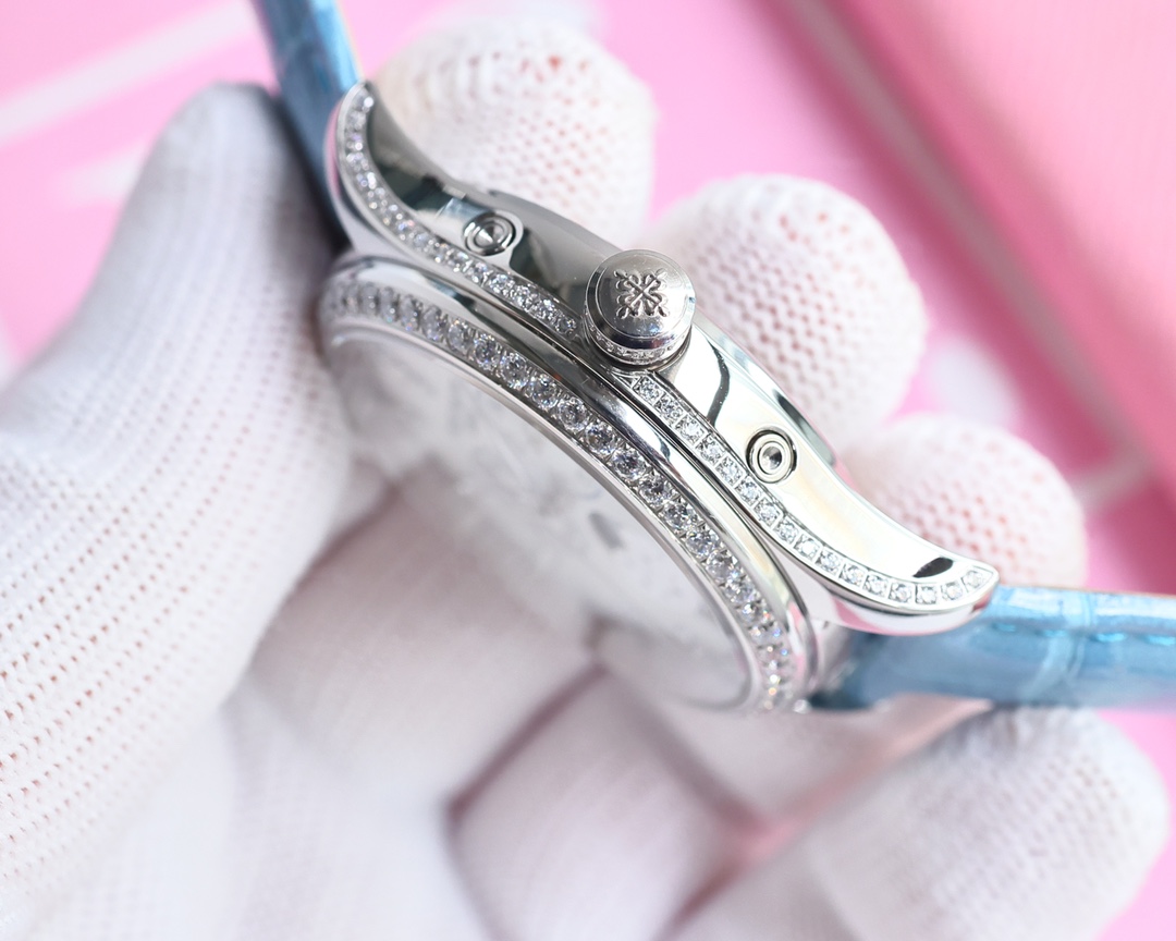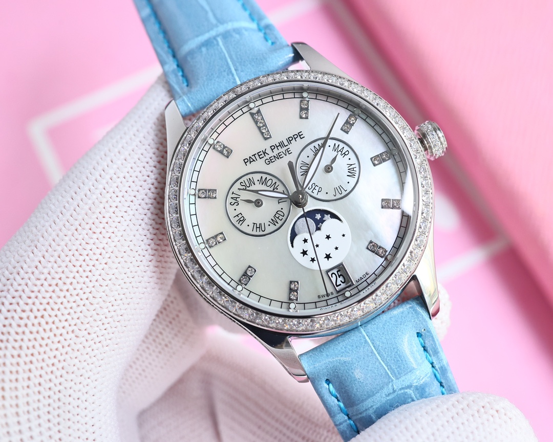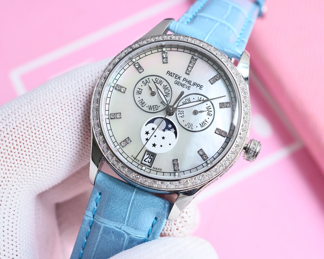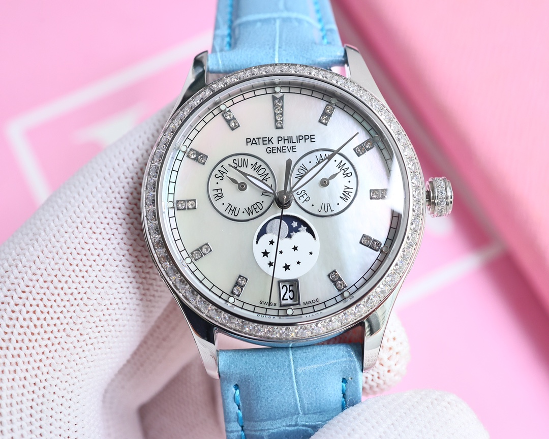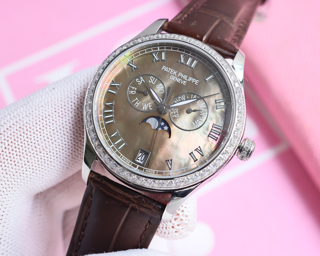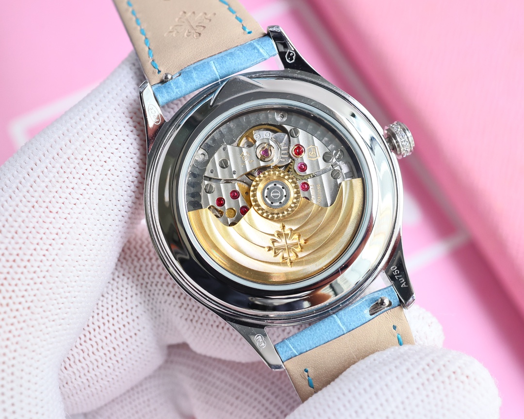 这款手表是AAAAA 1:1 质量 (非常棒). 使用了和原版一模一样的材料. 商标部分也保持了和百达翡丽/Patek Philippe一样. 图片拍摄是实物手表拍摄, 您所收到的实物保证和我们图片一模一样.