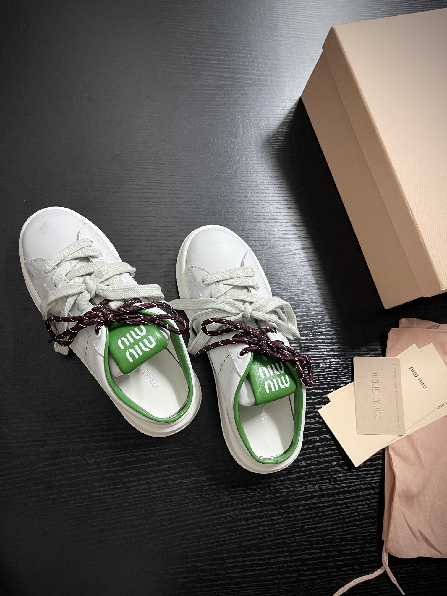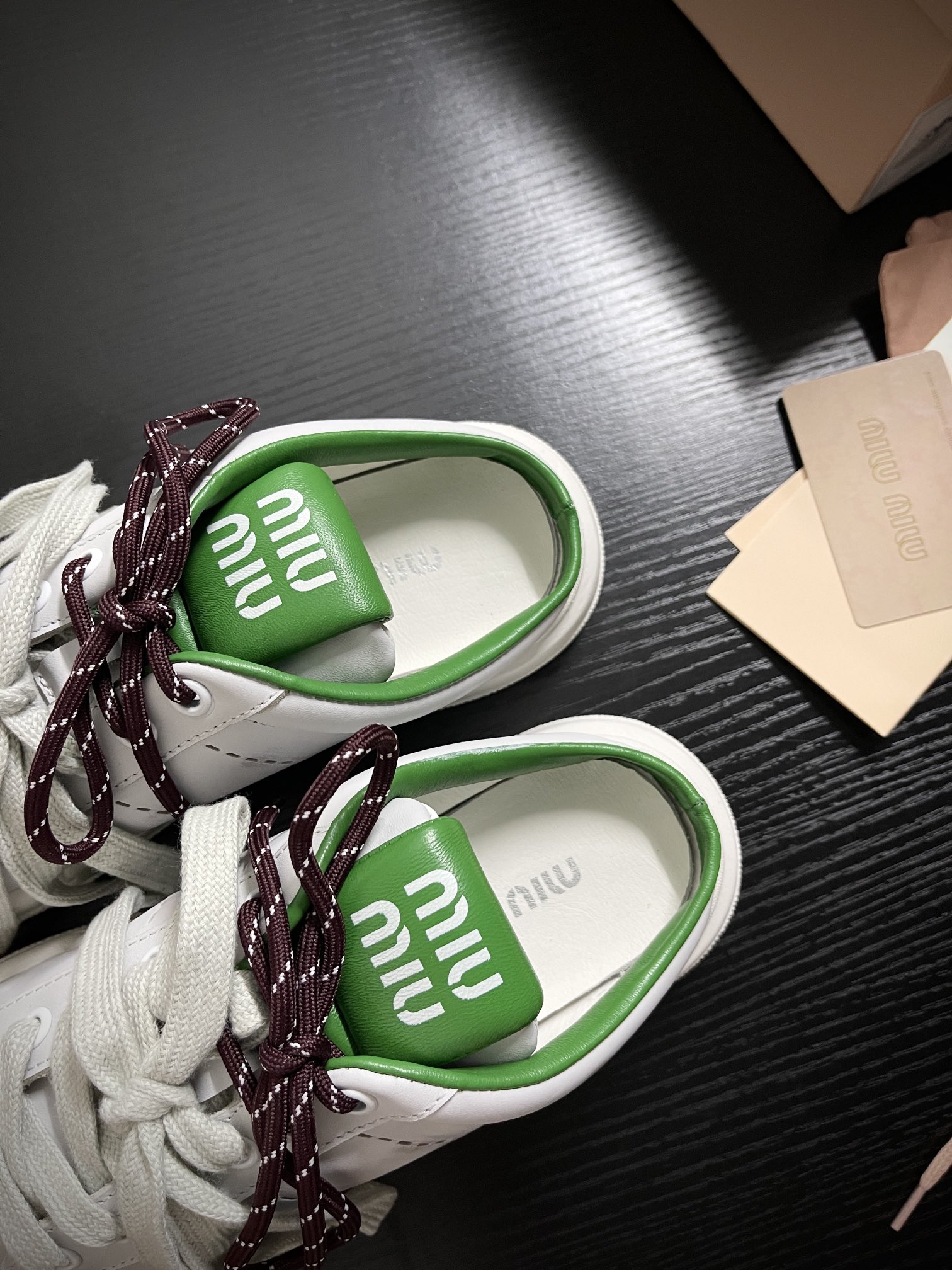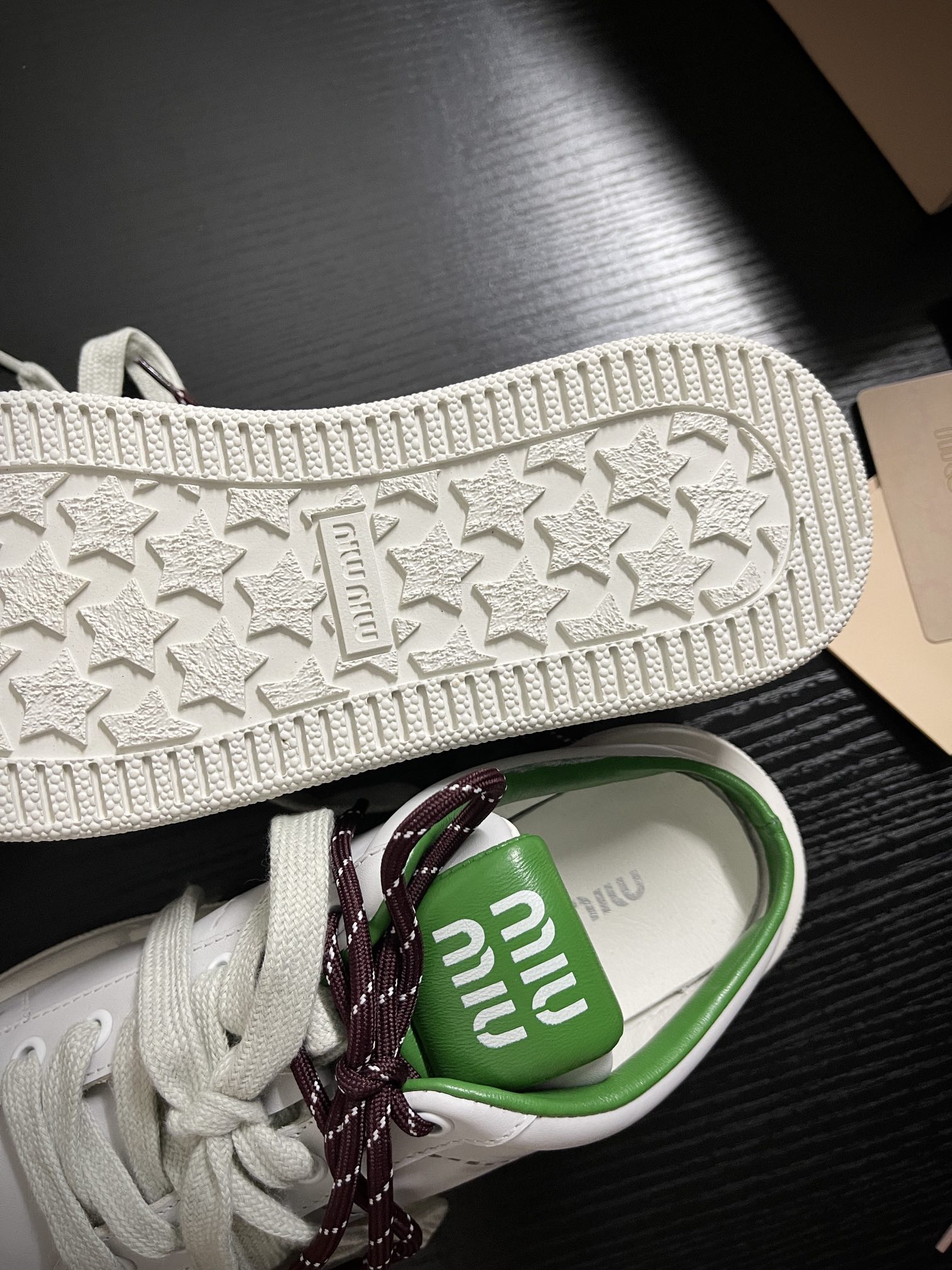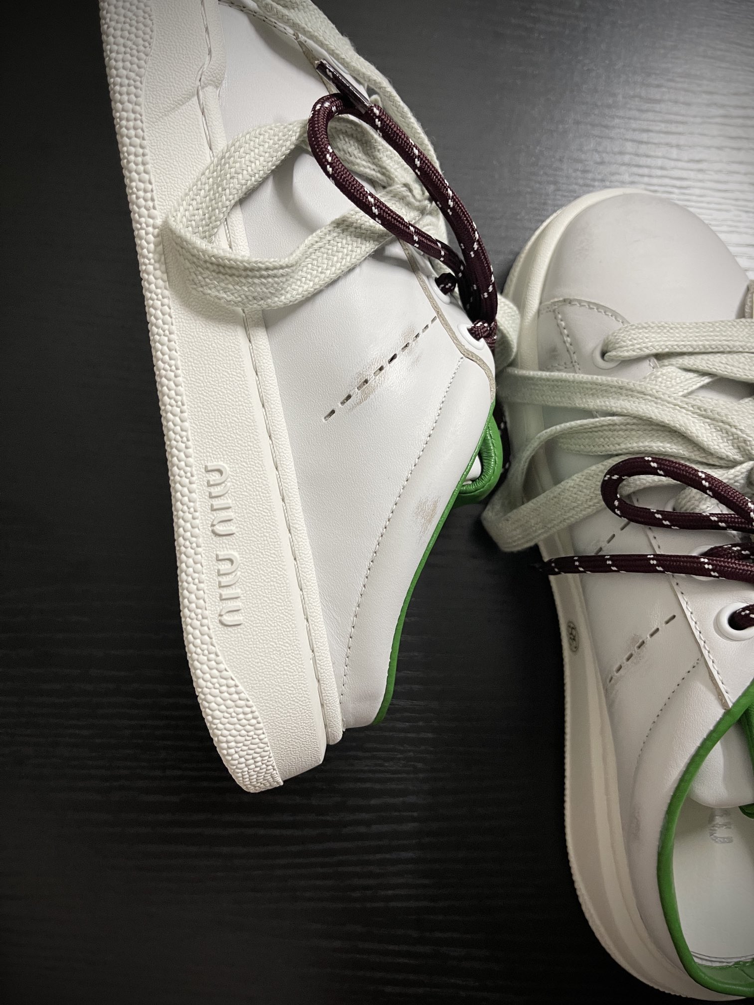 这款鞋子是AAAAA 1:1 质量 (非常棒). 使用了和原版一模一样的材料. 商标部分也保持了和缪缪/Miu Miu一样. 图片拍摄是实物鞋子拍摄, 您所收到的实物保证和我们图片一模一样.
