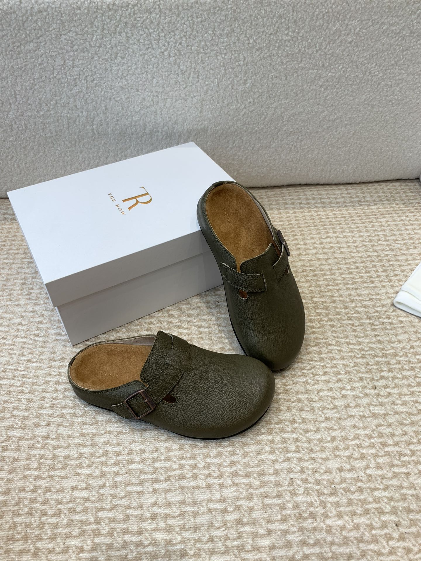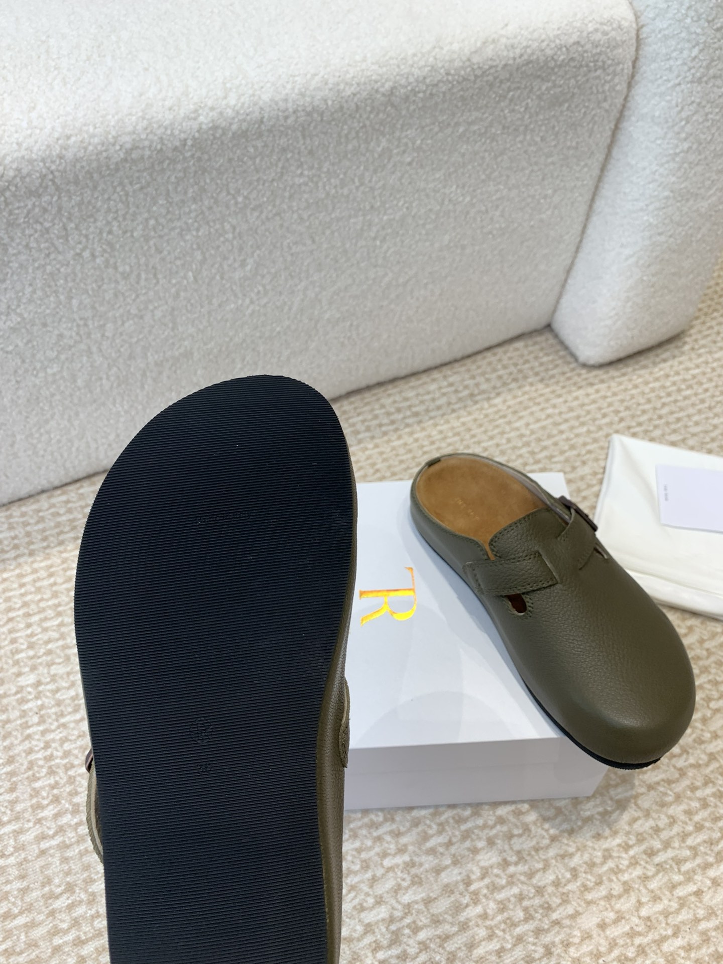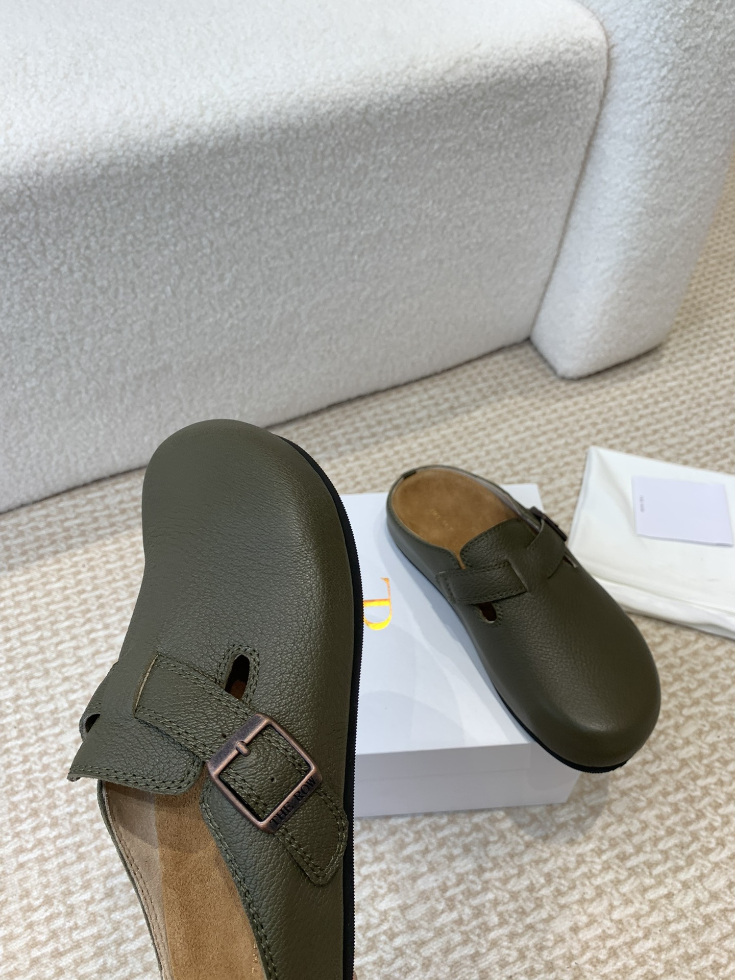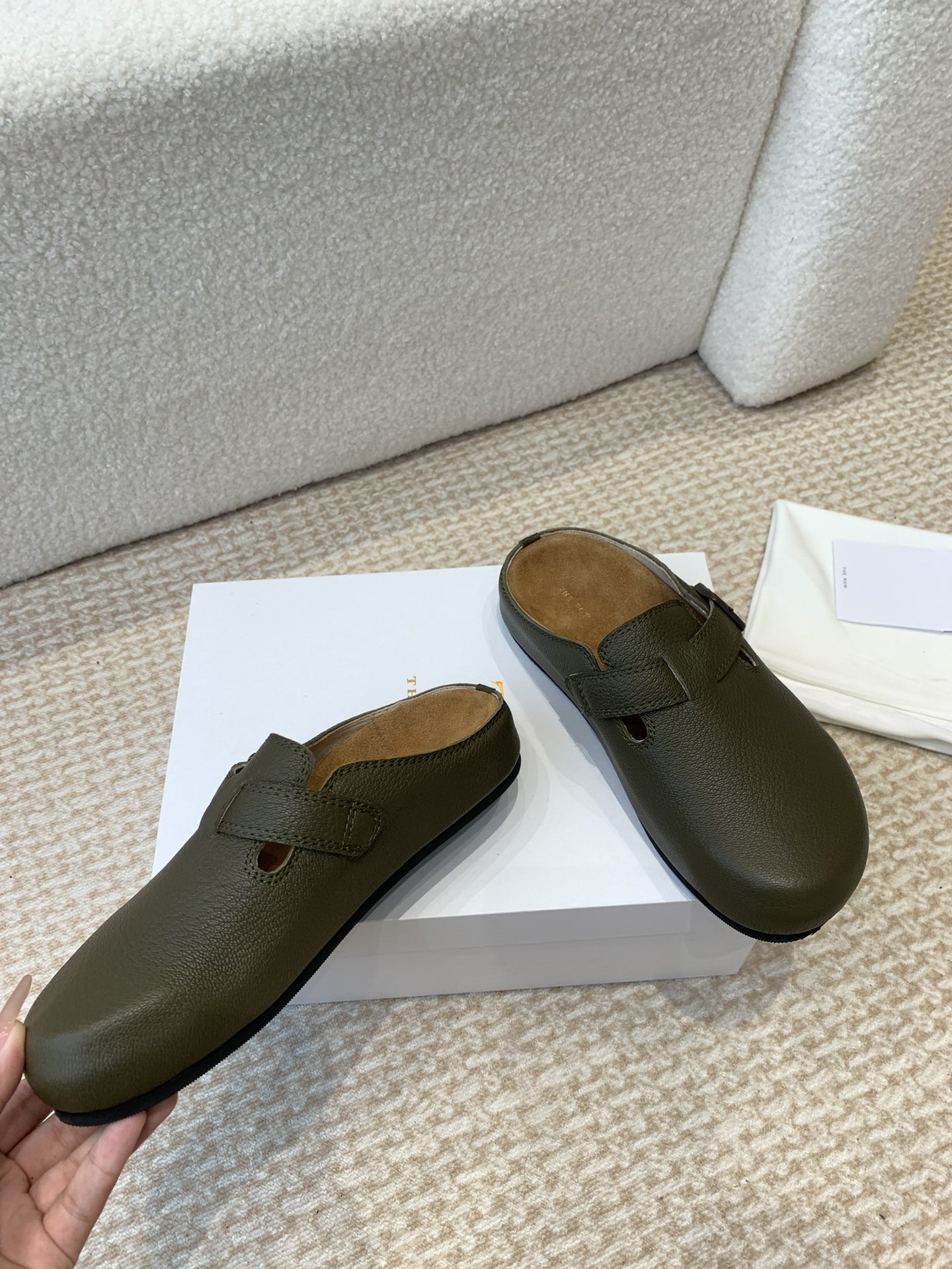 这款鞋子是AAAAA 1:1 质量 (非常棒). 使用了和原版一模一样的材料. 商标部分也保持了和The Row一样. 图片拍摄是实物鞋子拍摄, 您所收到的实物保证和我们图片一模一样.