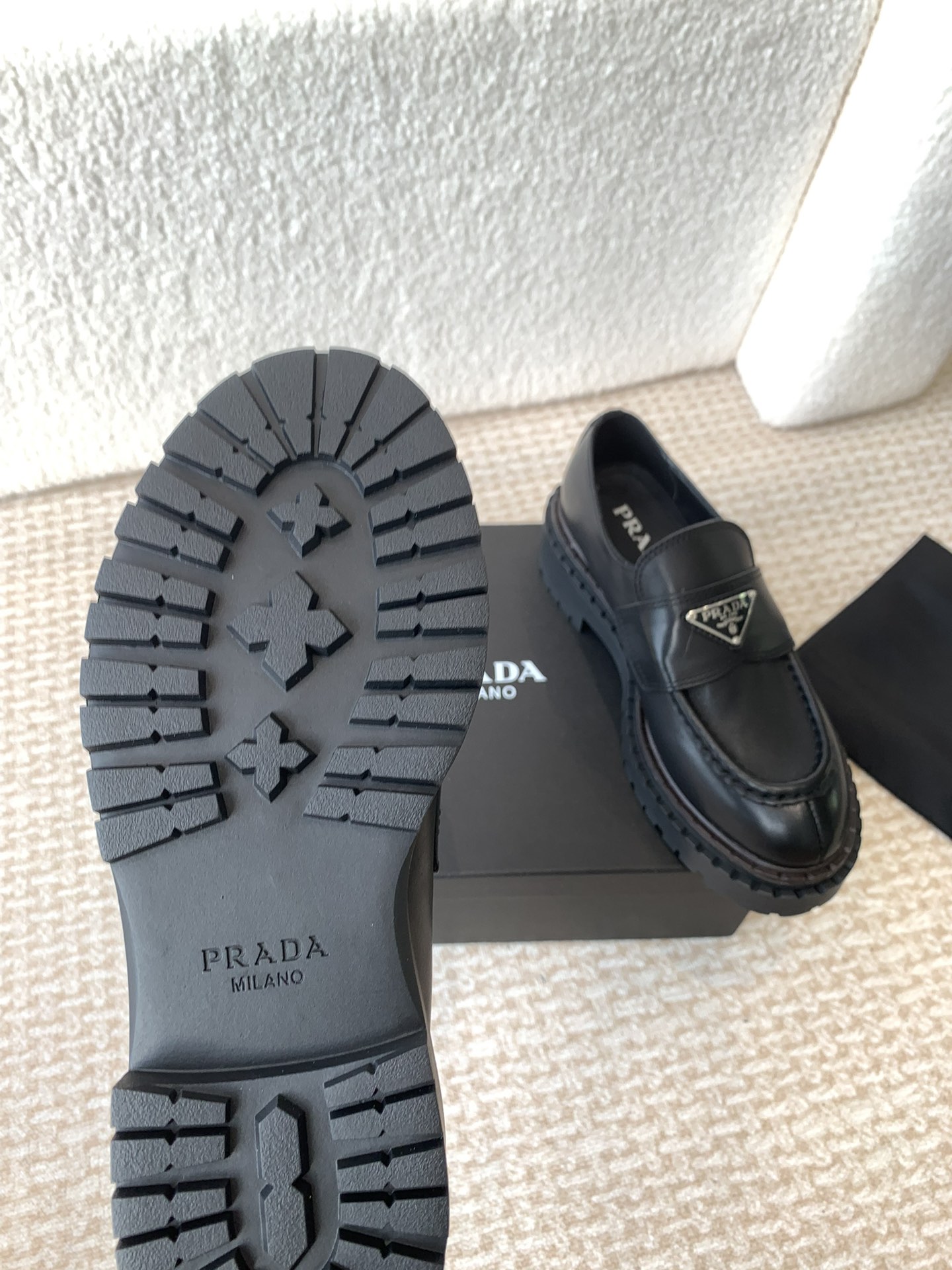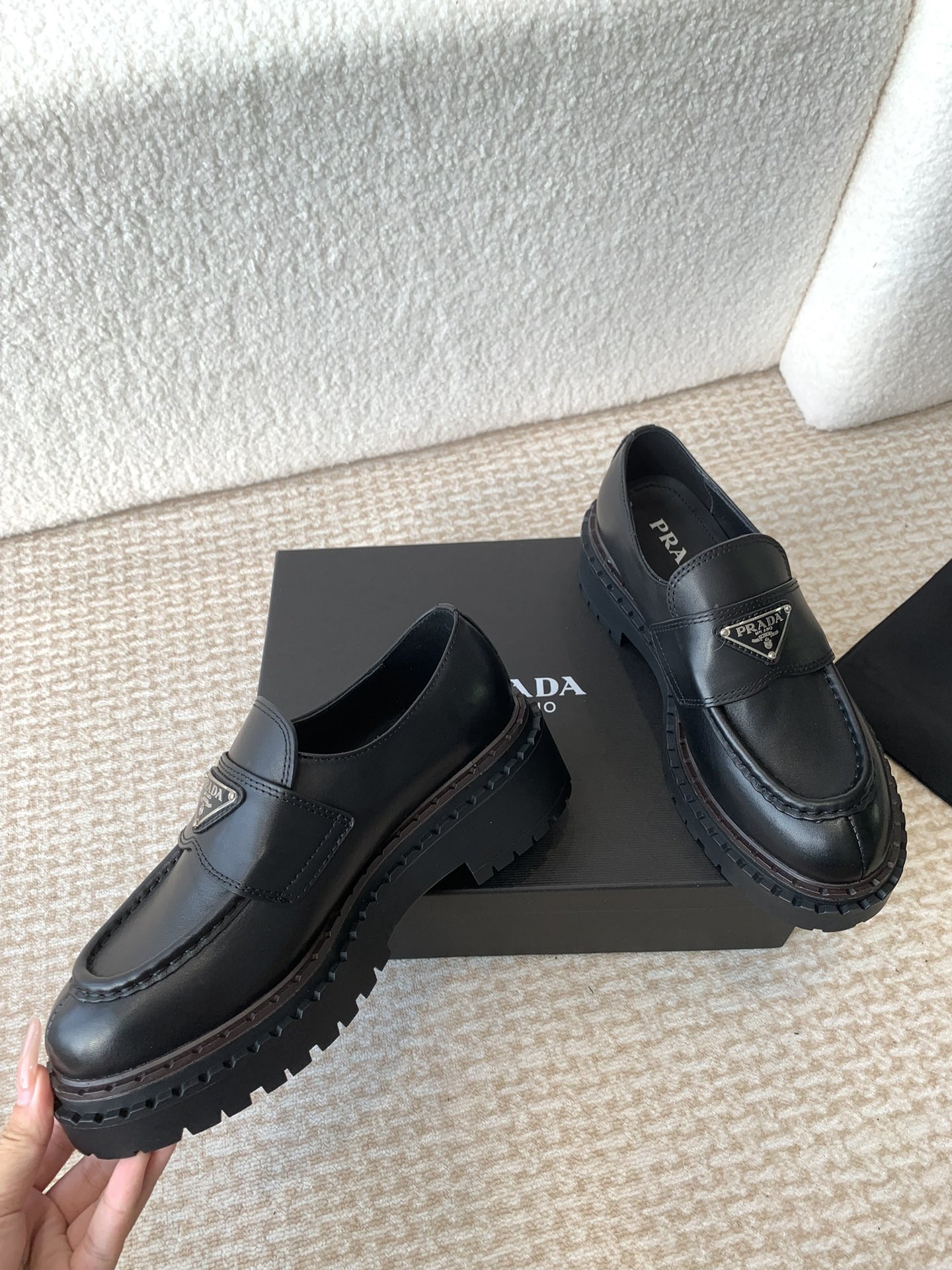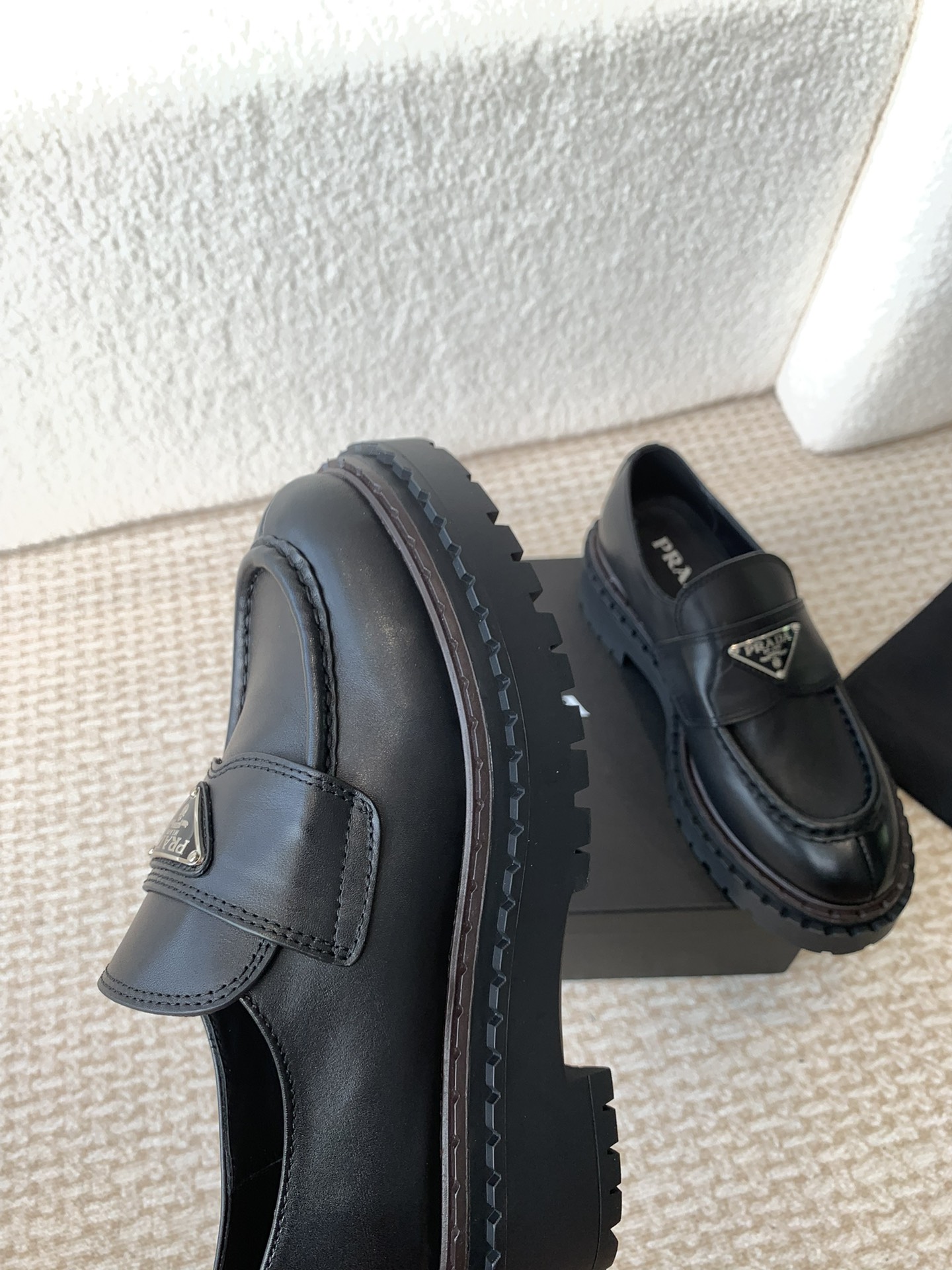 这款鞋子是AAAAA 1:1 质量 (非常棒). 使用了和原版一模一样的材料. 商标部分也保持了和普拉达/Prada一样. 图片拍摄是实物鞋子拍摄, 您所收到的实物保证和我们图片一模一样.