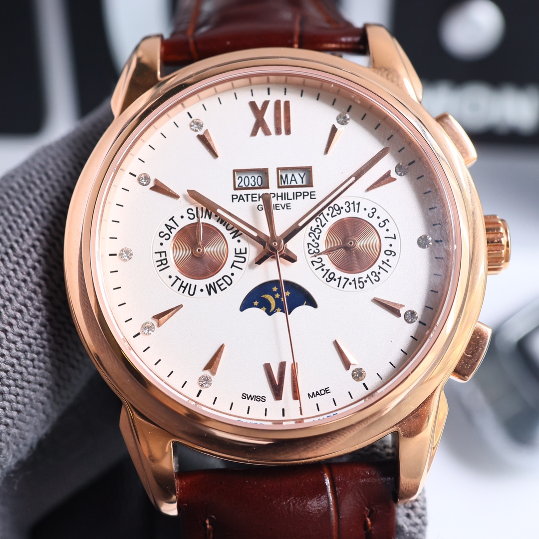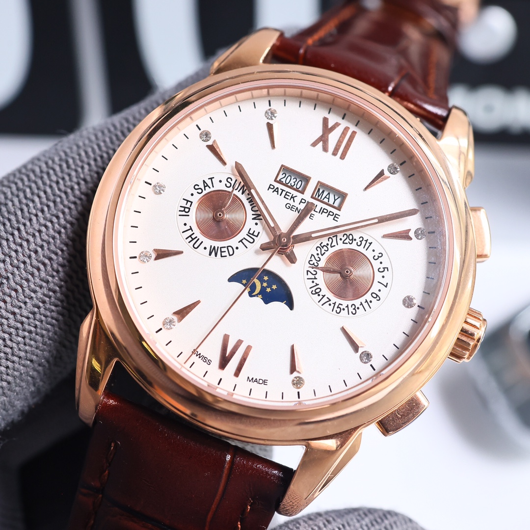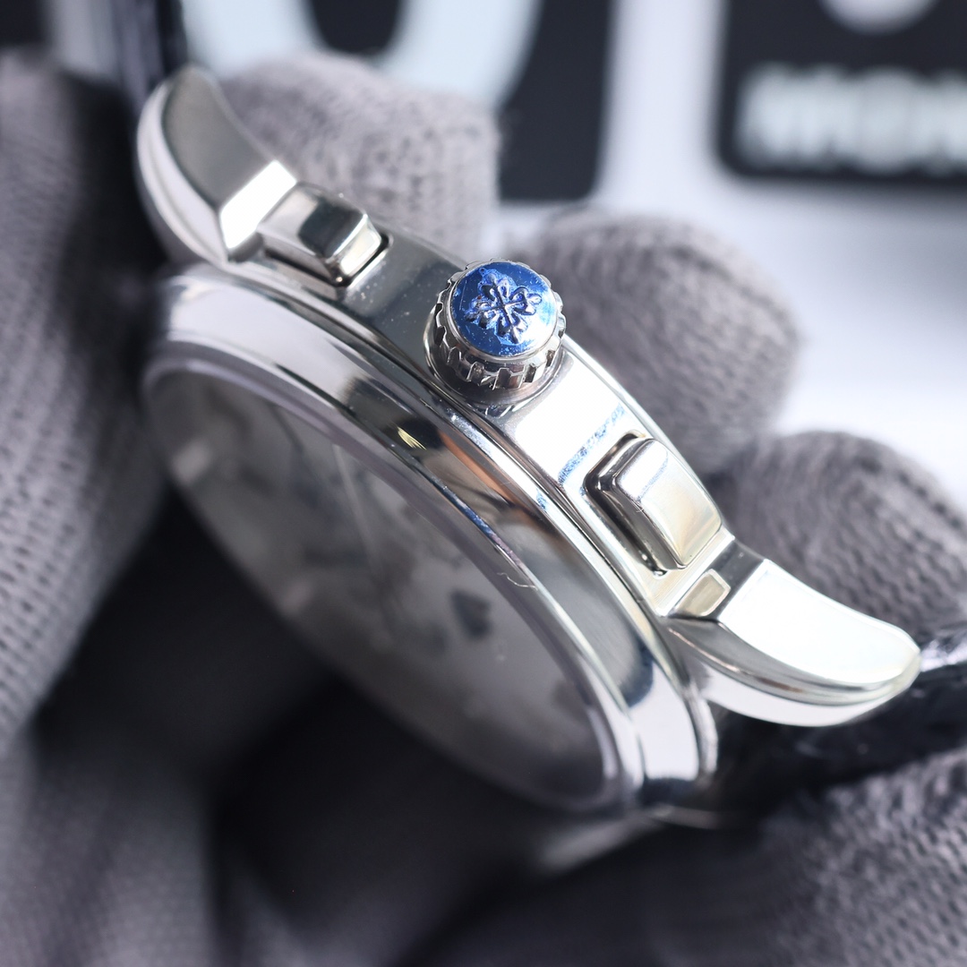 这款手表是AAAAA 1:1 质量 (非常棒). 使用了和原版一模一样的材料. 商标部分也保持了和百达翡丽/Patek Philippe一样. 图片拍摄是实物手表拍摄, 您所收到的实物保证和我们图片一模一样.