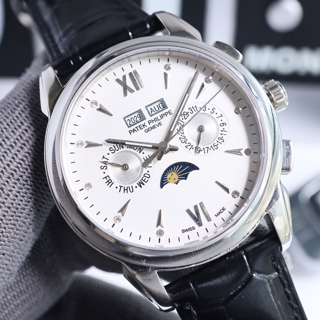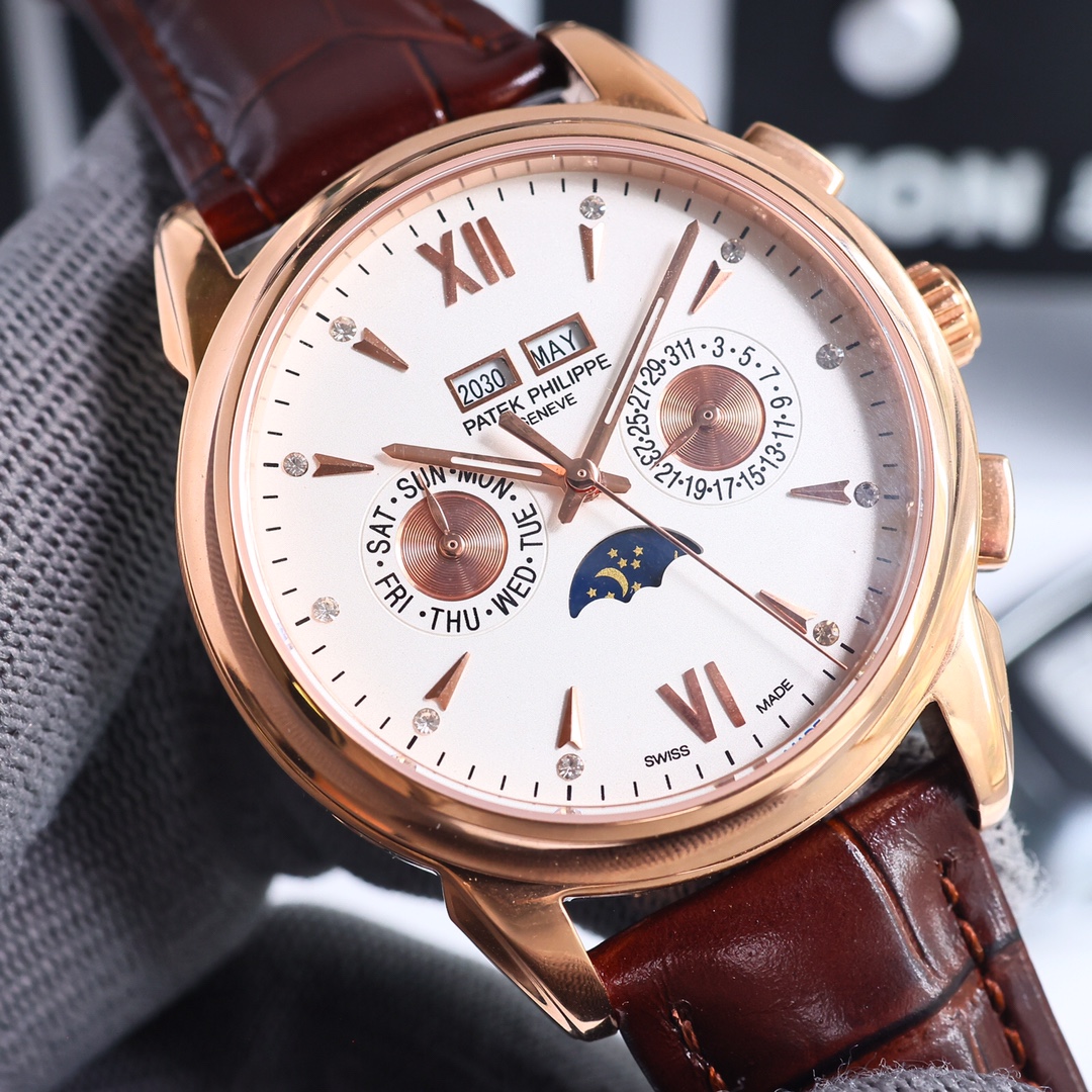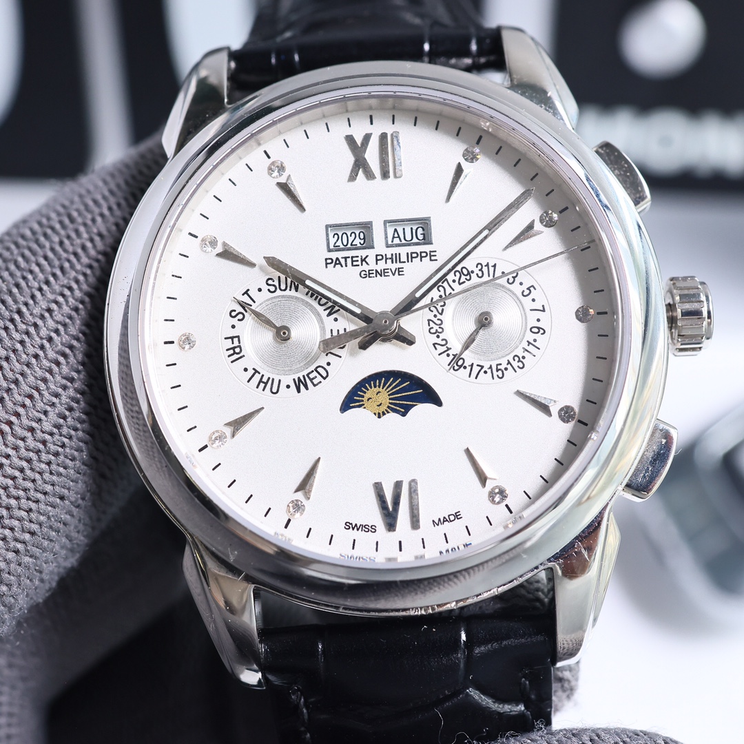 这款手表是AAAAA 1:1 质量 (非常棒). 使用了和原版一模一样的材料. 商标部分也保持了和百达翡丽/Patek Philippe一样. 图片拍摄是实物手表拍摄, 您所收到的实物保证和我们图片一模一样.