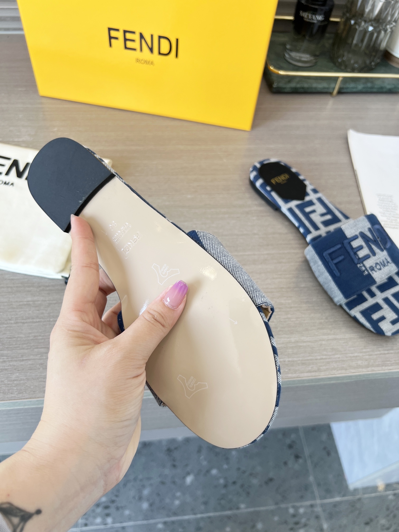 这款鞋子是AAAAA 1:1 质量 (非常棒). 使用了和原版一模一样的材料. 商标部分也保持了和芬迪/Fendi一样. 图片拍摄是实物鞋子拍摄, 您所收到的实物保证和我们图片一模一样.