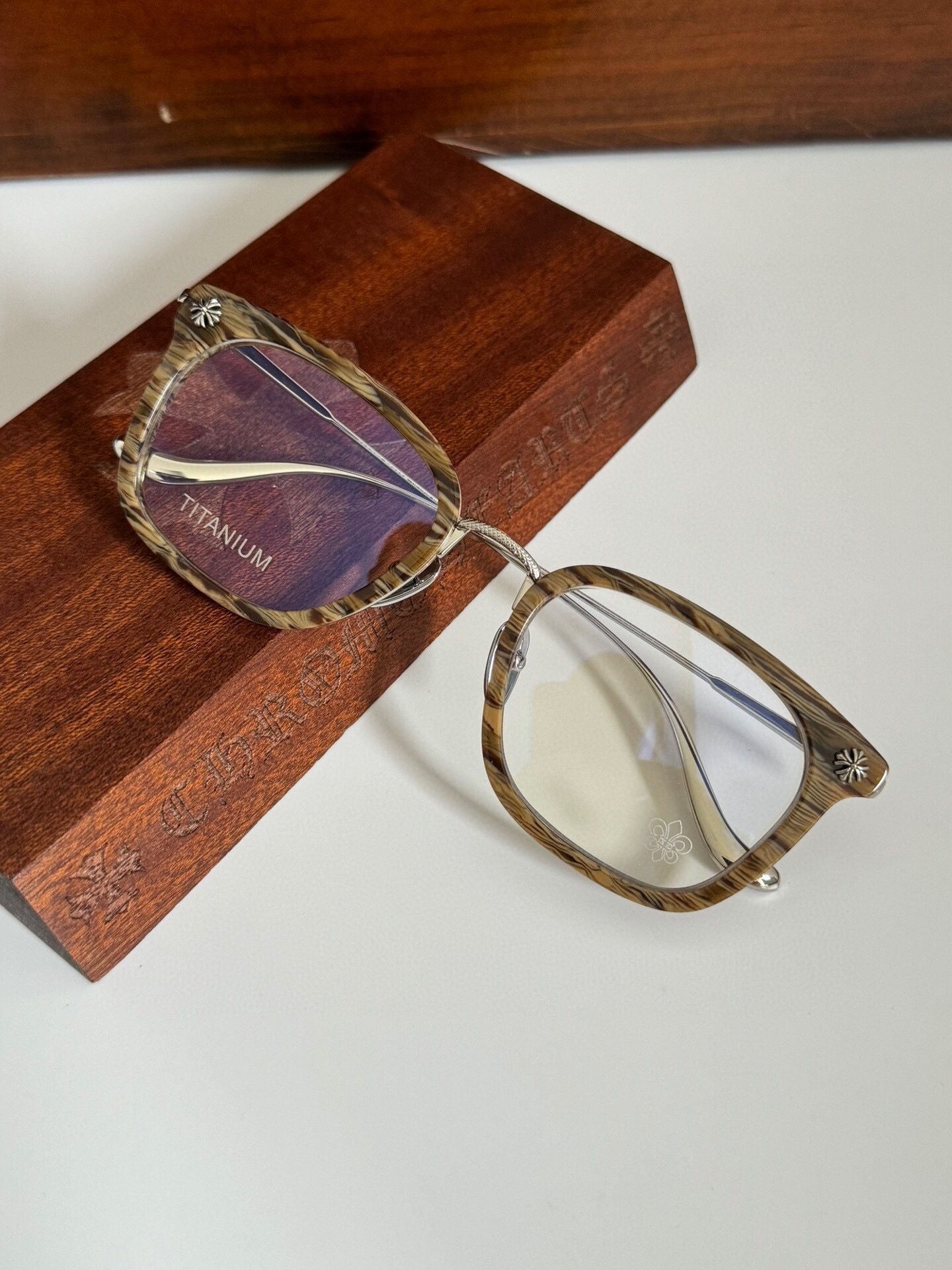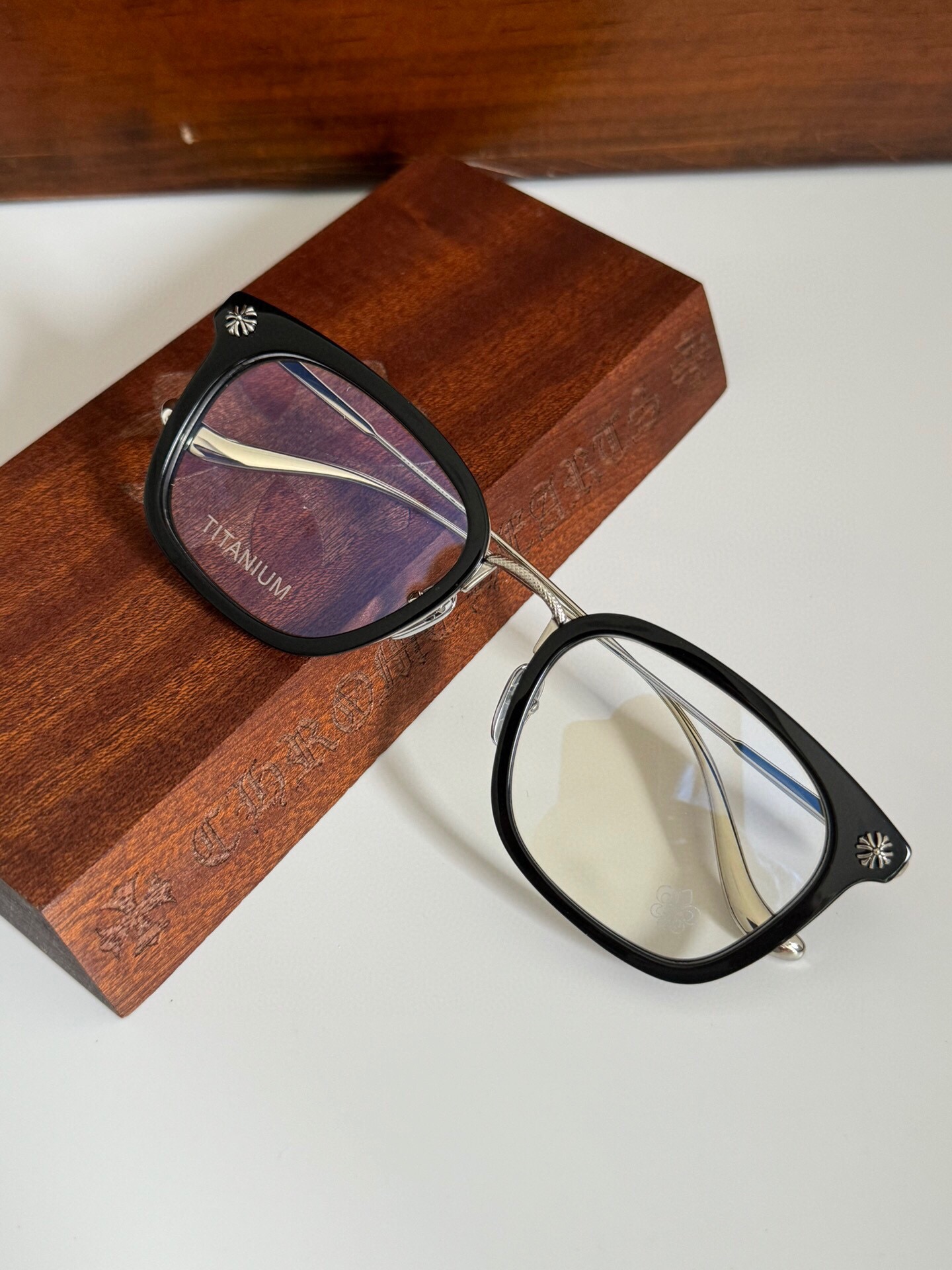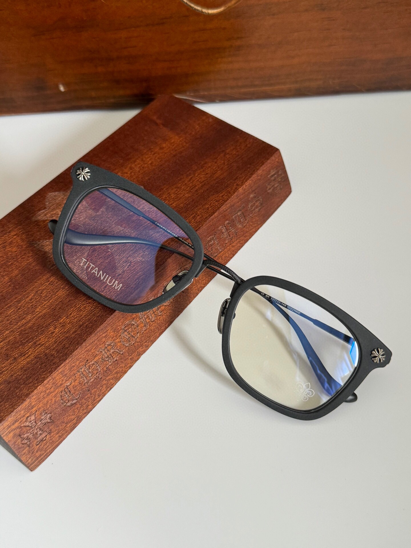 这款太阳眼镜是AAAAA 1:1 质量 (非常棒). 使用了和原版一模一样的材料. 商标部分也保持了和克罗心/Chrome Hearts一样. 图片拍摄是实物太阳眼镜拍摄, 您所收到的实物保证和我们图片一模一样.